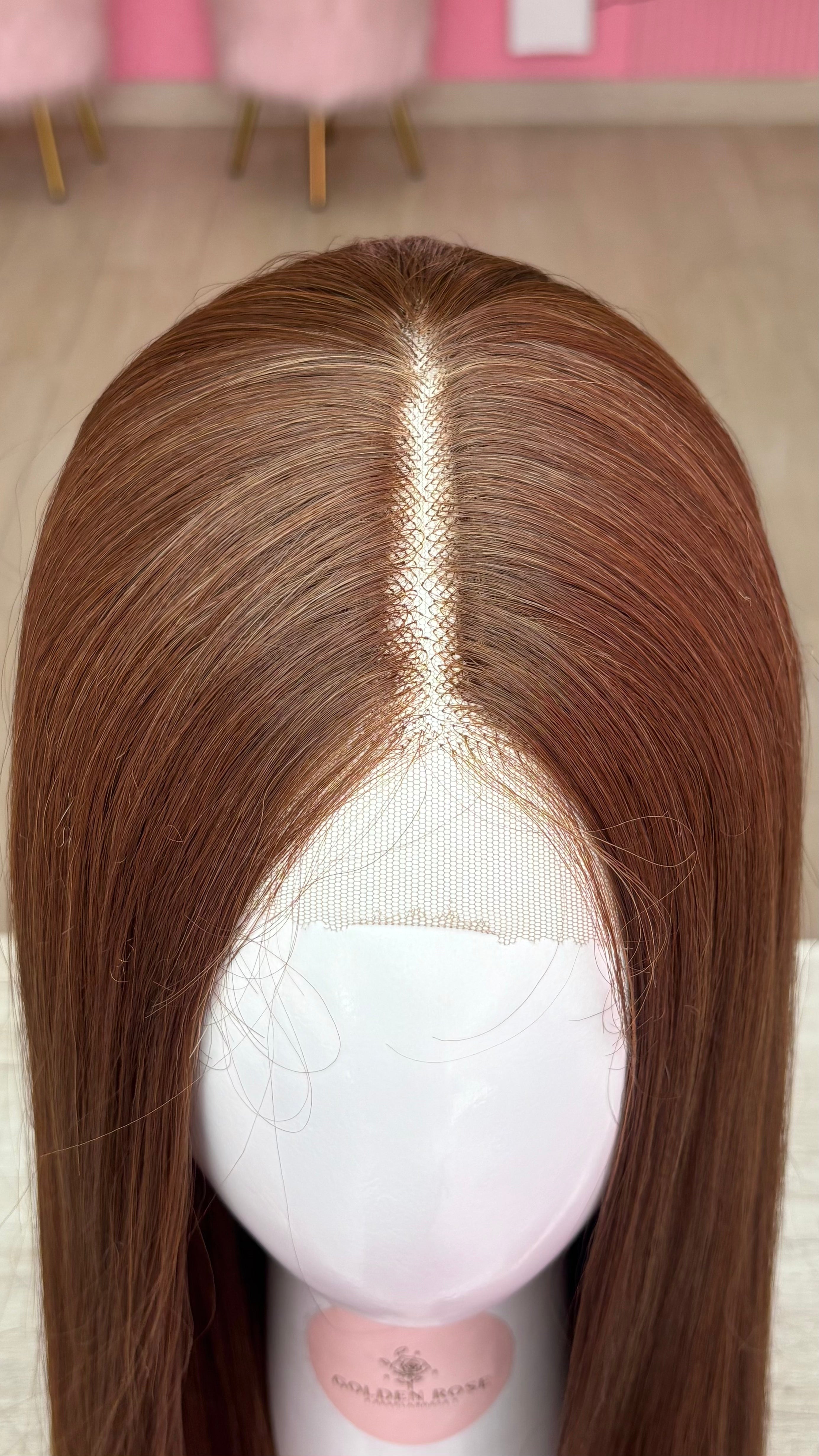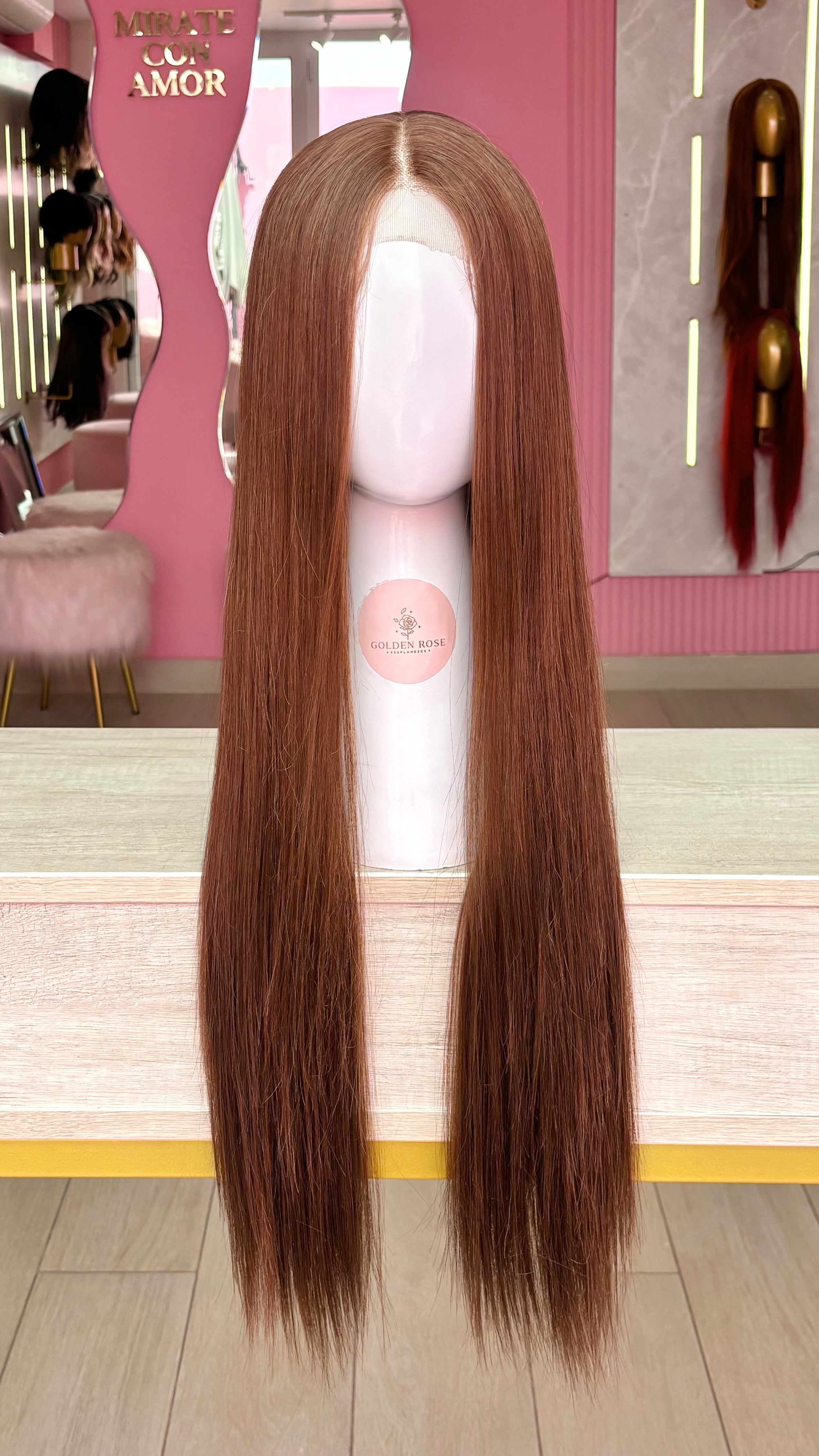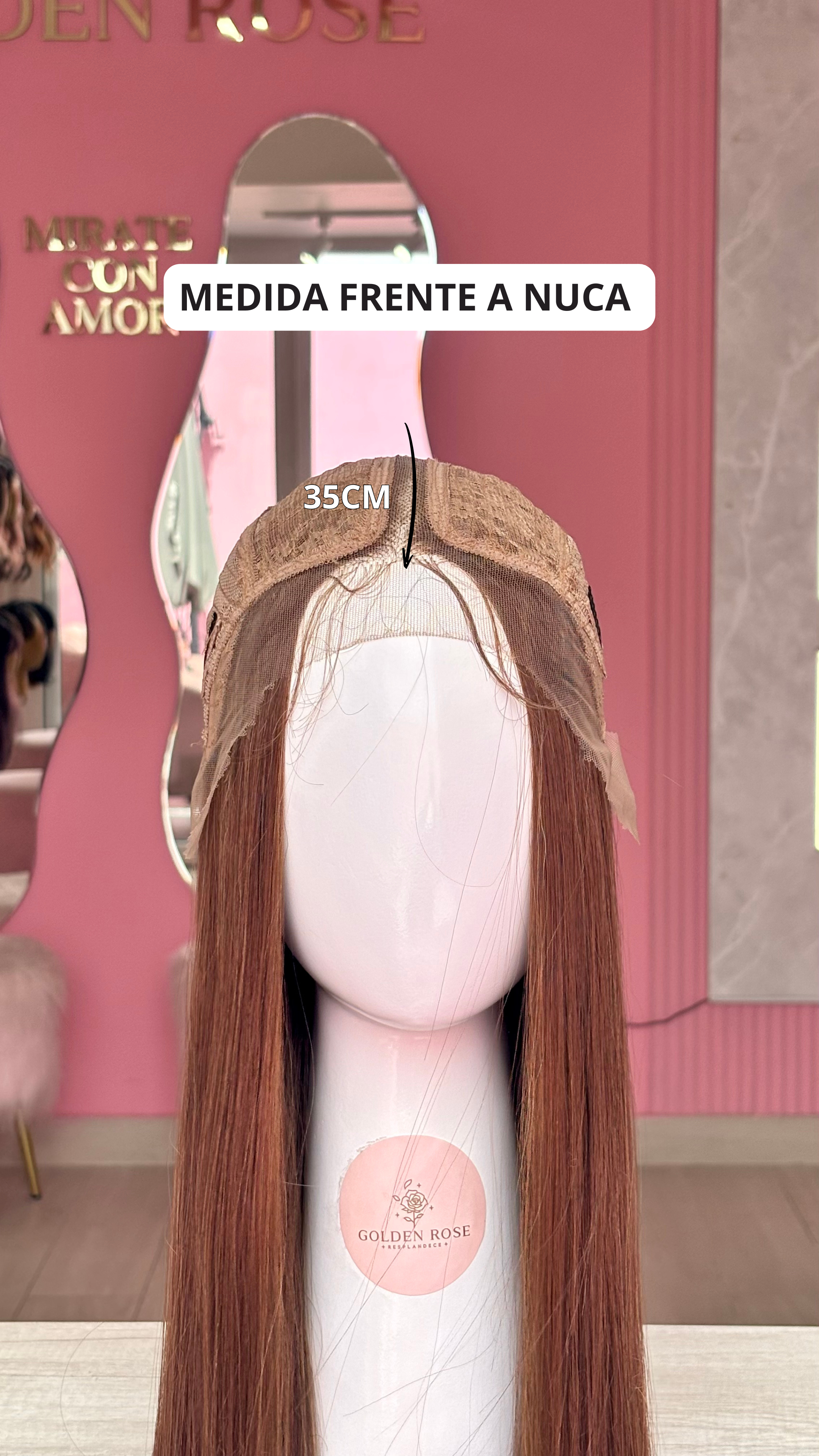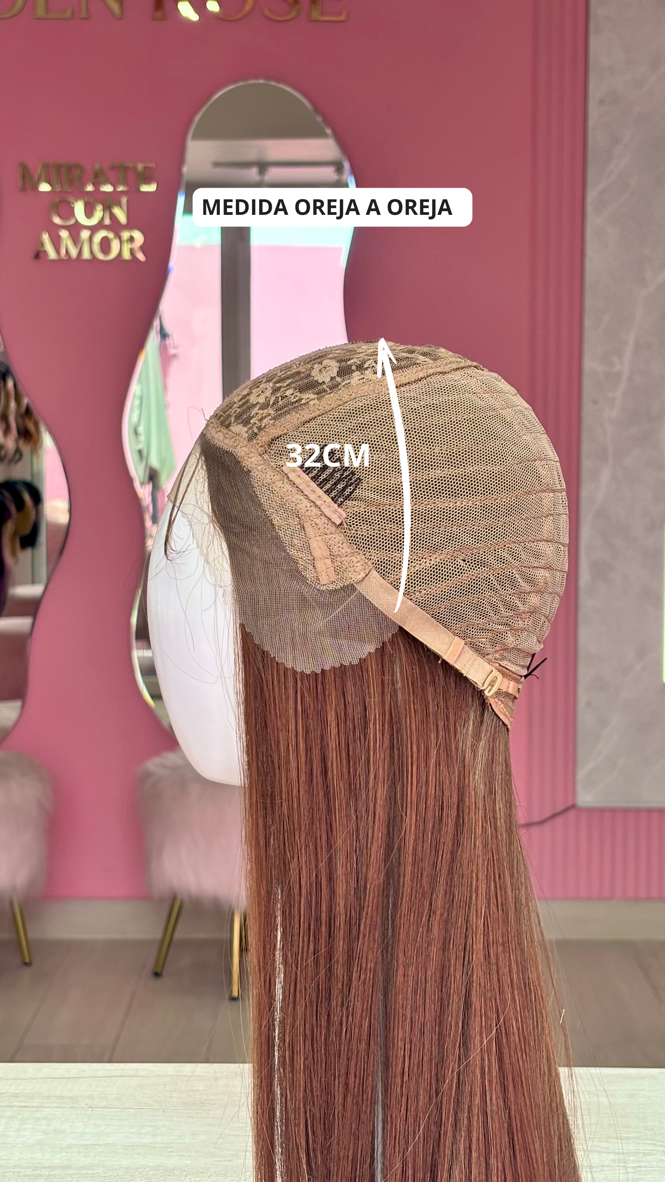 La peluca Aline es un producto de nuestra línea "Golden" con gorro de costura lace front raíz fija. Este producto cuenta con un regulador de contorno para ajustar el tamaño de la peluca si la persona lo requiere, además de 3 peinetas internas para asegurar mejor el cabello (en caso se tenga). El cabello empleado para este postizo es del material modacrílico (un tipo de fibra acrílica). Esta fibra es resistente al agua y al calor, no tiene brillo como el cabello de muñeca, sino que se asemeja a un cabello natural. Asimismo, es suave y manejable, se puede alisar, ondular y lavar. Se recomienda su uso para ocasiones esporádicas con la finalidad de alargar su tiempo de vida.