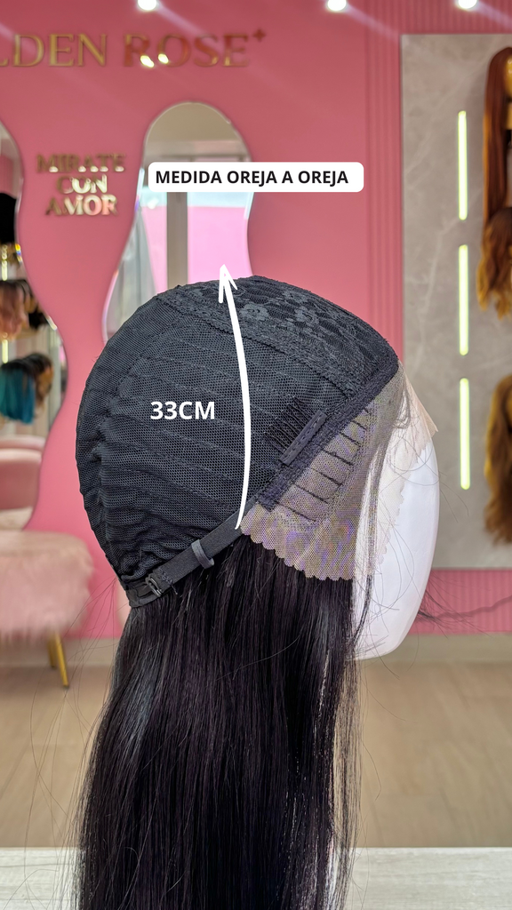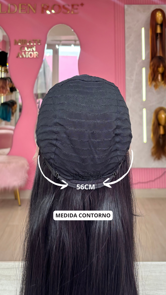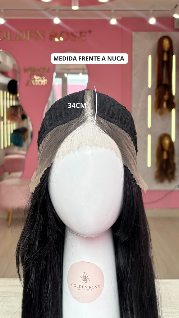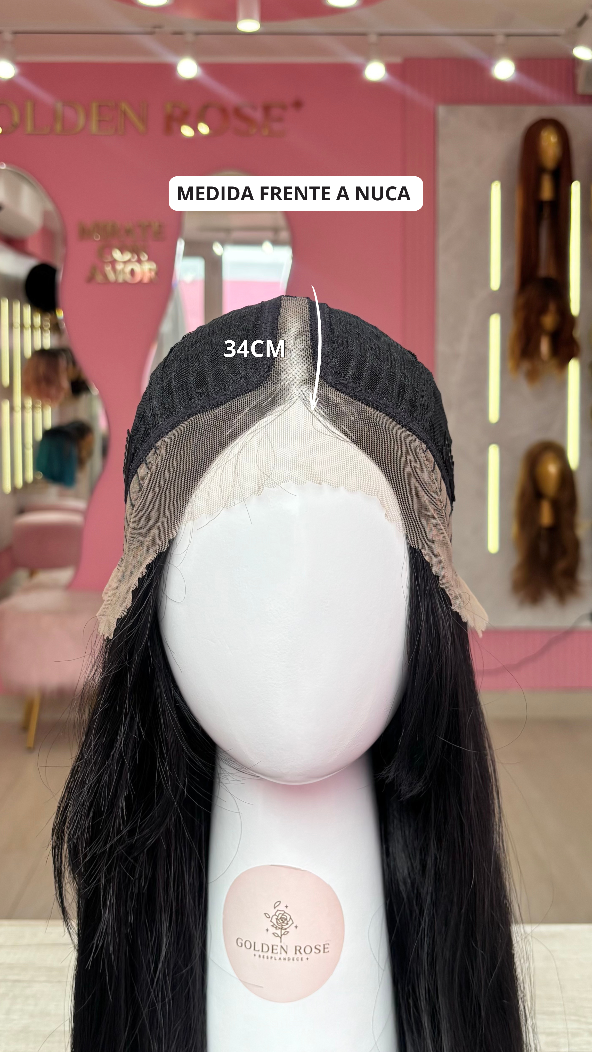 La peluca Celine es un producto de nuestra línea "Golden" con gorro de costura lace front raíz fija. Este producto cuenta con un regulador de contorno para ajustar el tamaño de la peluca si la persona lo requiere, además de 3 peinetas internas para asegurar mejor el cabello (en caso se tenga). El cabello empleado para este postizo es del material modacrílico (un tipo de fibra acrílica). Esta fibra es resistente al agua y al calor, no tiene brillo como el cabello de muñeca, sino que se asemeja a un cabello natural. Asimismo, es suave y manejable, se puede alisar, ondular y lavar. Se recomienda su uso para ocasiones esporádicas con la finalidad de alargar su tiempo de vida.
