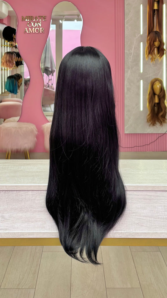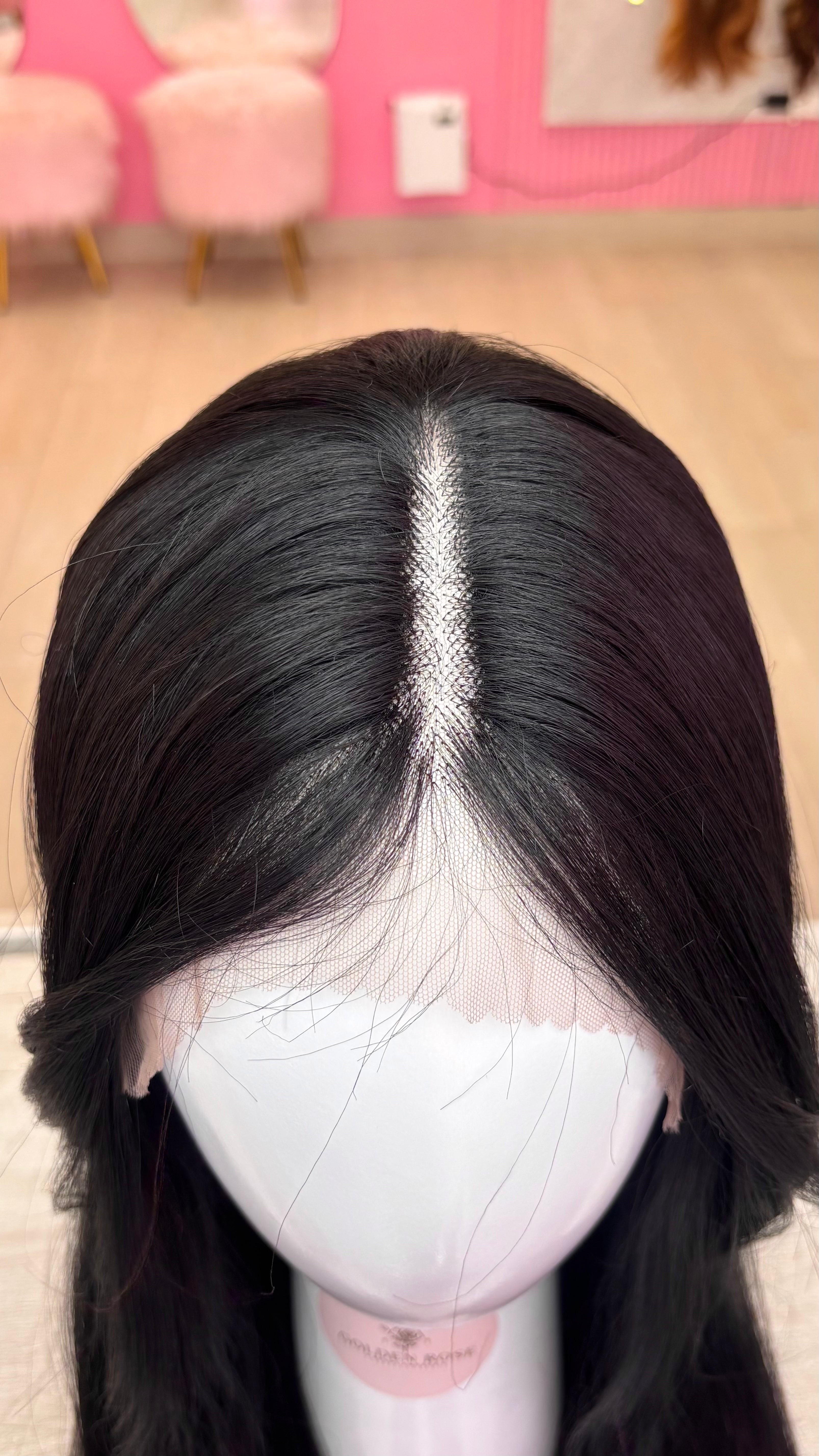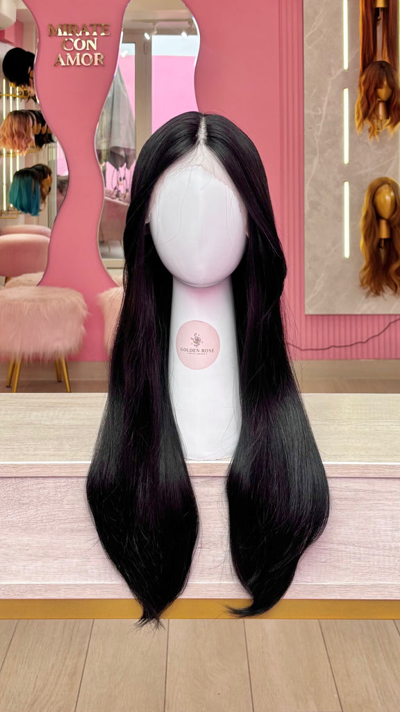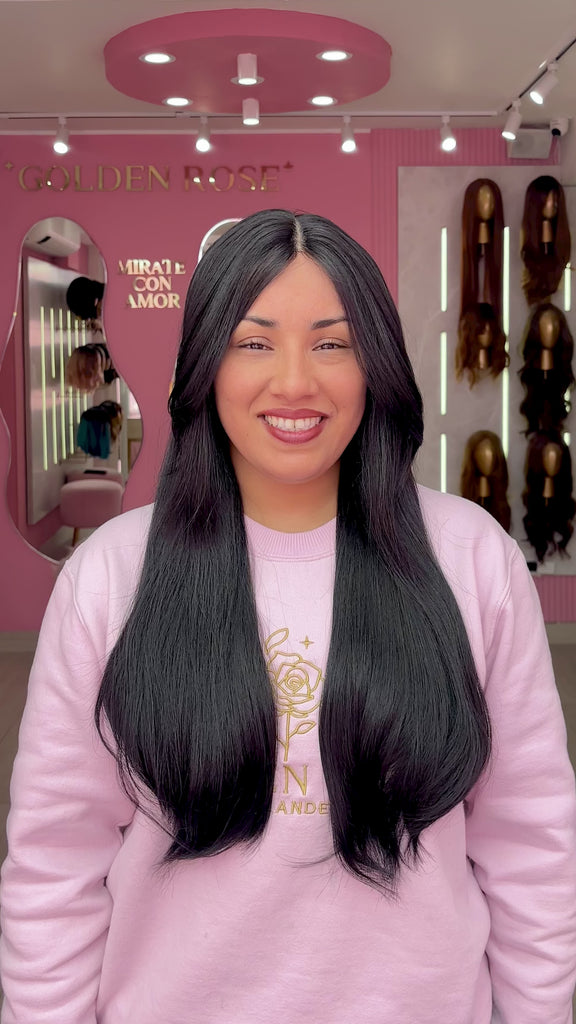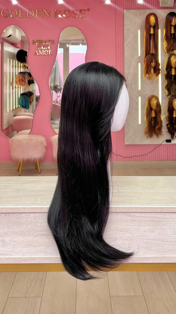 La peluca Celine es un producto de nuestra línea "Golden" con gorro de costura lace front raíz fija. Este producto cuenta con un regulador de contorno para ajustar el tamaño de la peluca si la persona lo requiere, además de 3 peinetas internas para asegurar mejor el cabello (en caso se tenga). El cabello empleado para este postizo es del material modacrílico (un tipo de fibra acrílica). Esta fibra es resistente al agua y al calor, no tiene brillo como el cabello de muñeca, sino que se asemeja a un cabello natural. Asimismo, es suave y manejable, se puede alisar, ondular y lavar. Se recomienda su uso para ocasiones esporádicas con la finalidad de alargar su tiempo de vida.