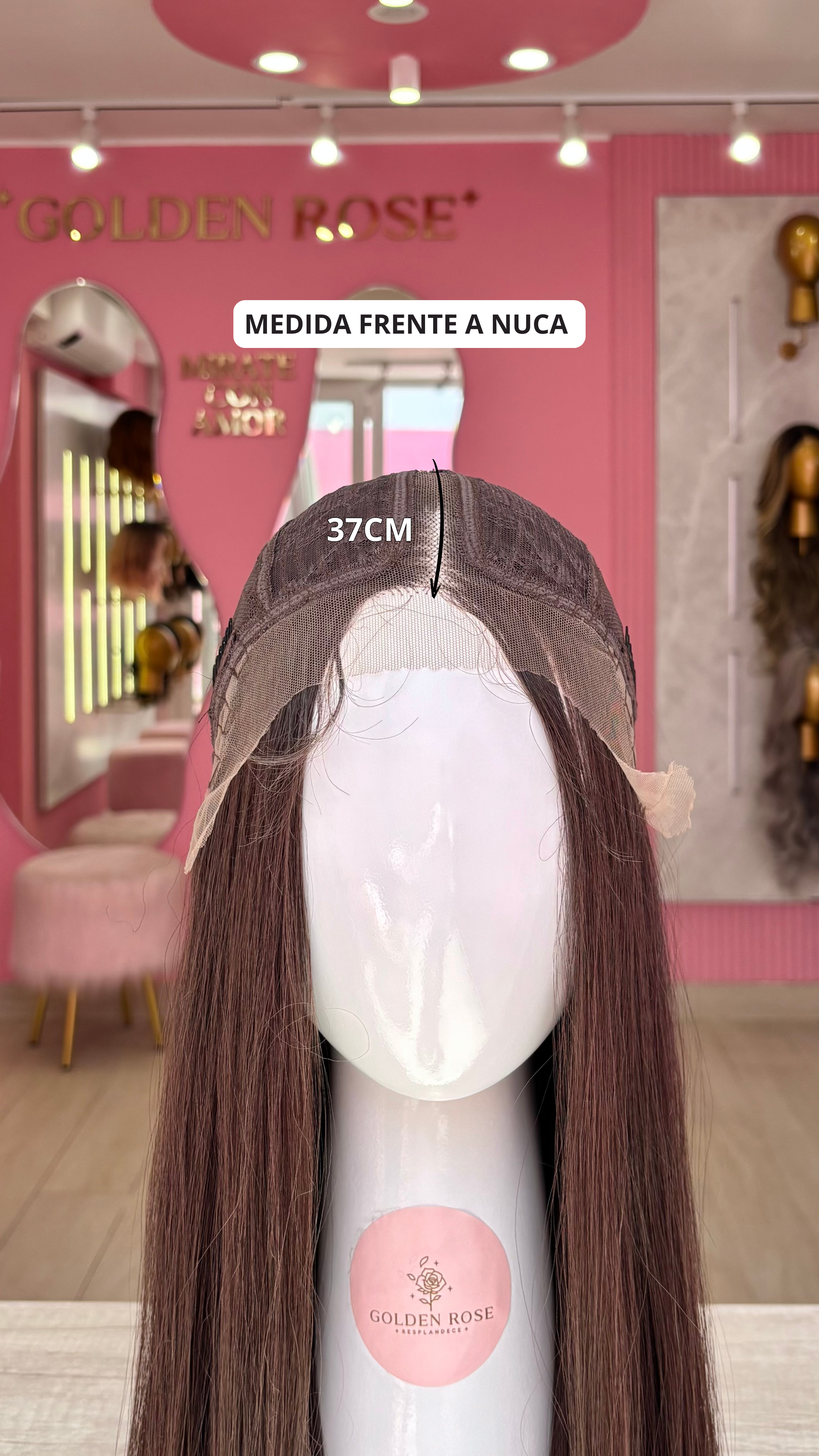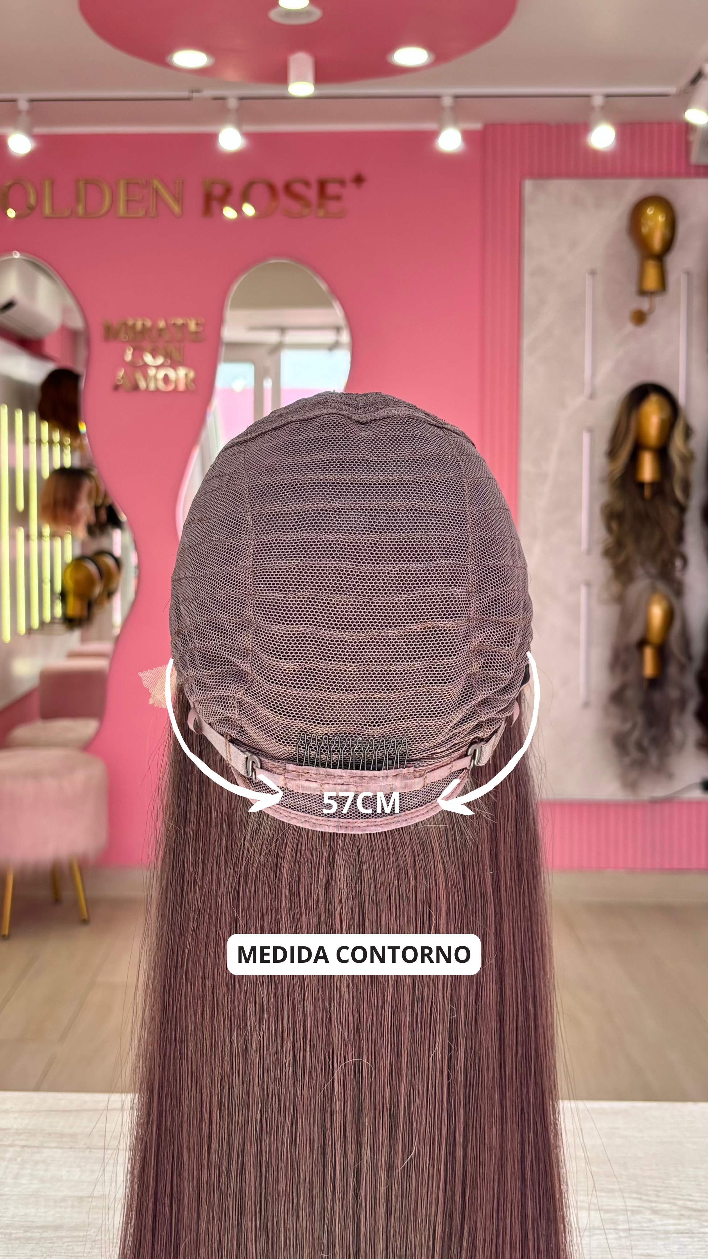 La peluca Miriam es un producto de nuestra línea "Golden" con gorro de costura lace front raíz fija. Este producto cuenta con un regulador de contorno para ajustar el tamaño de la peluca si la persona lo requiere, además de 3 peinetas internas para asegurar mejor el cabello (en caso se tenga). El cabello empleado para este postizo es del material modacrílico (un tipo de fibra acrílica). Esta fibra es resistente al agua y al calor, no tiene brillo como el cabello de muñeca, sino que se asemeja a un cabello natural. Asimismo, es suave y manejable, se puede alisar, ondular y lavar. Se recomienda su uso para ocasiones esporádicas con la finalidad de alargar su tiempo de vida.