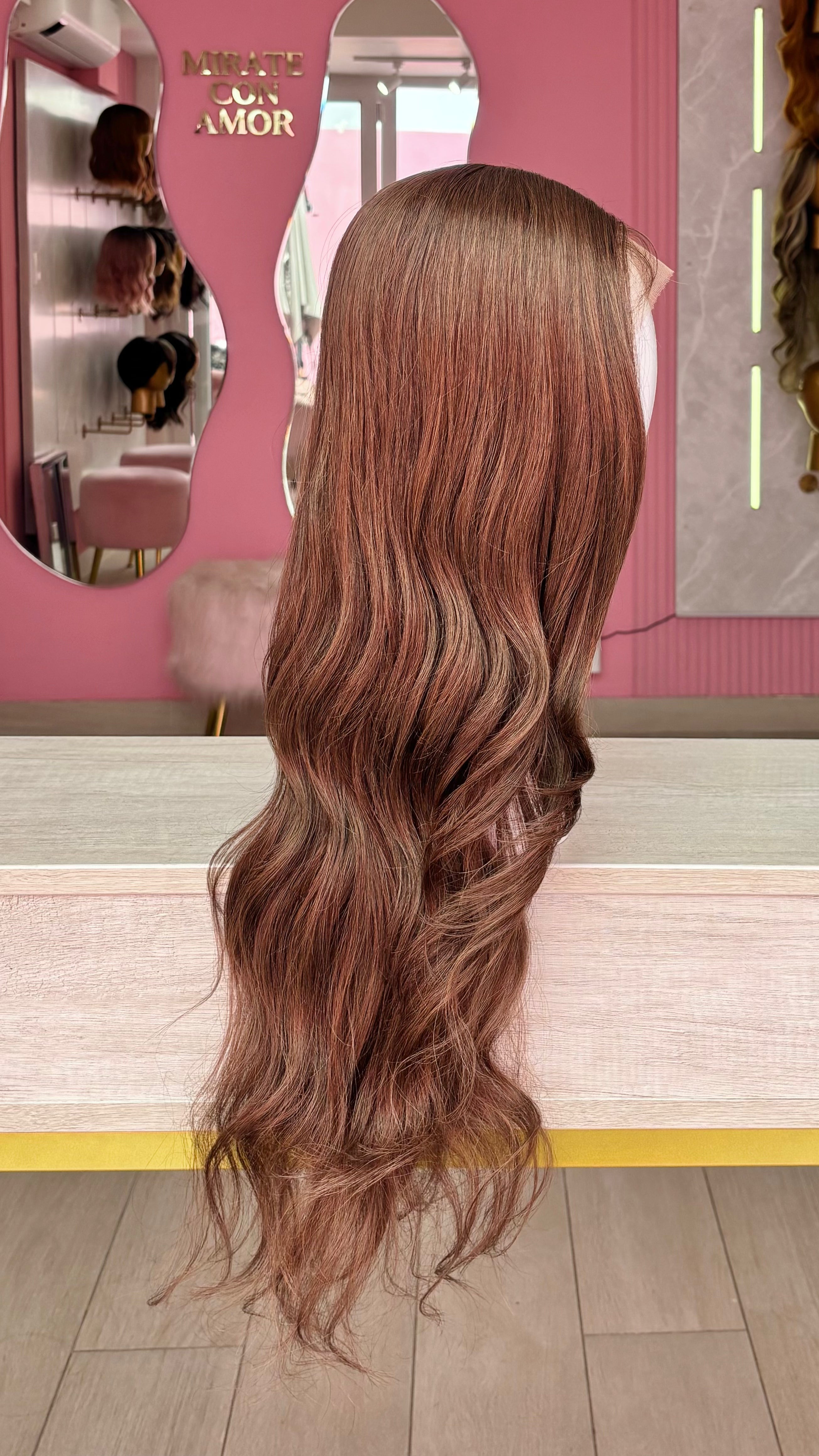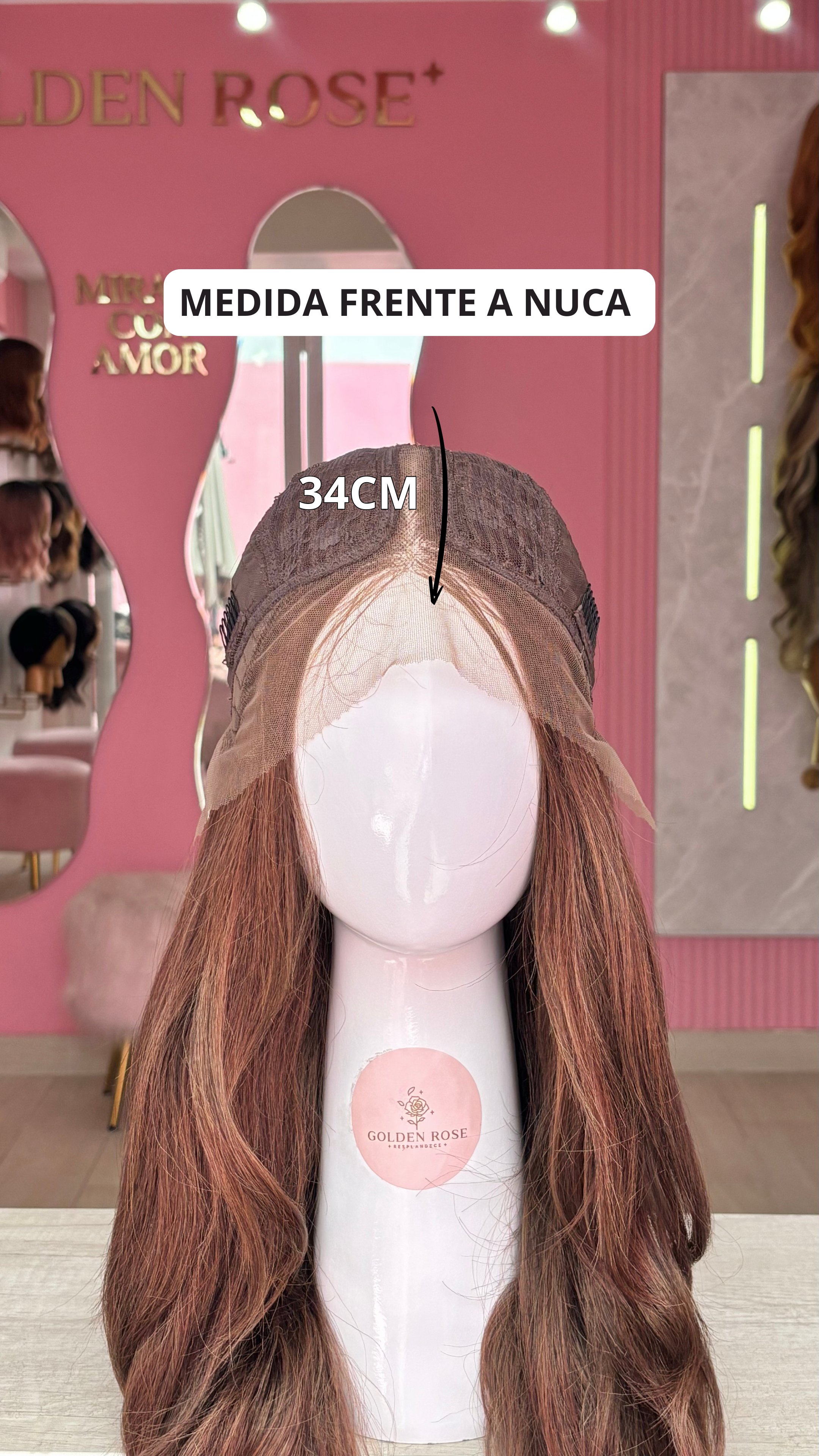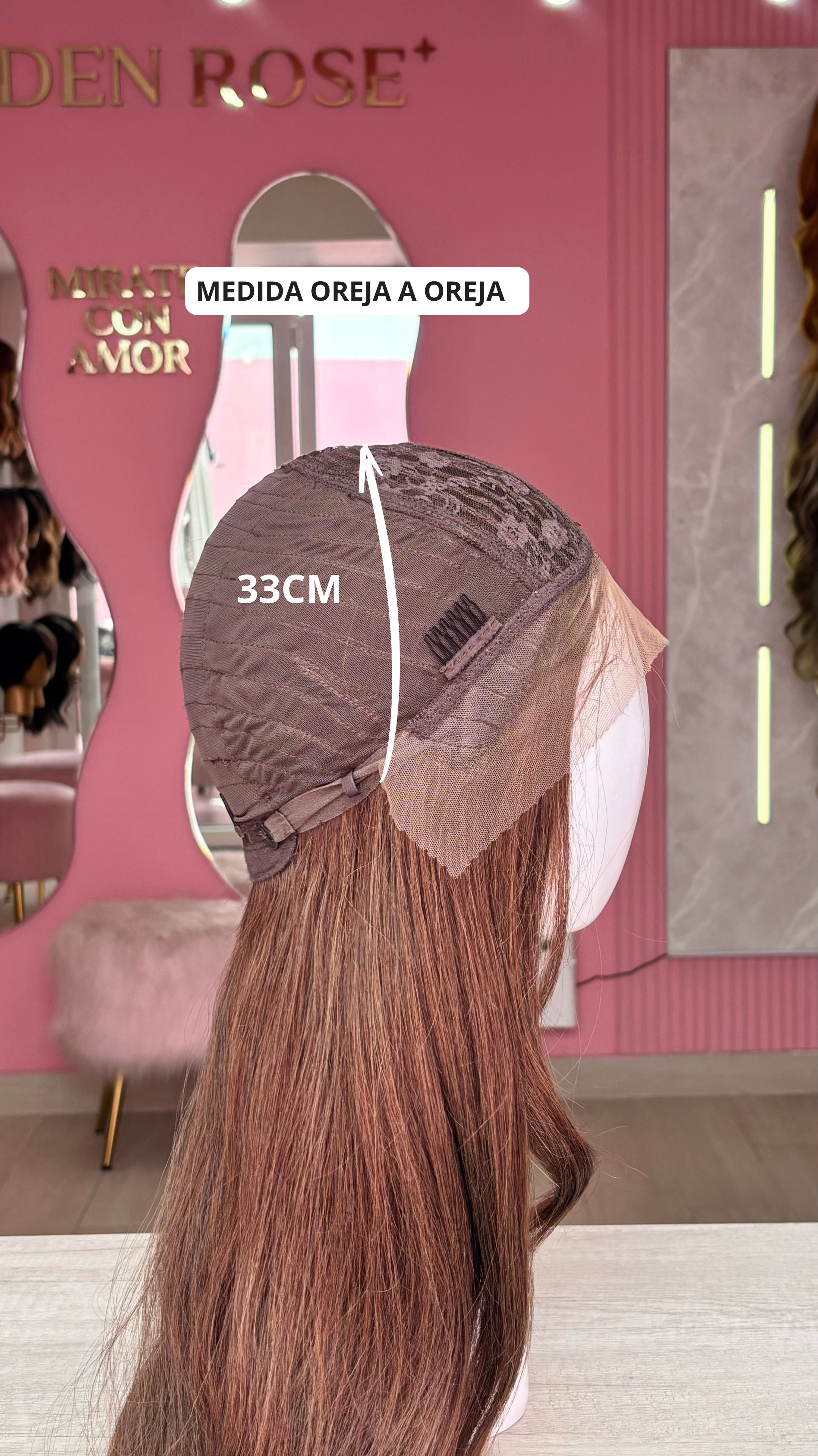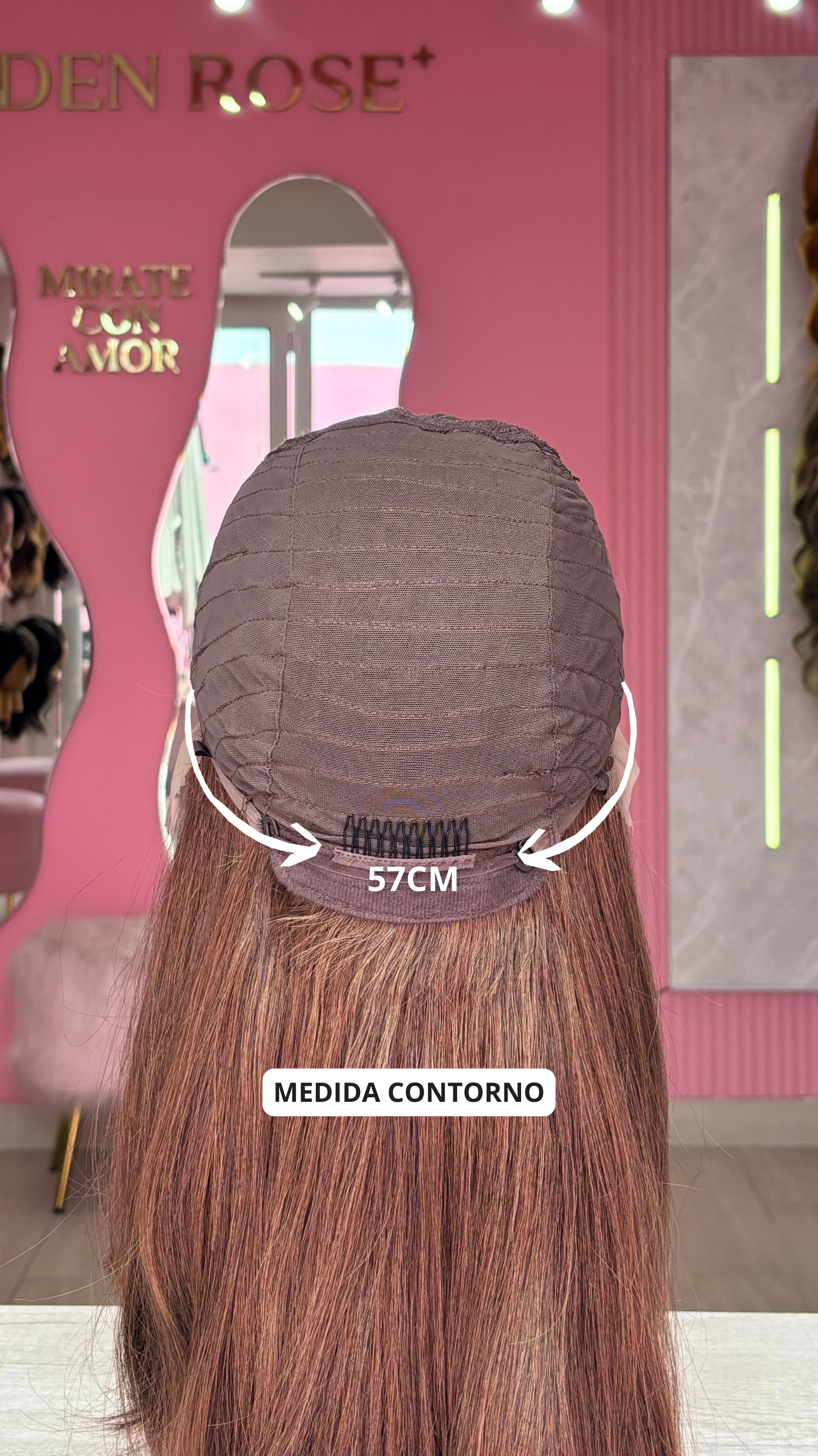 La peluca Vivian es un producto de nuestra línea "Golden" con gorro de costura lace front raíz fija. Este producto cuenta con un regulador de contorno para ajustar el tamaño de la peluca si la persona lo requiere, además de 3 peinetas internas para asegurar mejor el cabello (en caso se tenga). El cabello empleado para este postizo es del material modacrílico (un tipo de fibra acrílica). Esta fibra es resistente al agua y al calor, no tiene brillo como el cabello de muñeca, sino que se asemeja a un cabello natural. Asimismo, es suave y manejable, se puede alisar, ondular y lavar. Se recomienda su uso para ocasiones esporádicas con la finalidad de alargar su tiempo de vida.