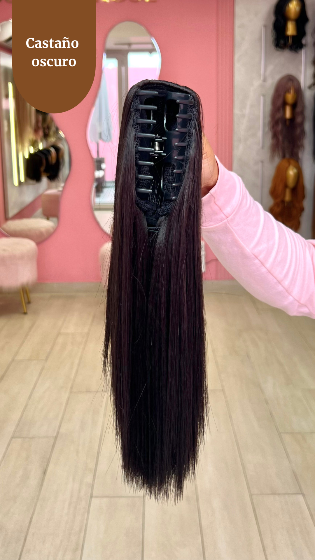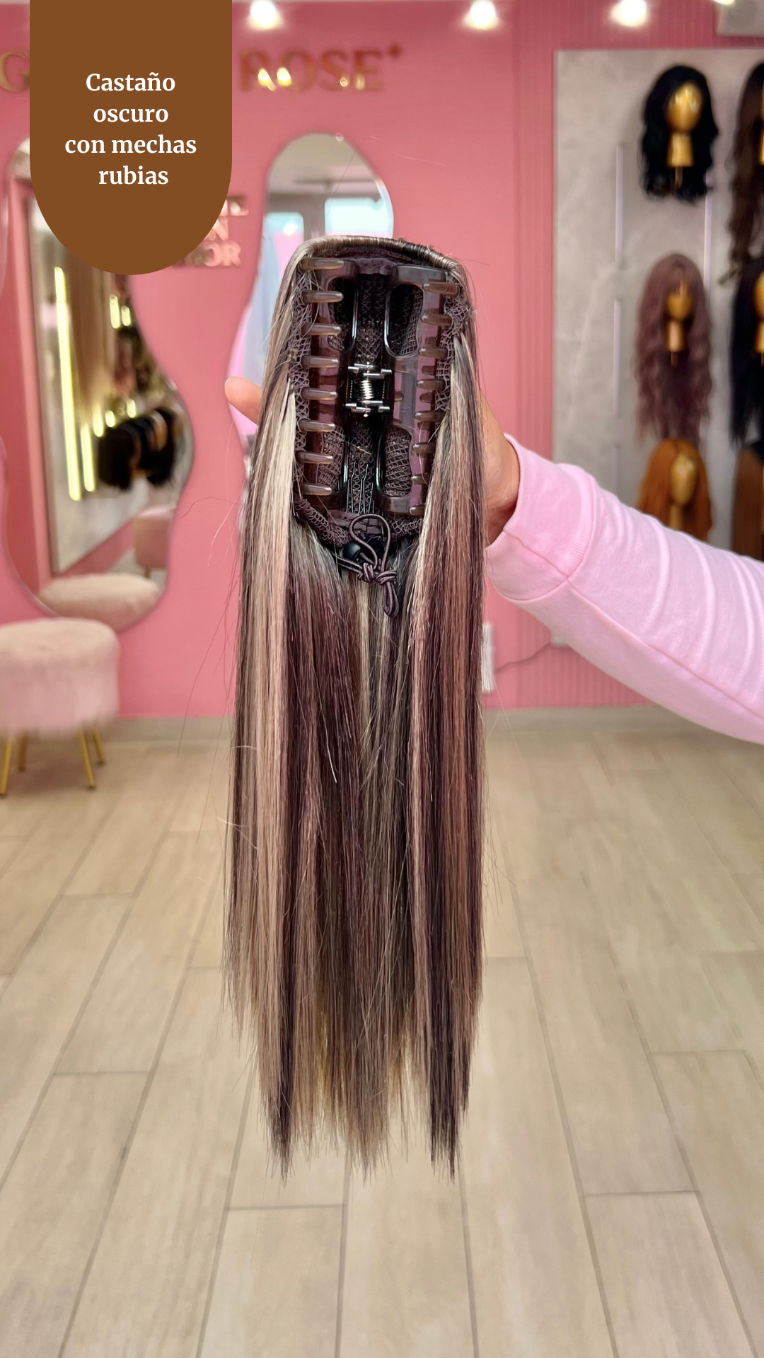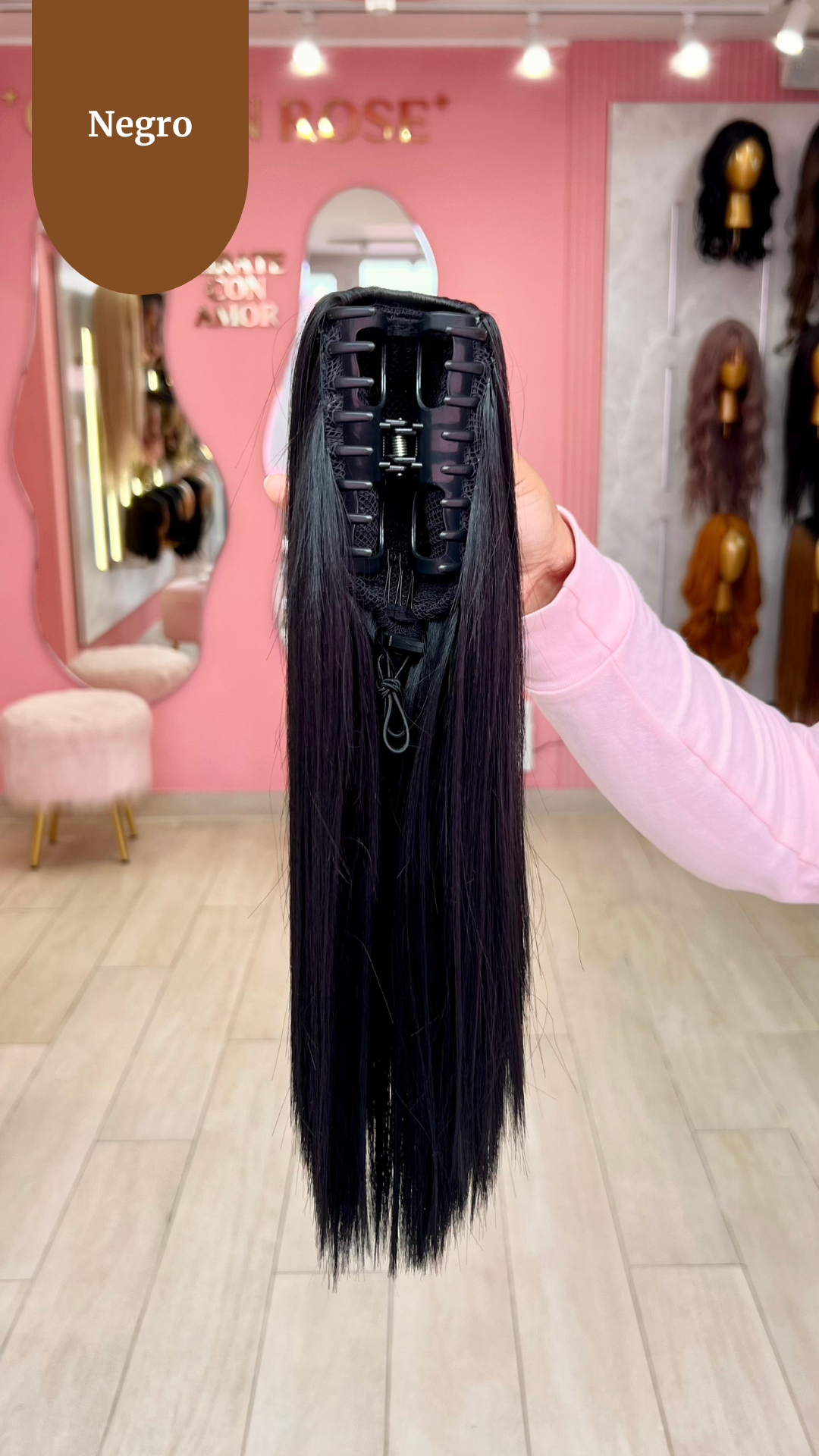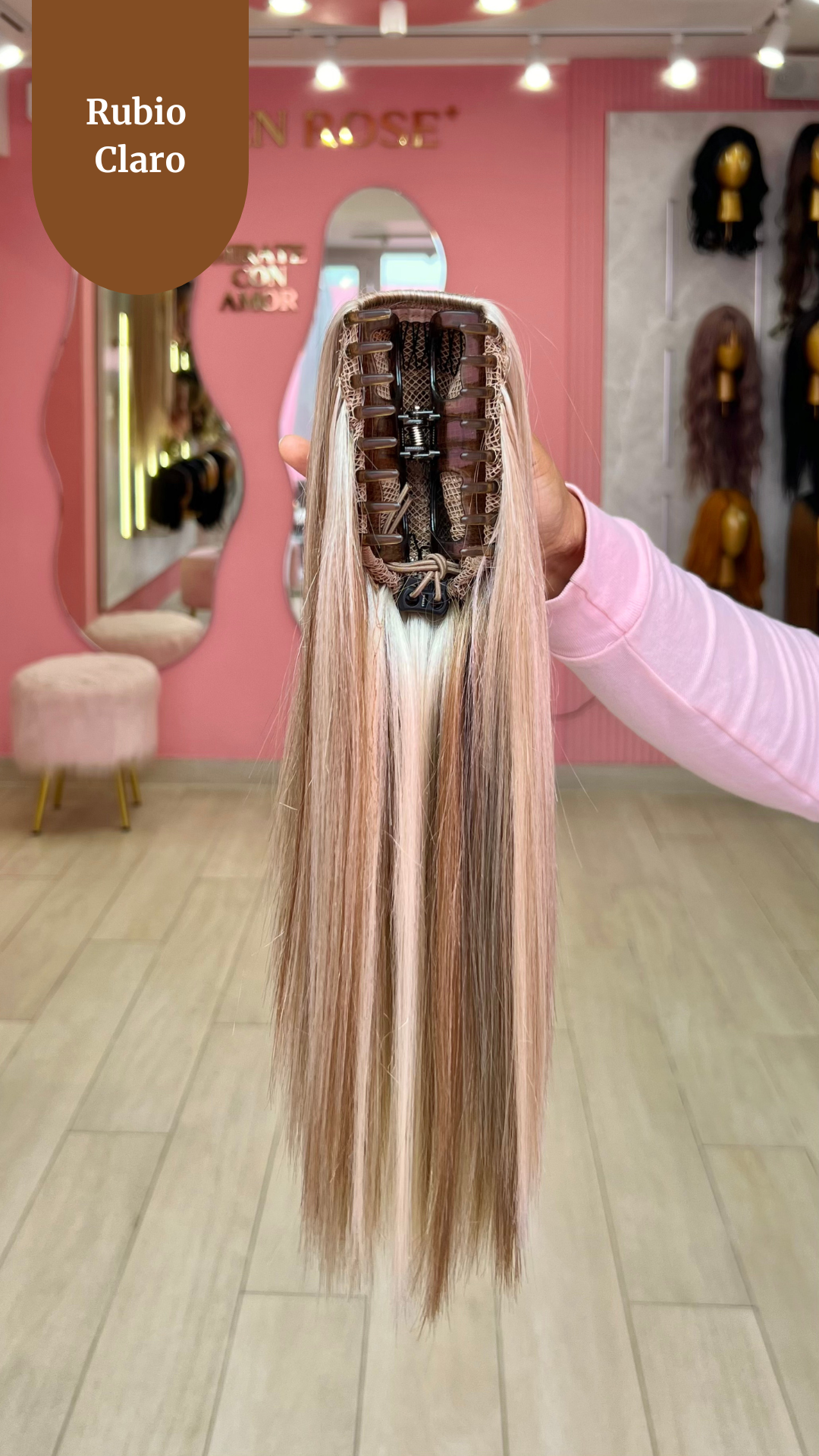 La extensión de cola Nicole un producto de nuestra línea "Golden". Este producto cuenta con un gancho que sirve para asegurarse mejor sobre el cabello. El cabello empleado para este postizo es del material modacrílico (un tipo de fibra acrílica). Esta fibra es resistente al agua y al calor, no tiene brillo como el cabello de muñeca sino que se asemeja a un cabello natural. Asimismo, es suave y manejable, se puede alisar, ondular y lavar. Se recomienda su uso para ocasiones esporádicas con la finalidad de alargar su tiempo de vida.