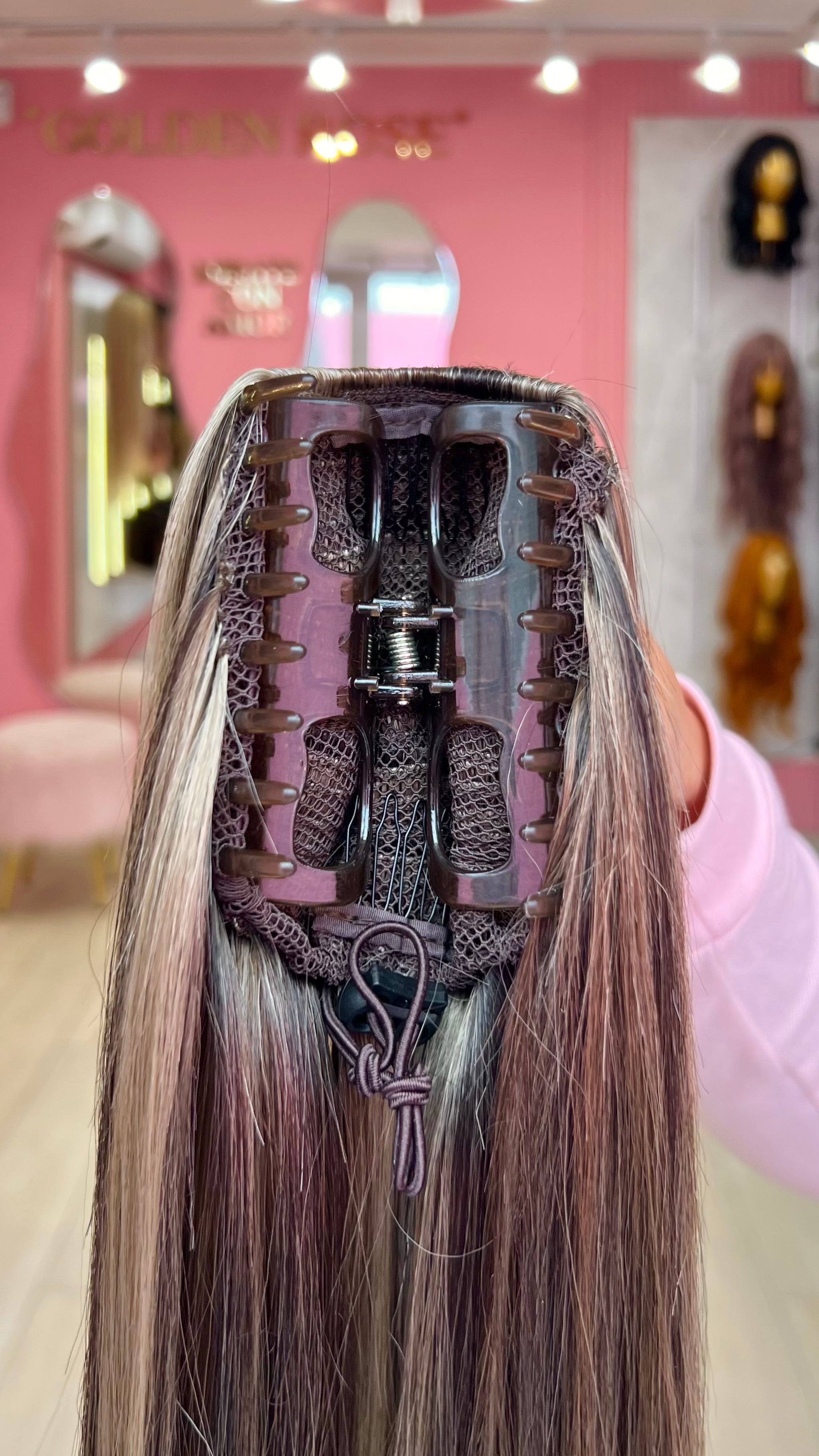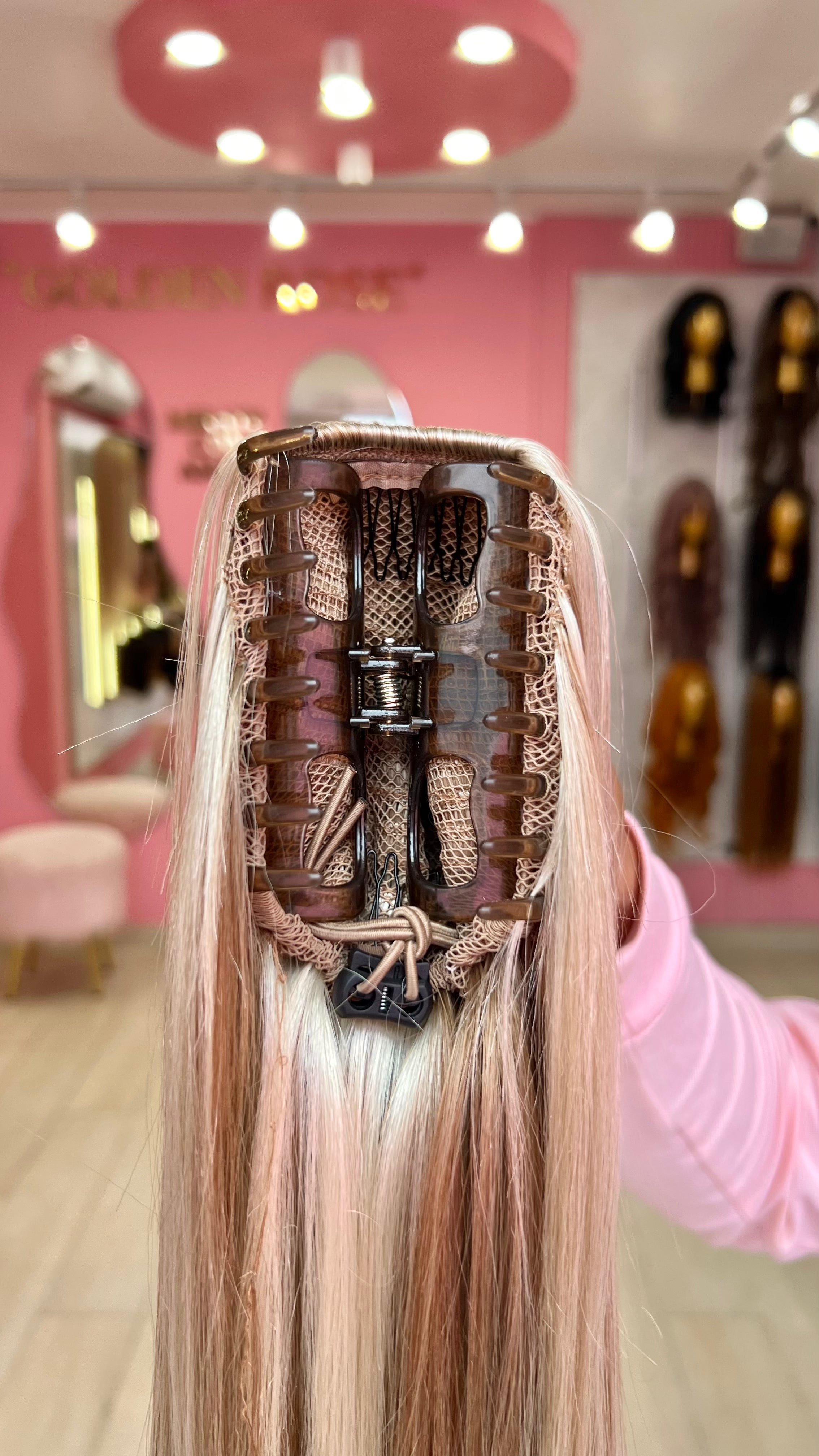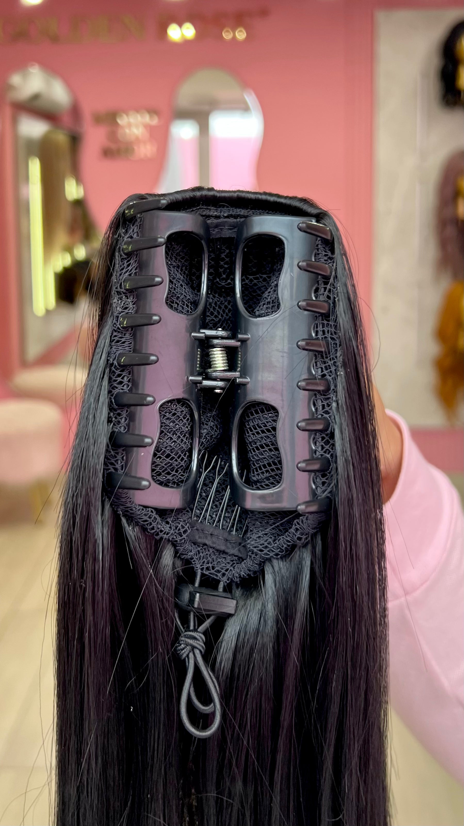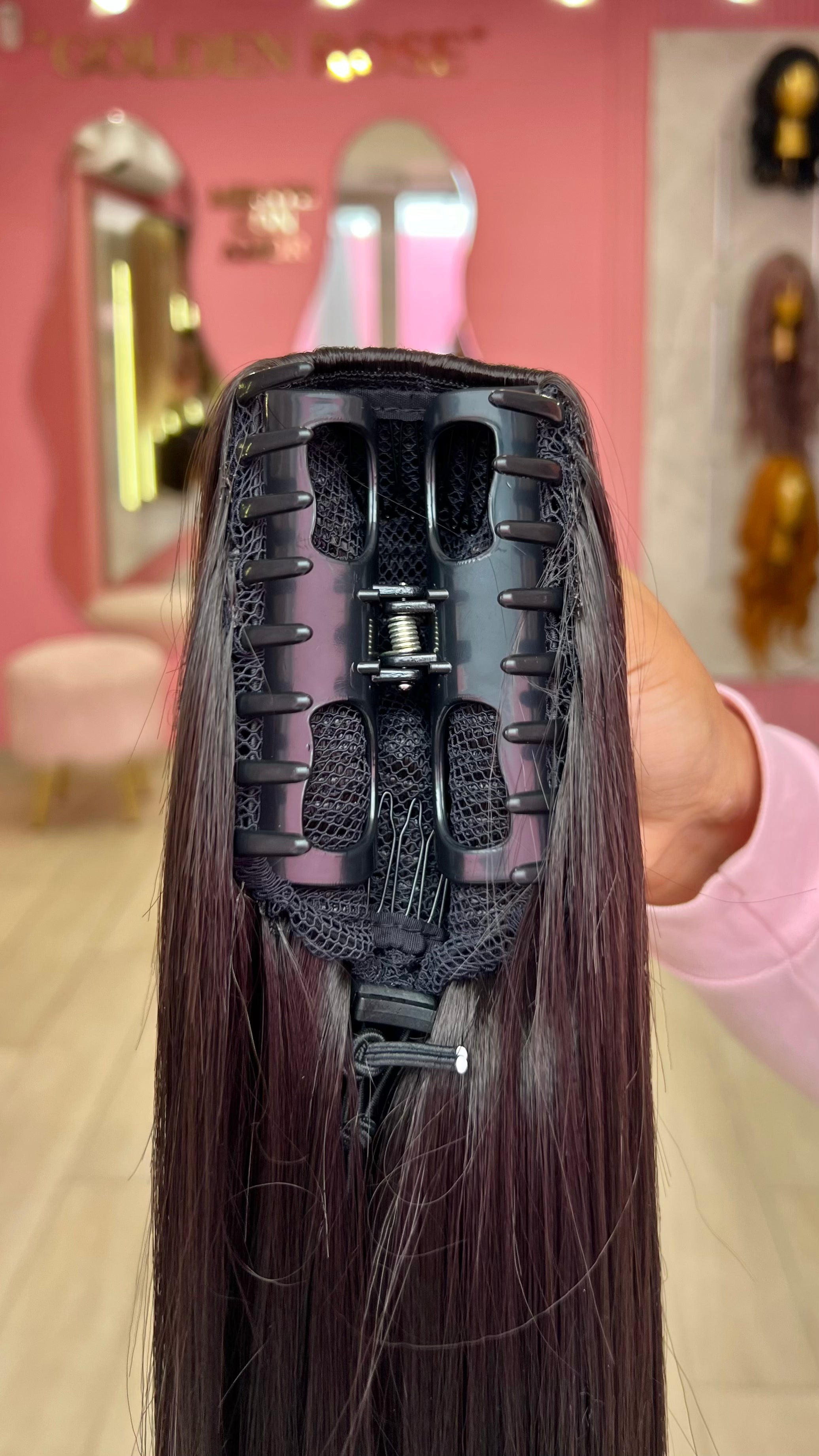 La extensión de cola Nicole un producto de nuestra línea "Golden". Este producto cuenta con un gancho que sirve para asegurarse mejor sobre el cabello. El cabello empleado para este postizo es del material modacrílico (un tipo de fibra acrílica). Esta fibra es resistente al agua y al calor, no tiene brillo como el cabello de muñeca sino que se asemeja a un cabello natural. Asimismo, es suave y manejable, se puede alisar, ondular y lavar. Se recomienda su uso para ocasiones esporádicas con la finalidad de alargar su tiempo de vida.