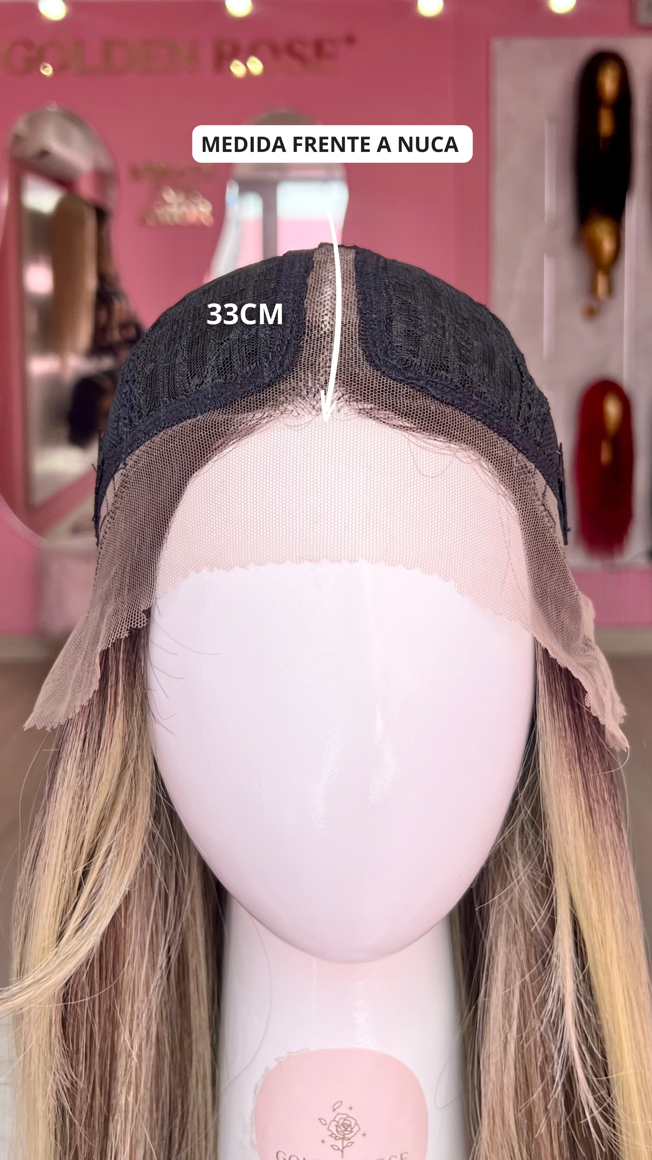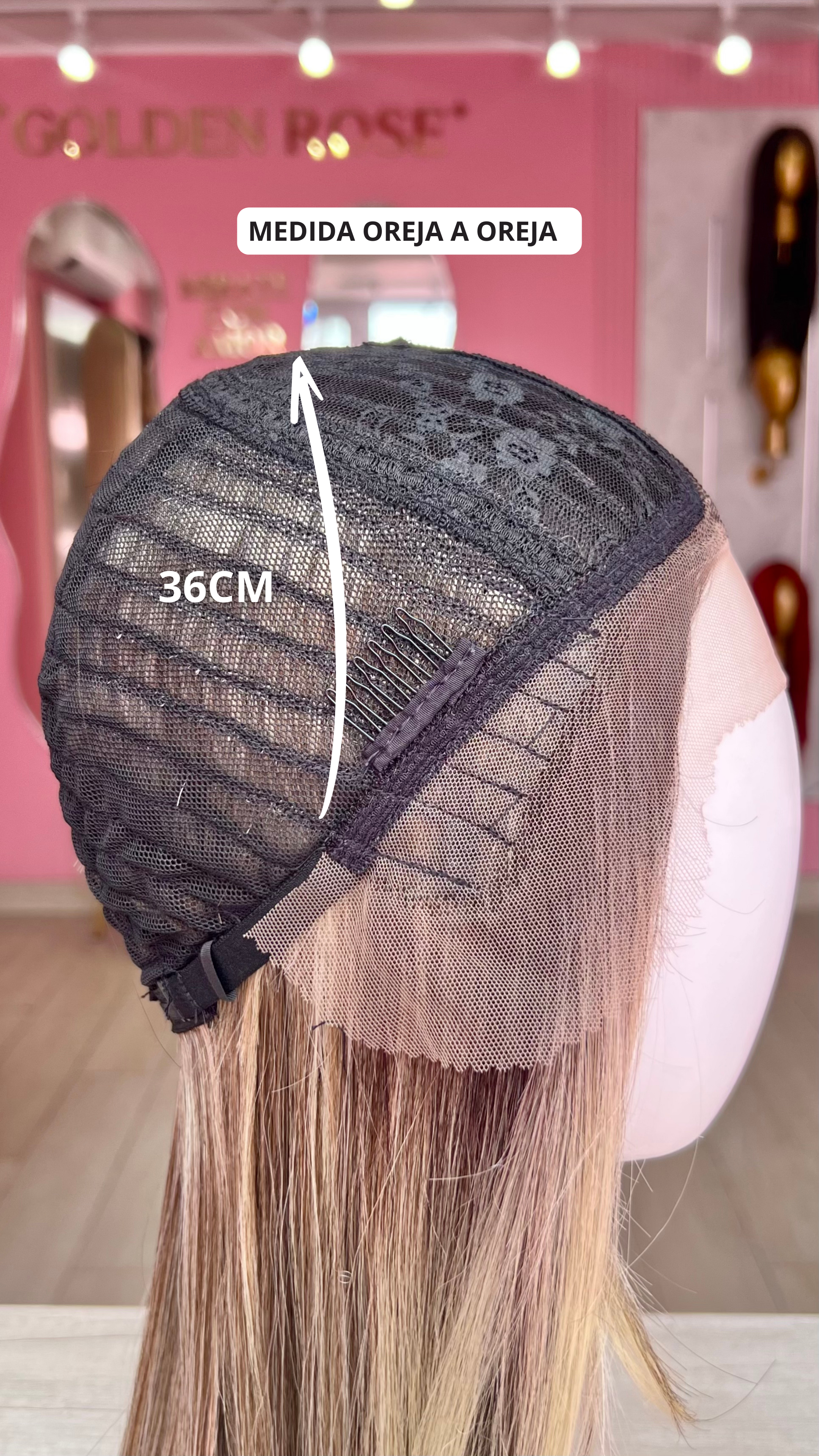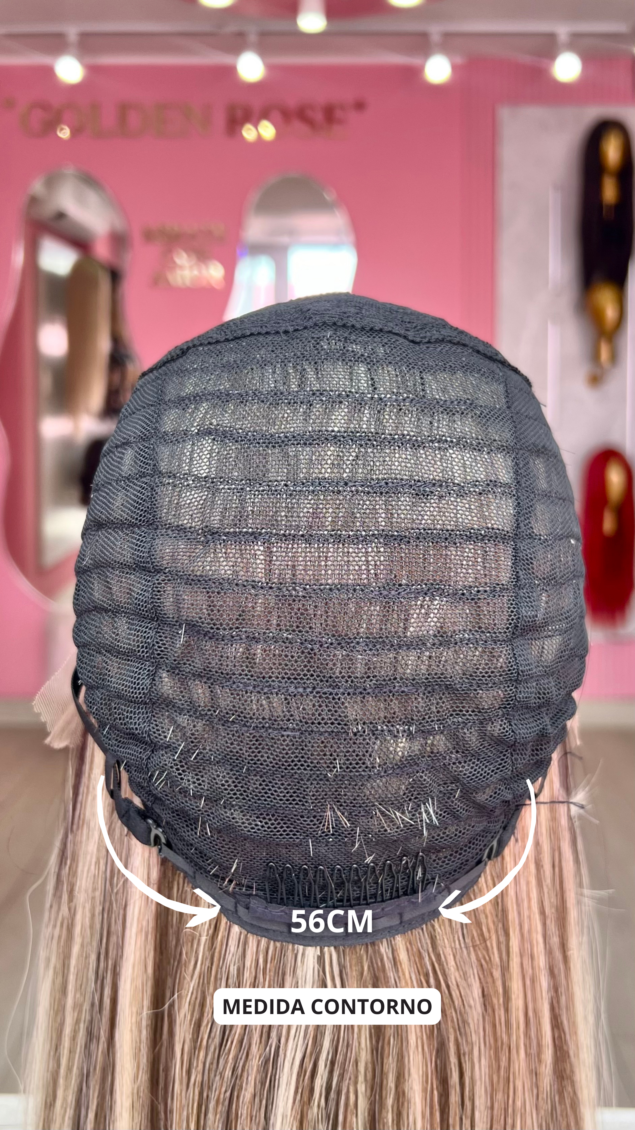 La peluca Celine es un producto de nuestra línea "Golden" con gorro de costura lace front raíz fija. Este producto cuenta con un regulador de contorno para ajustar el tamaño de la peluca si la persona lo requiere, además de 3 peinetas internas para asegurar mejor el cabello (en caso se tenga). El cabello empleado para este postizo es del material modacrílico (un tipo de fibra acrílica). Esta fibra es resistente al agua y al calor, no tiene brillo como el cabello de muñeca, sino que se asemeja a un cabello natural. Asimismo, es suave y manejable, se puede alisar, ondular y lavar. Se recomienda su uso para ocasiones esporádicas con la finalidad de alargar su tiempo de vida.