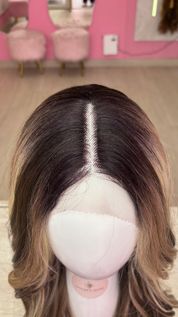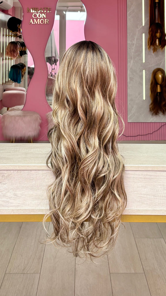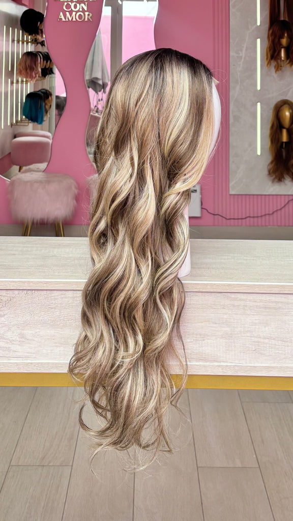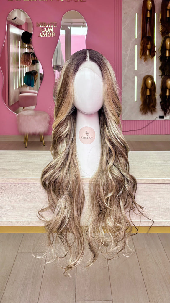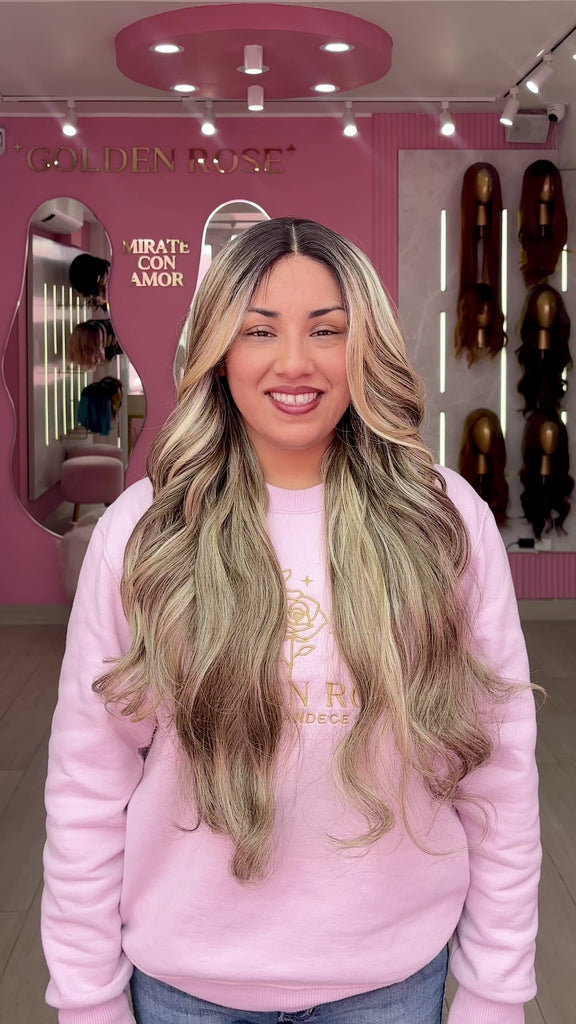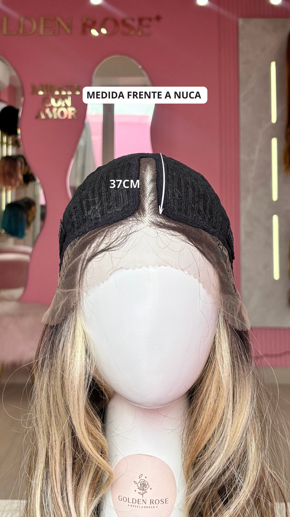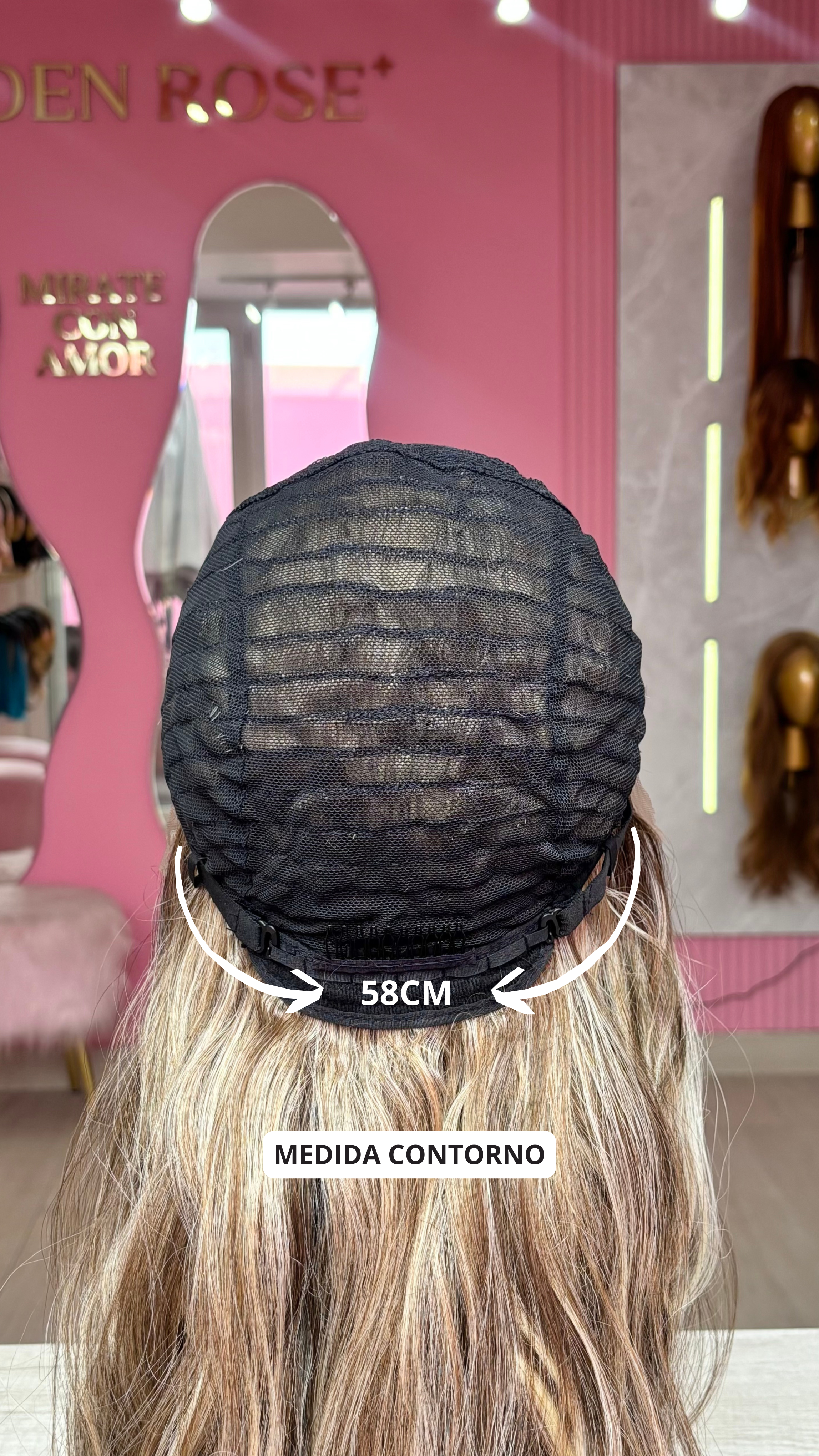 La peluca Dalia es un producto de nuestra línea "Golden" con gorro de costura lace front raíz fija. Este producto cuenta con un regulador de contorno para ajustar el tamaño de la peluca si la persona lo requiere, además de 3 peinetas internas para asegurar mejor el cabello (en caso se tenga). El cabello empleado para este postizo es del material modacrílico (un tipo de fibra acrílica). Esta fibra es resistente al agua y al calor, no tiene brillo como el cabello de muñeca, sino que se asemeja a un cabello natural. Asimismo, es suave y manejable, se puede alisar, ondular y lavar. Se recomienda su uso para ocasiones esporádicas con la finalidad de alargar su tiempo de vida.