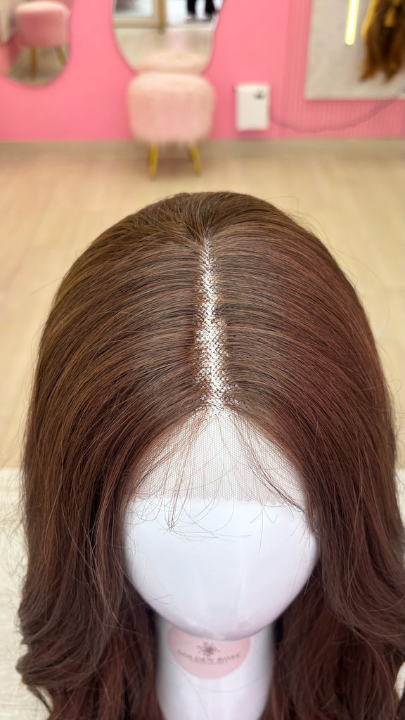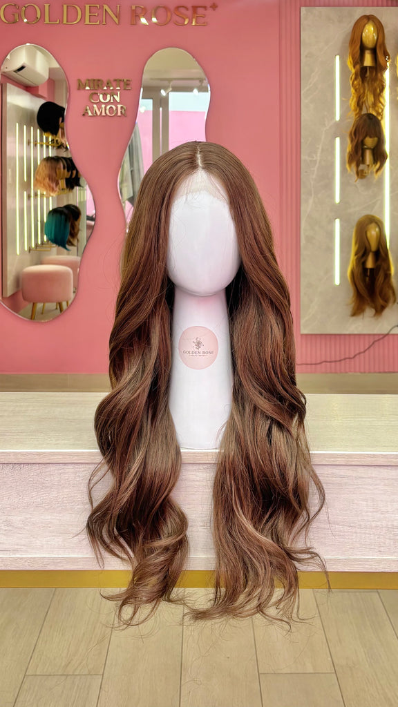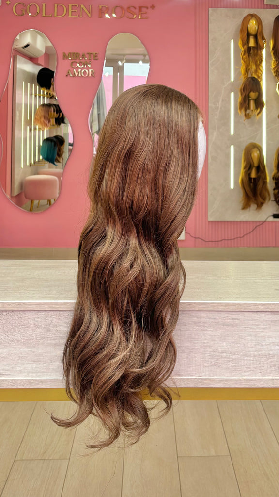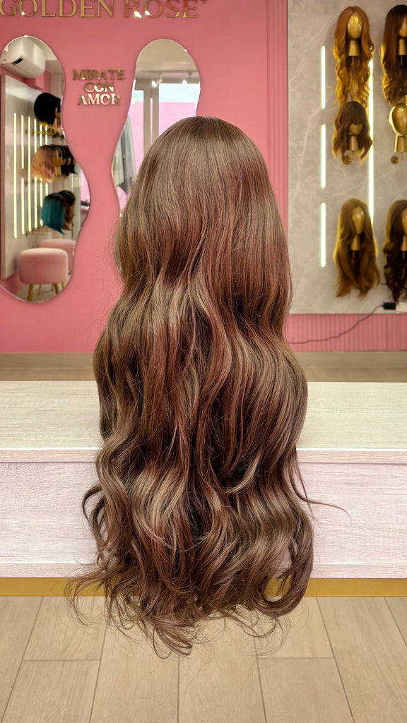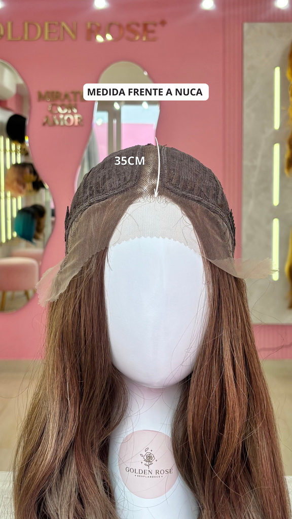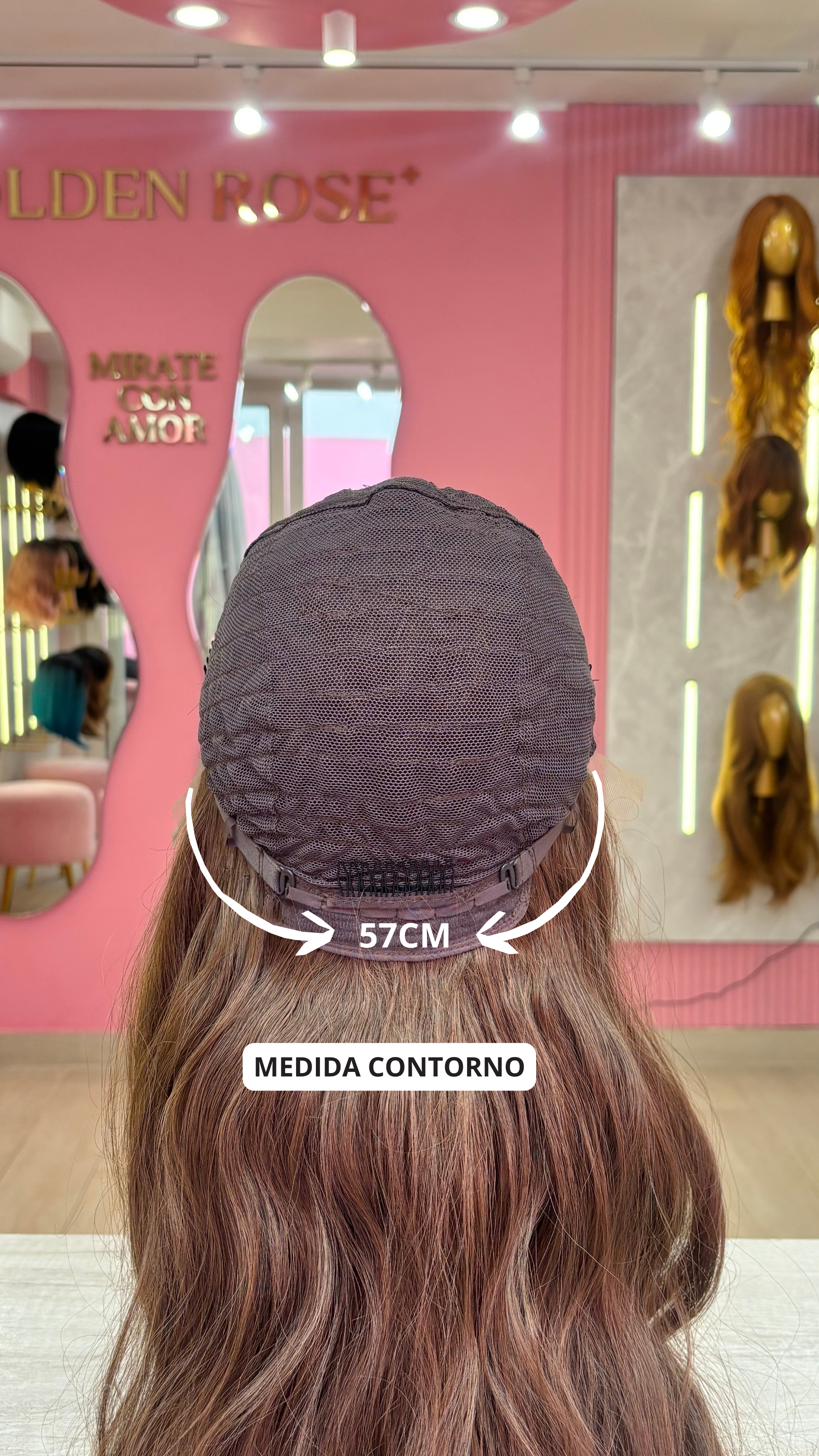 La peluca Flora es un producto de nuestra línea "Golden" con gorro de costura lace front raíz fija. Este producto cuenta con un regulador de contorno para ajustar el tamaño de la peluca si la persona lo requiere, además de 3 peinetas internas para asegurar mejor el cabello (en caso se tenga). El cabello empleado para este postizo es del material modacrílico (un tipo de fibra acrílica). Esta fibra es resistente al agua y al calor, no tiene brillo como el cabello de muñeca, sino que se asemeja a un cabello natural. Asimismo, es suave y manejable, se puede alisar, ondular y lavar. Se recomienda su uso para ocasiones esporádicas con la finalidad de alargar su tiempo de vida.