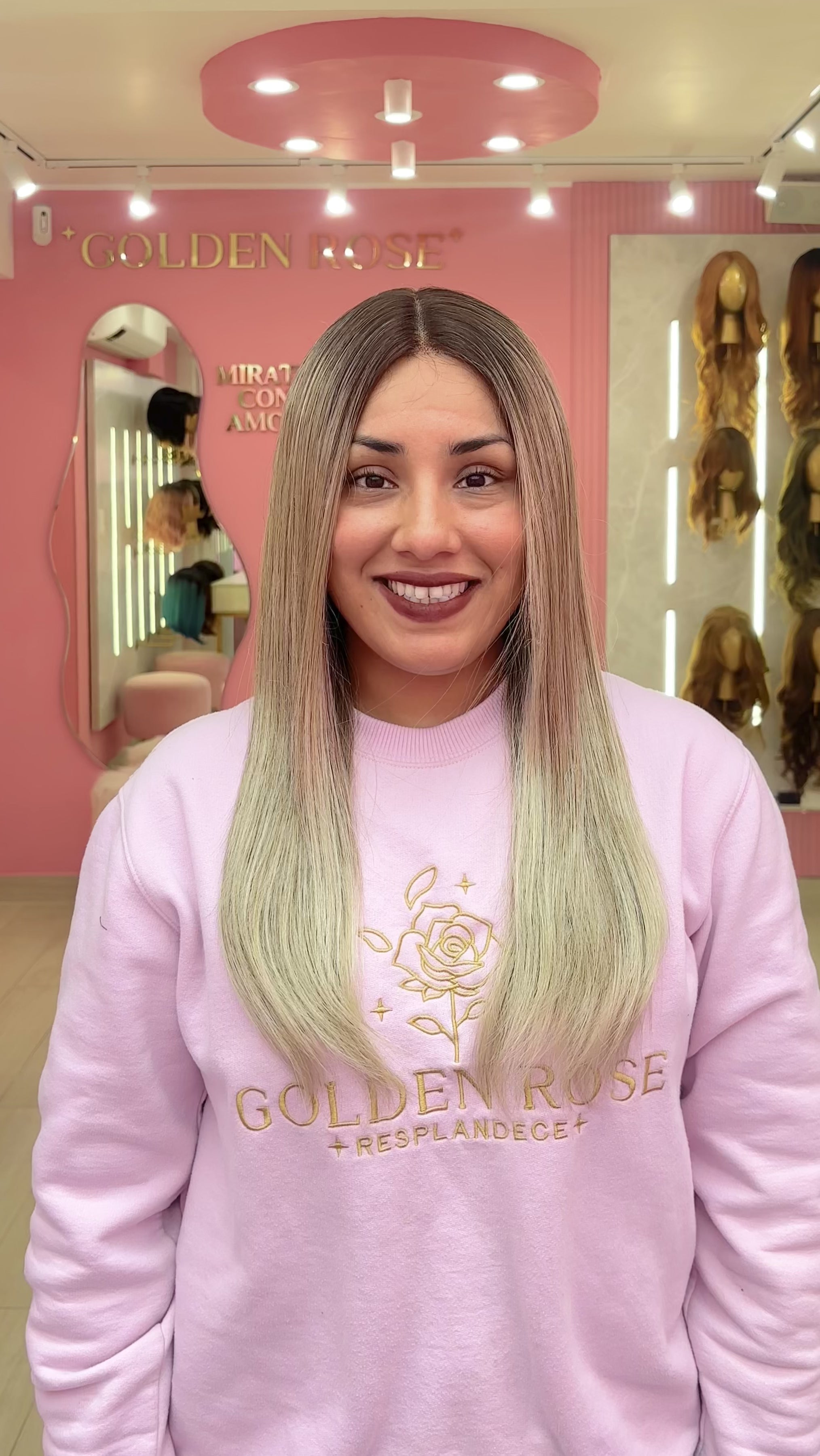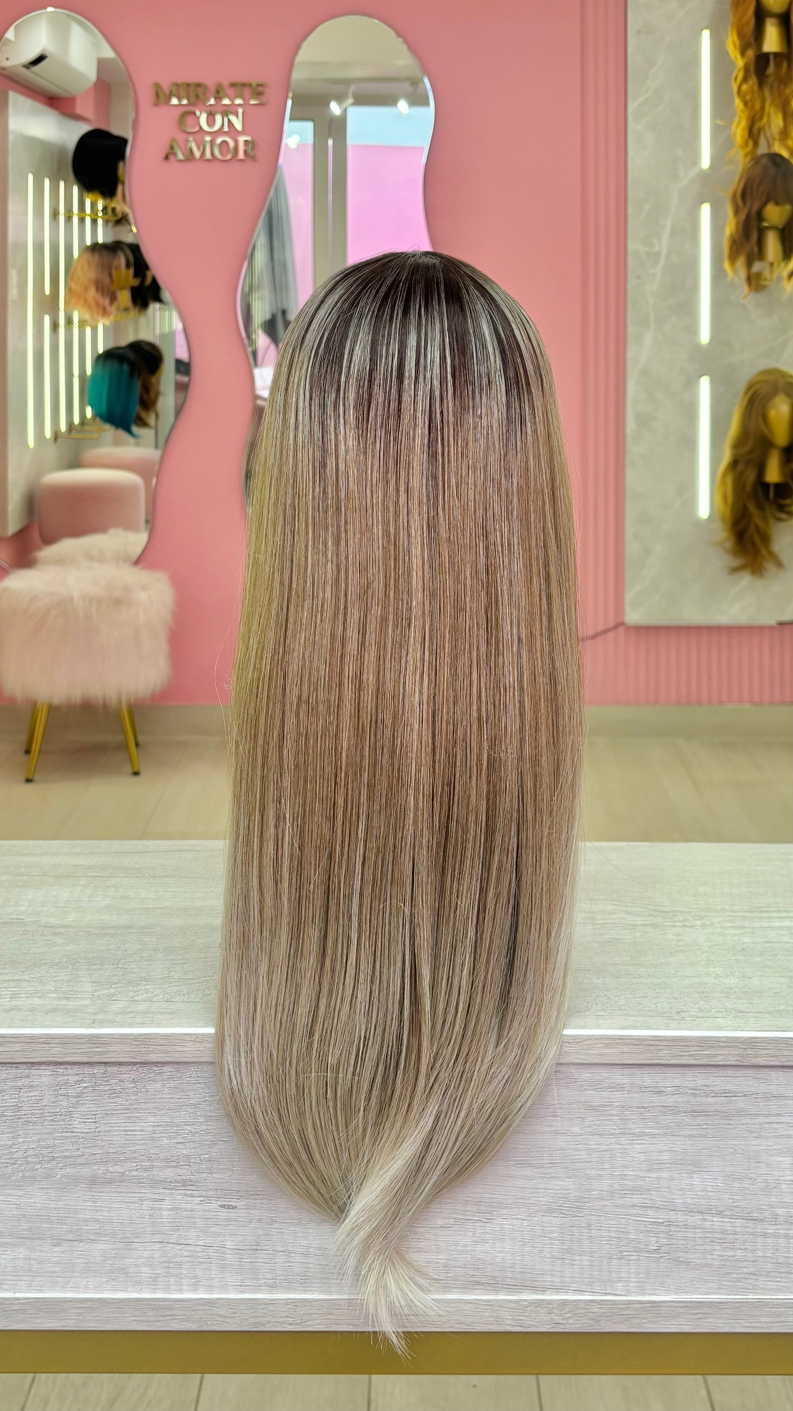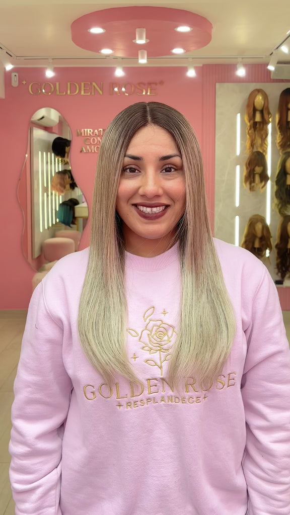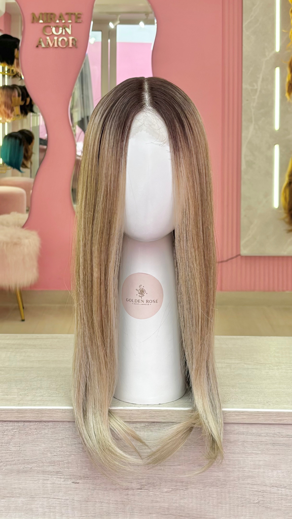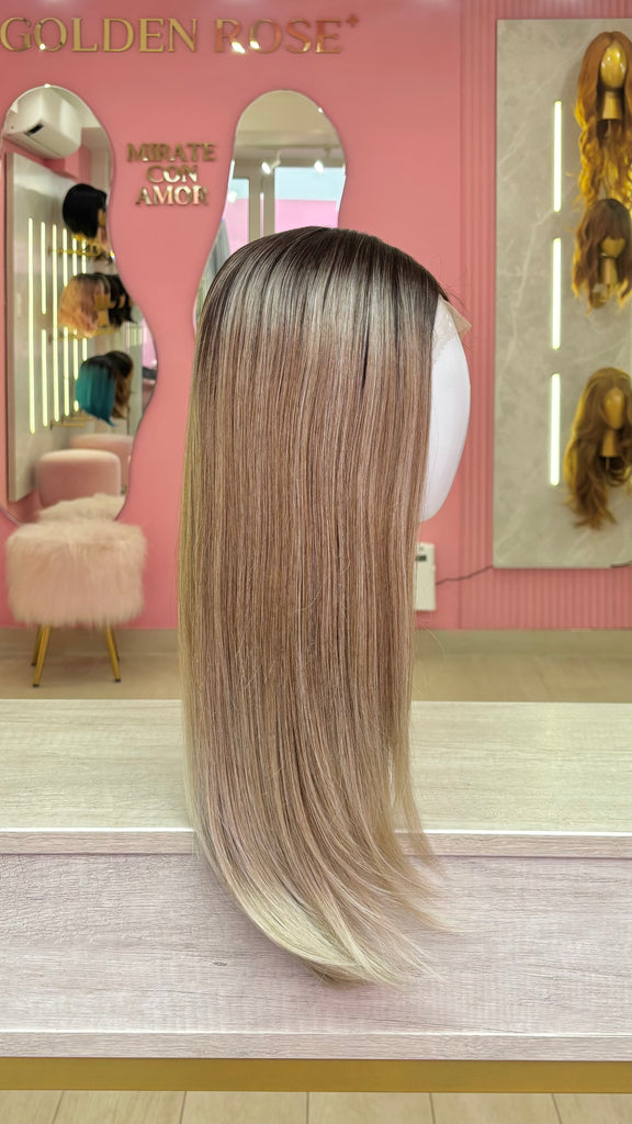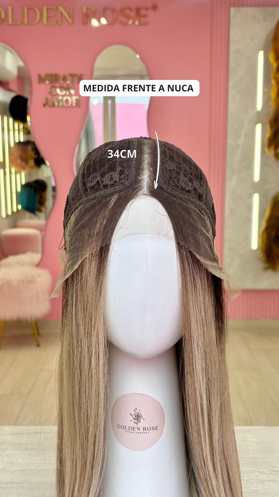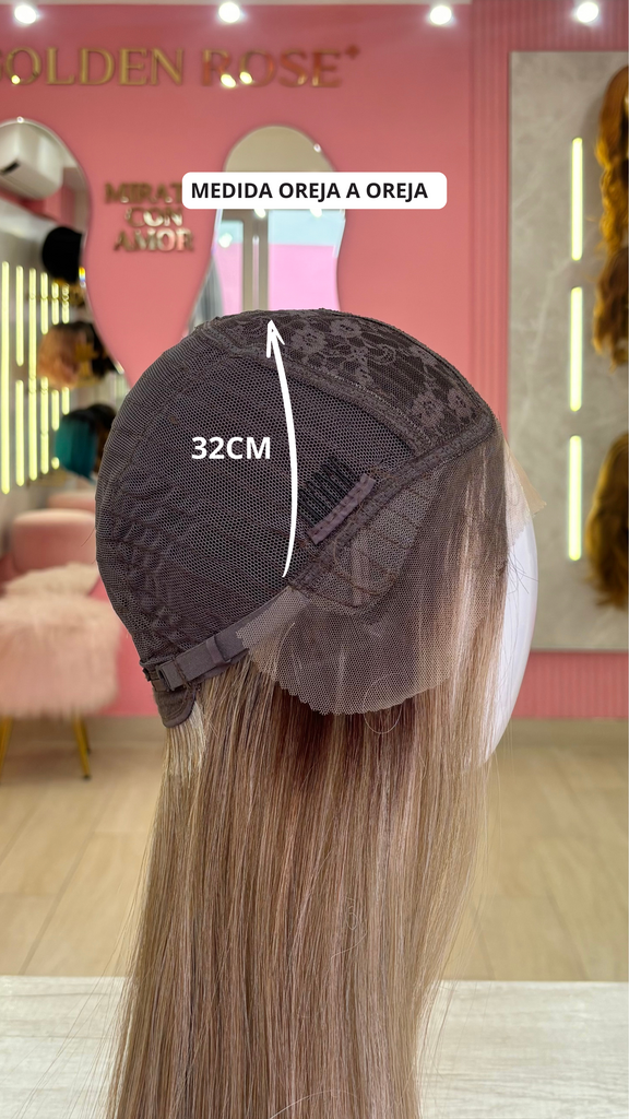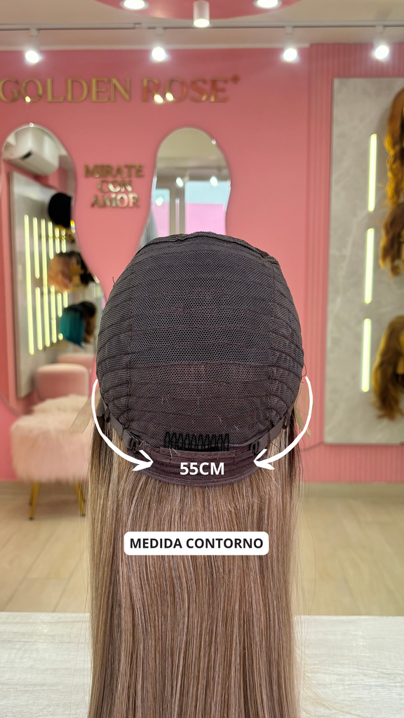 La peluca Gianella es un producto de nuestra línea "Golden" con gorro de costura lace front raíz fija. Este producto cuenta con un regulador de contorno para ajustar el tamaño de la peluca si la persona lo requiere, además de 3 peinetas internas para asegurar mejor el cabello (en caso se tenga). El cabello empleado para este postizo es del material modacrílico (un tipo de fibra acrílica). Esta fibra es resistente al agua y al calor, no tiene brillo como el cabello de muñeca, sino que se asemeja a un cabello natural. Asimismo, es suave y manejable, se puede alisar, ondular y lavar. Se recomienda su uso para ocasiones esporádicas con la finalidad de alargar su tiempo de vida.