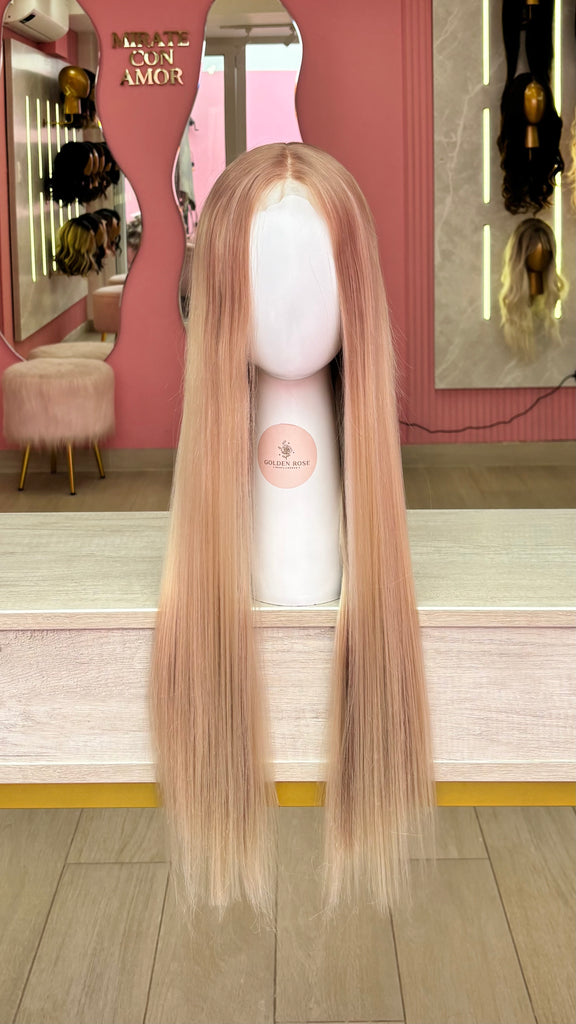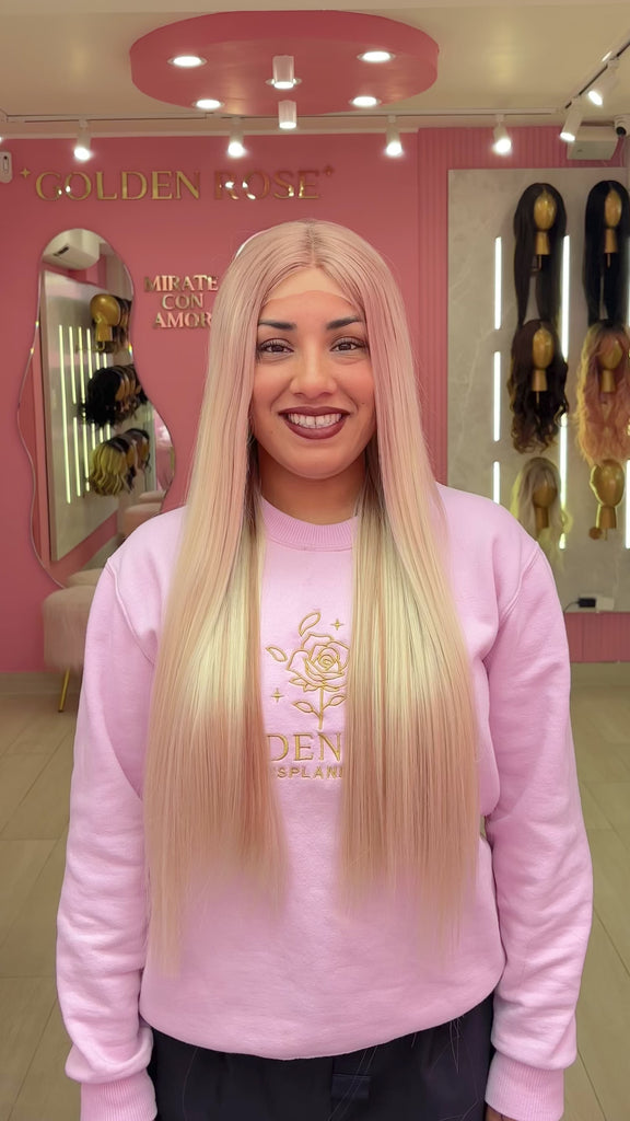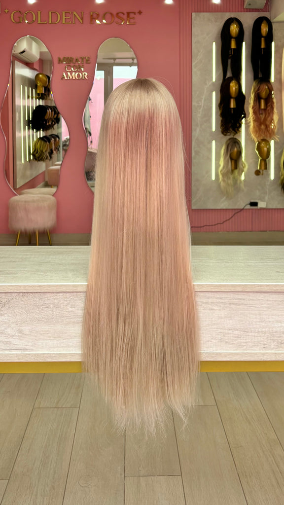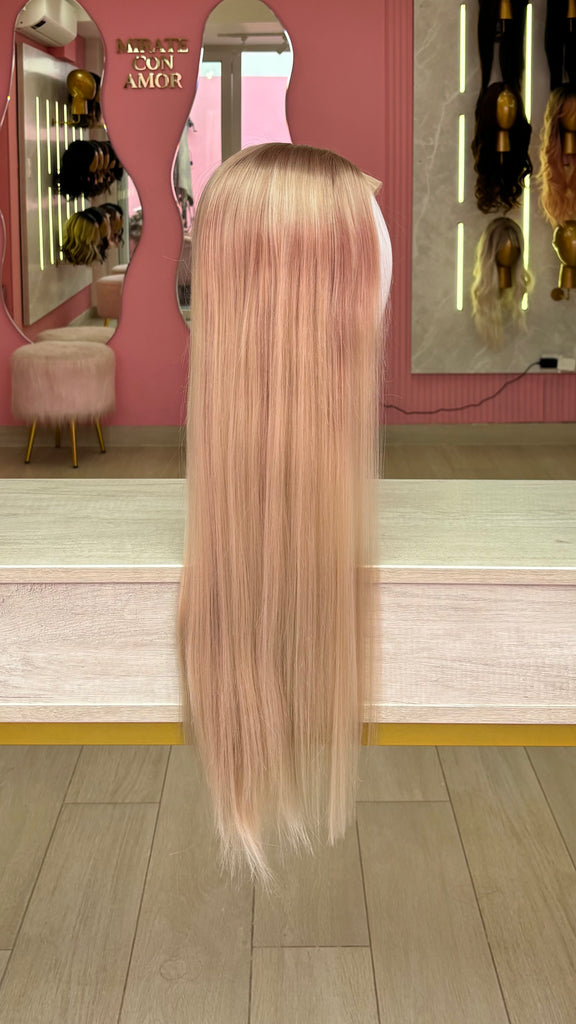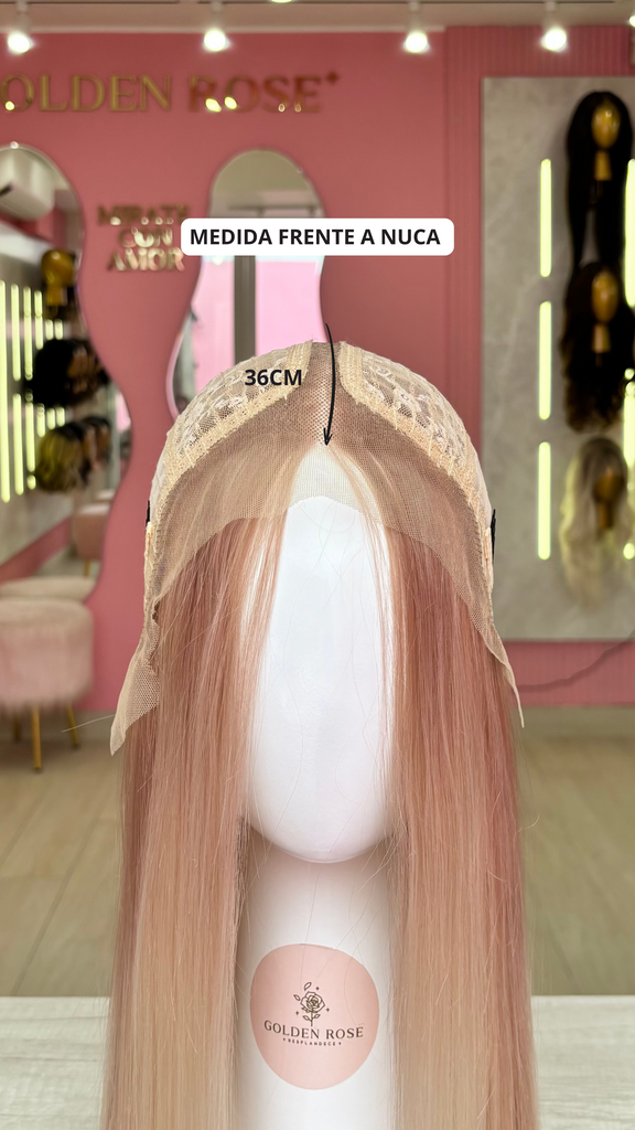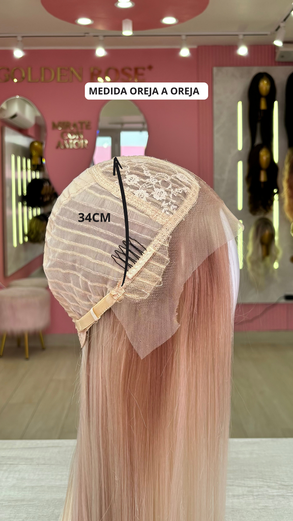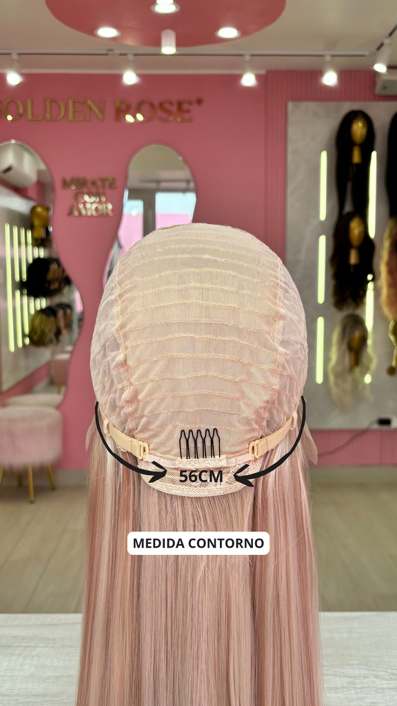 La peluca Holly es un producto de nuestra línea "Golden" con gorro de costura lace front raíz fija. Este producto cuenta con un regulador de contorno para ajustar el tamaño de la peluca si la persona lo requiere, además de 3 peinetas internas para asegurar mejor el cabello (en caso se tenga). El cabello empleado para este postizo es del material modacrílico (un tipo de fibra acrílica). Esta fibra es resistente al agua y al calor, no tiene brillo como el cabello de muñeca, sino que se asemeja a un cabello natural. Asimismo, es suave y manejable, se puede alisar, ondular y lavar. Se recomienda su uso para ocasiones esporádicas con la finalidad de alargar su tiempo de vida.