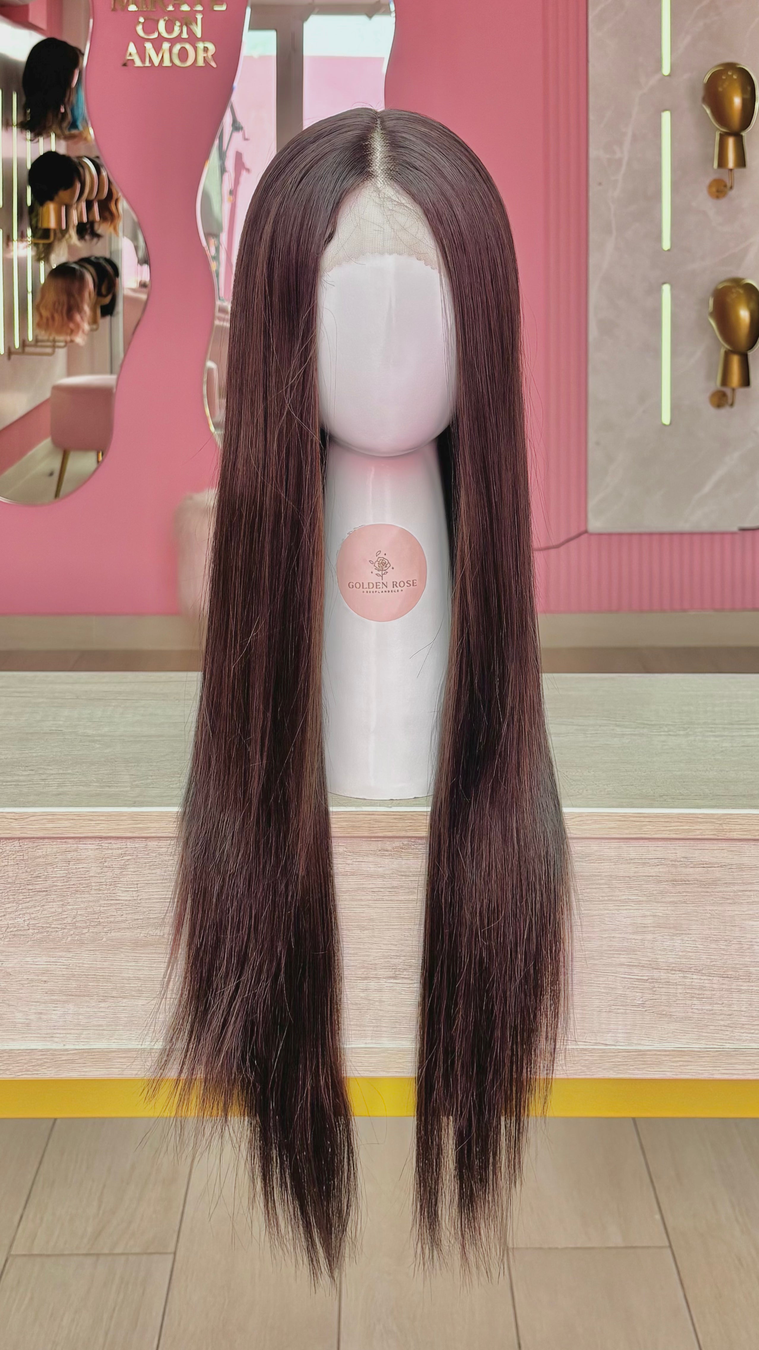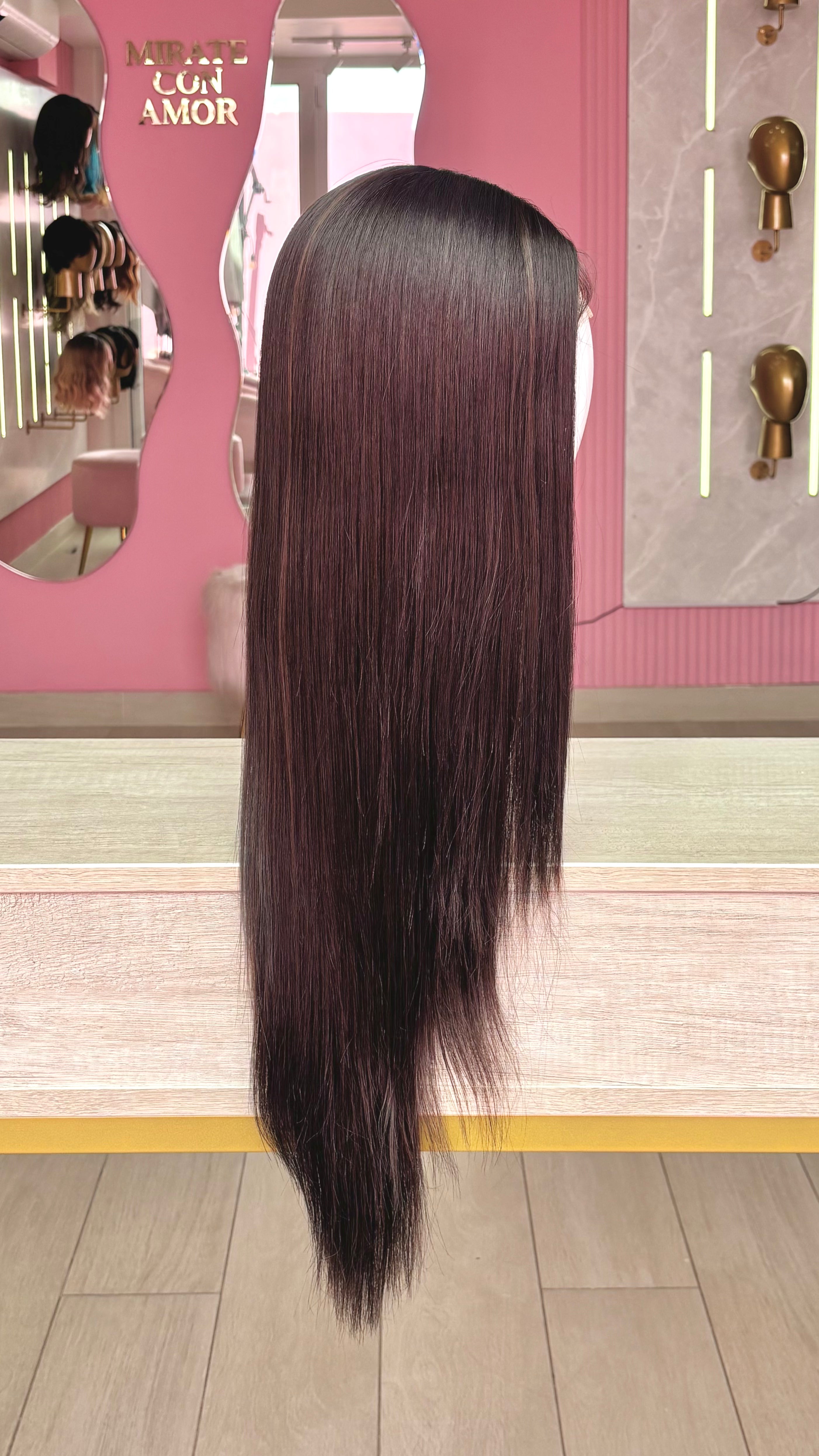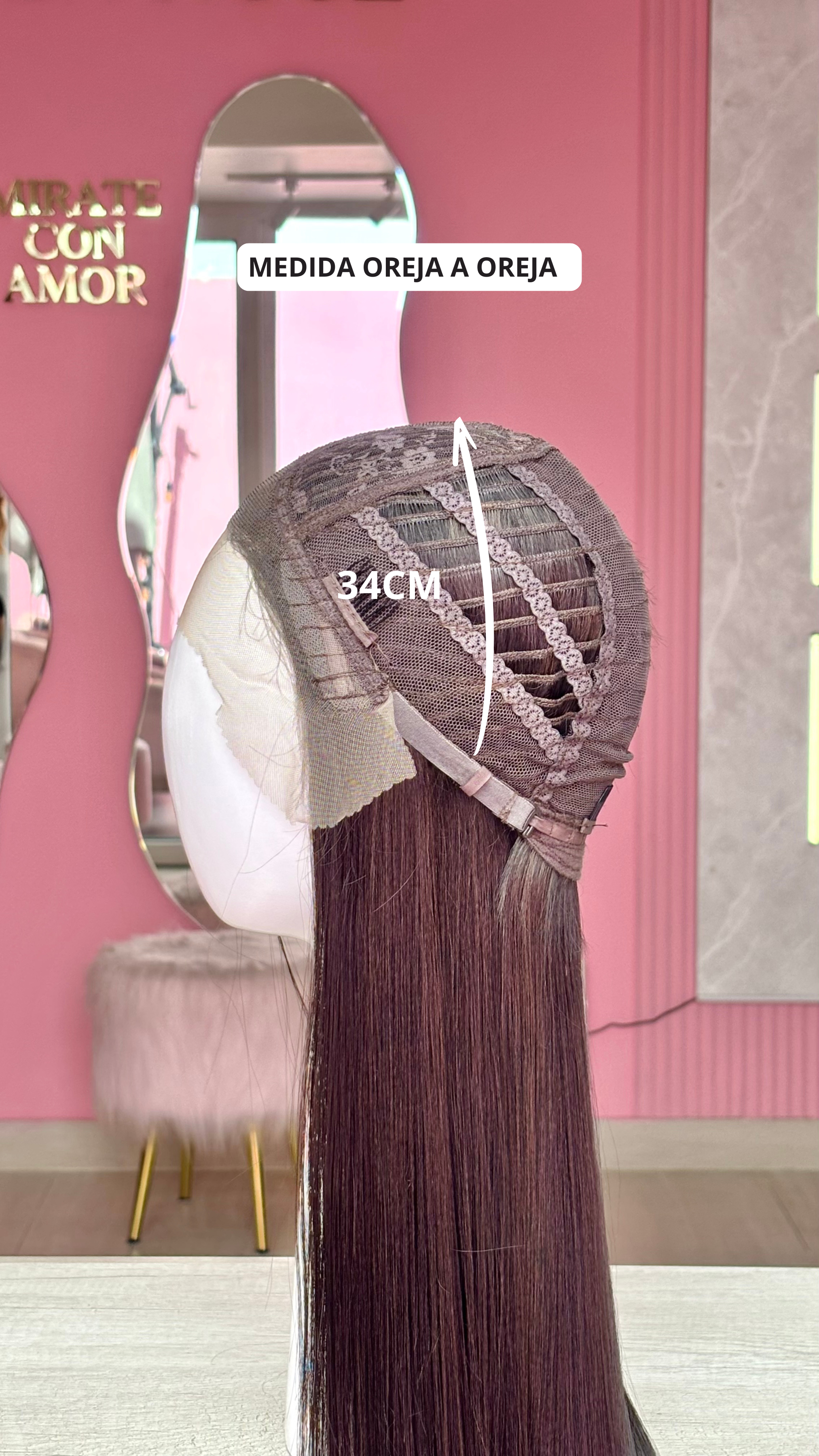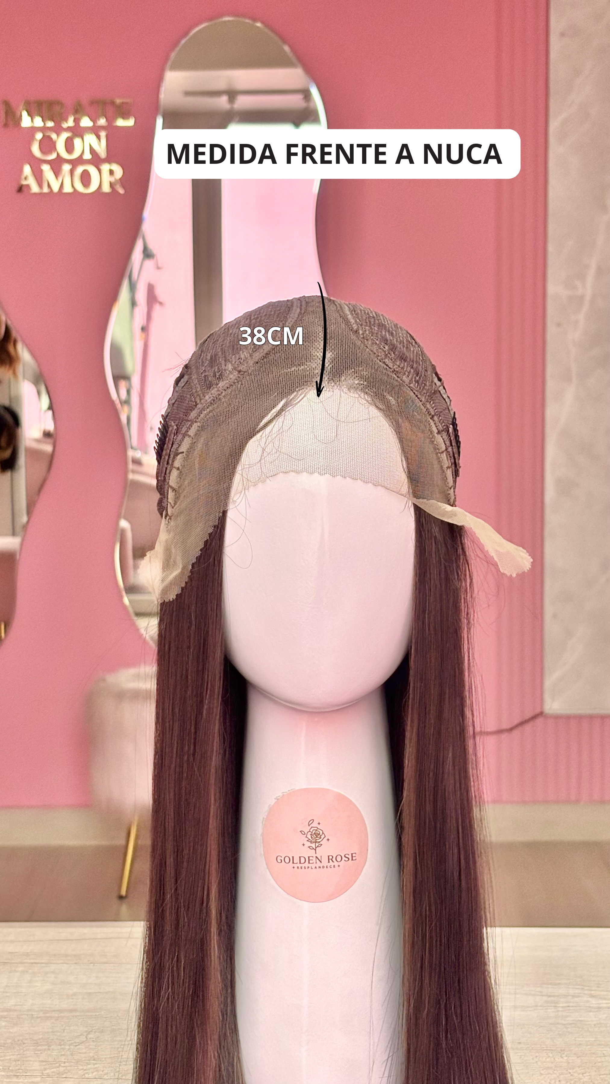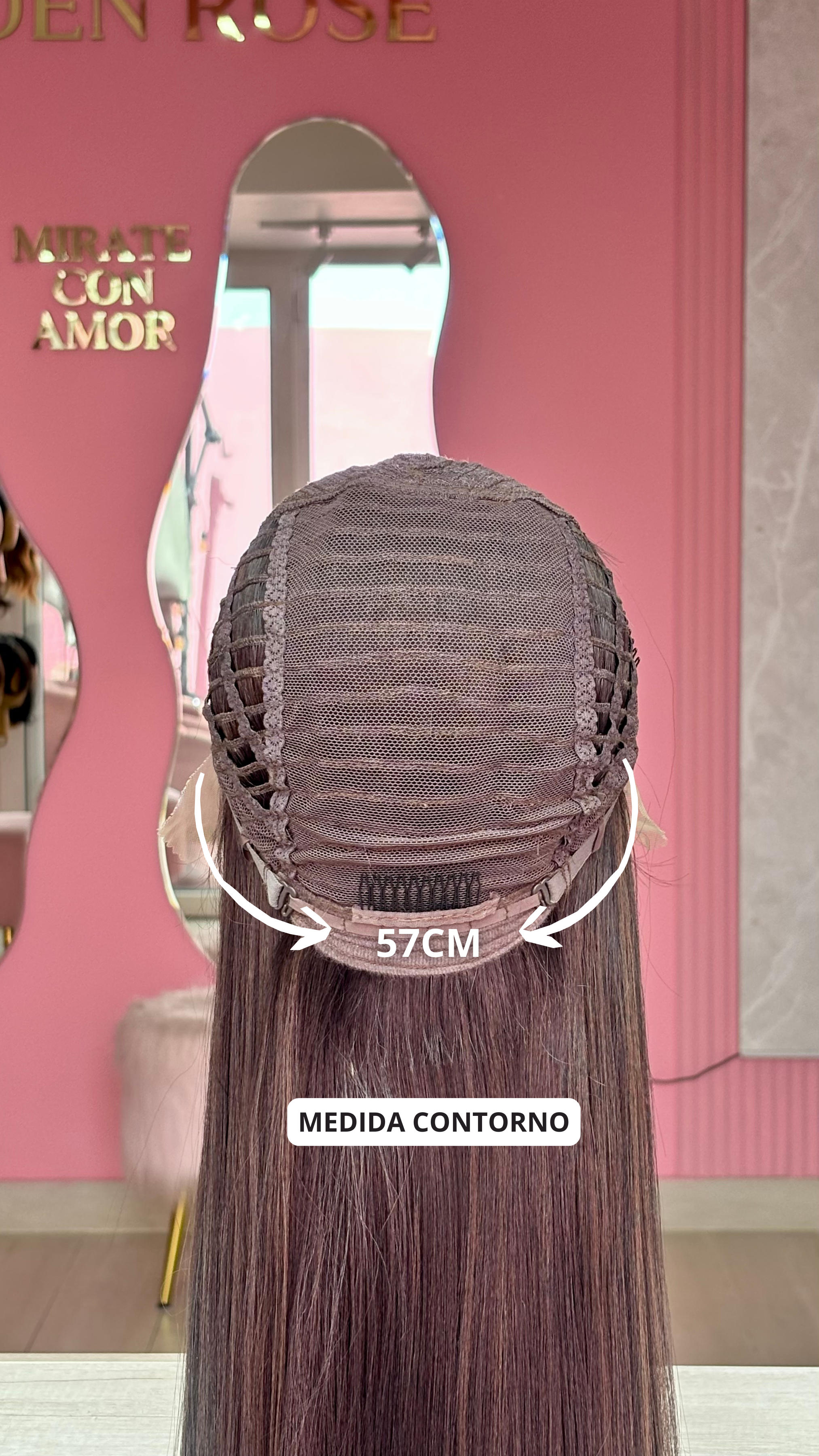 La peluca Kathy es un producto de nuestra línea "Golden" con gorro de costura lace front raíz fija. Este producto cuenta con un regulador de contorno para ajustar el tamaño de la peluca si la persona lo requiere, además de 3 peinetas internas para asegurar mejor el cabello (en caso se tenga). El cabello empleado para este postizo es del material modacrílico (un tipo de fibra acrílica). Esta fibra es resistente al agua y al calor, no tiene brillo como el cabello de muñeca, sino que se asemeja a un cabello natural. Asimismo, es suave y manejable, se puede alisar, ondular y lavar. Se recomienda su uso para ocasiones esporádicas con la finalidad de alargar su tiempo de vida.