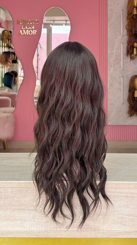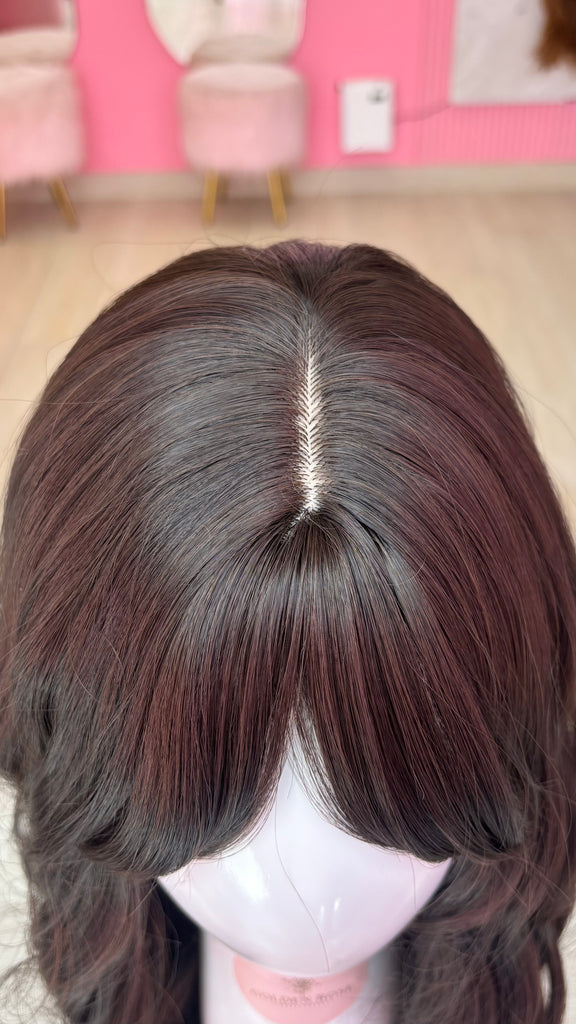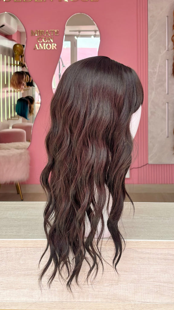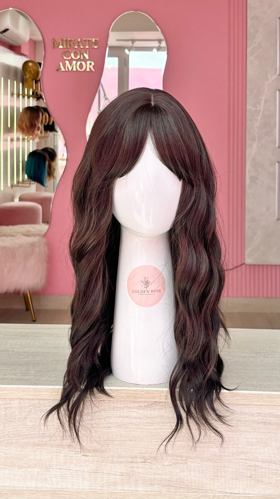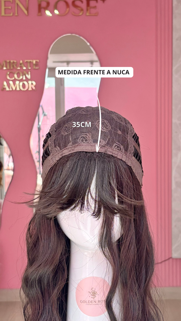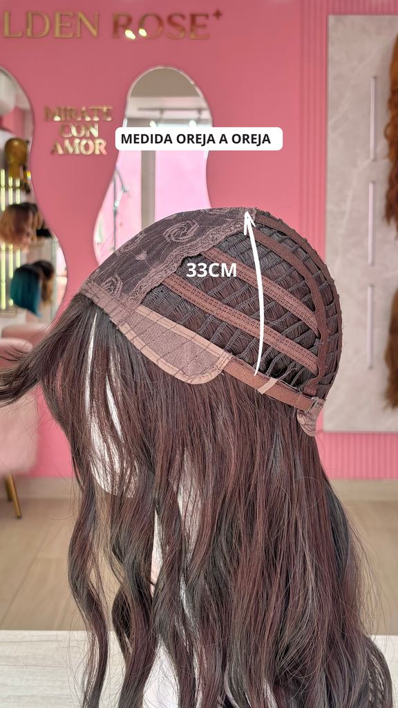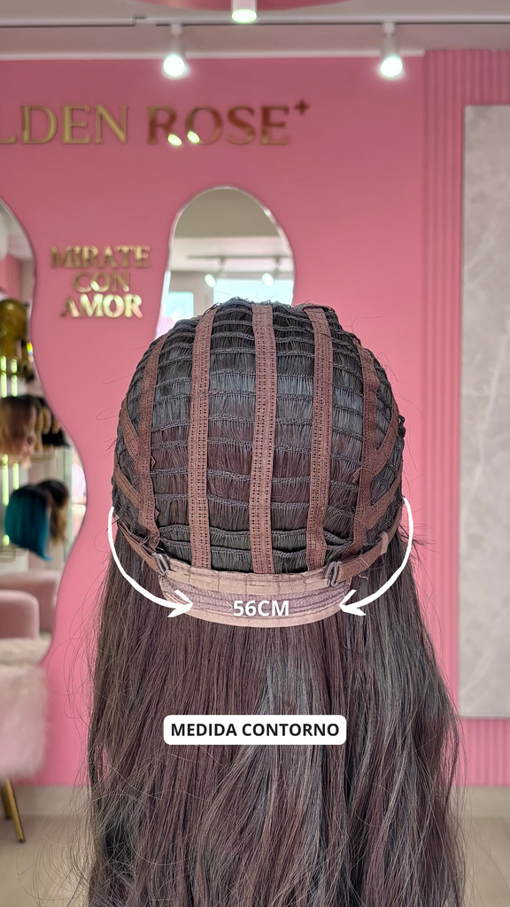 La peluca Mariana es un producto de nuestra línea "Golden" con gorro de costura scalp raiz fija. Este producto cuenta con un regulador de contorno para ajustar el tamaño de la peluca si la persona lo requiere. El cabello empleado para este postizo es del material modacrílico (un tipo de fibra acrílica). Esta fibra es resistente al agua y al calor, no tiene brillo como el cabello de muñeca, sino que se asemeja a un cabello natural. Asimismo, es suave y manejable, se puede alisar, ondular y lavar. Se recomienda su uso para ocasiones esporádicas con la finalidad de alargar su tiempo de vida.