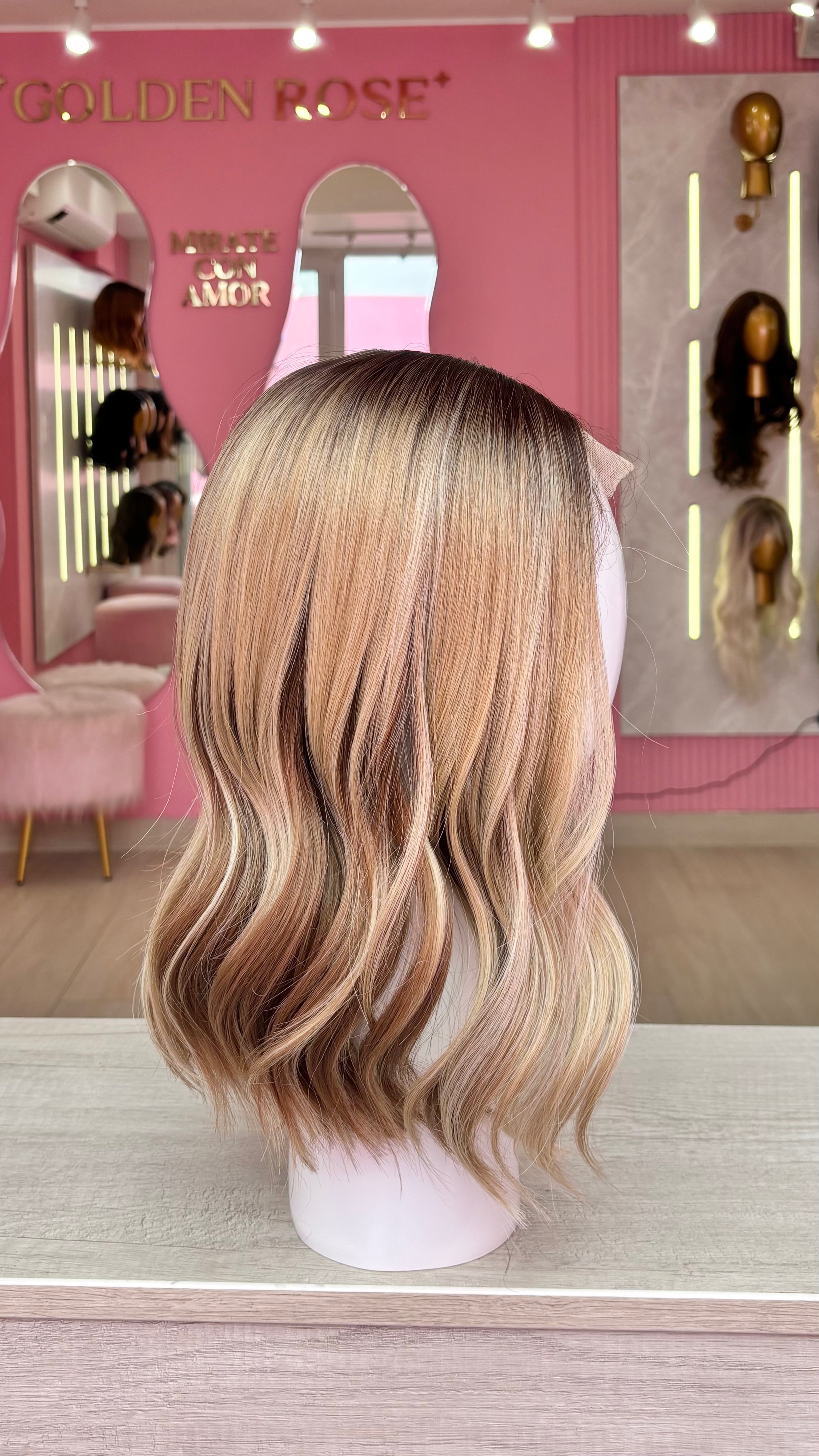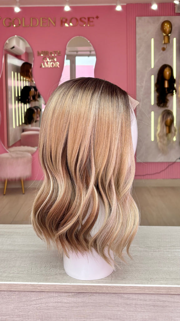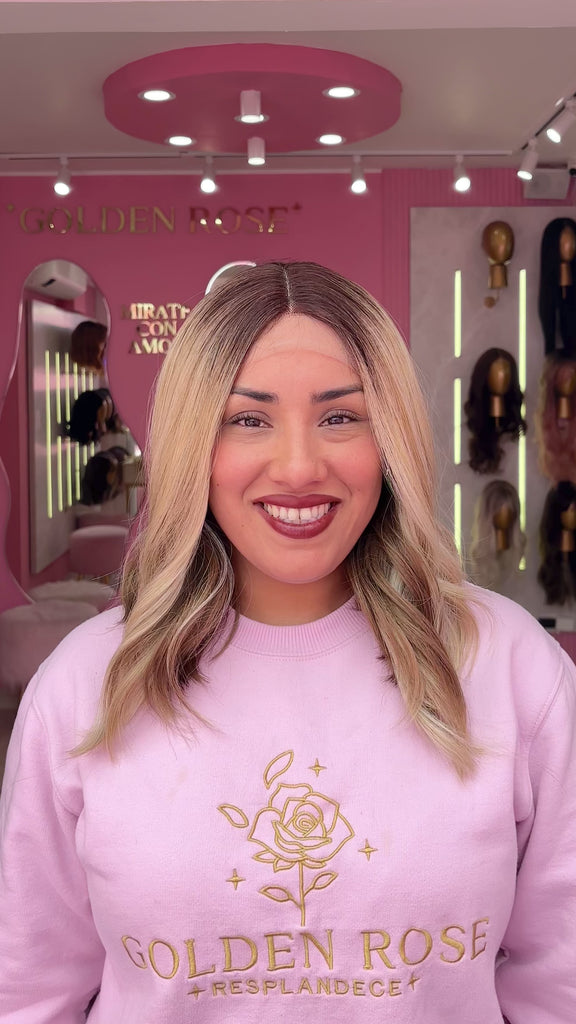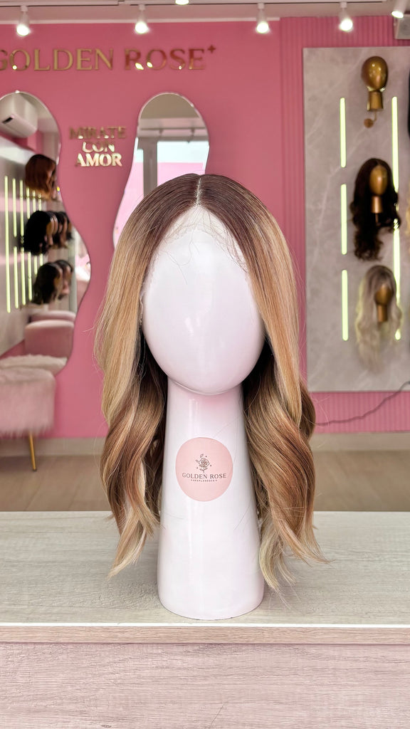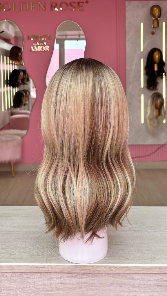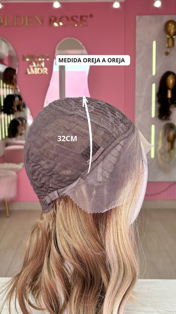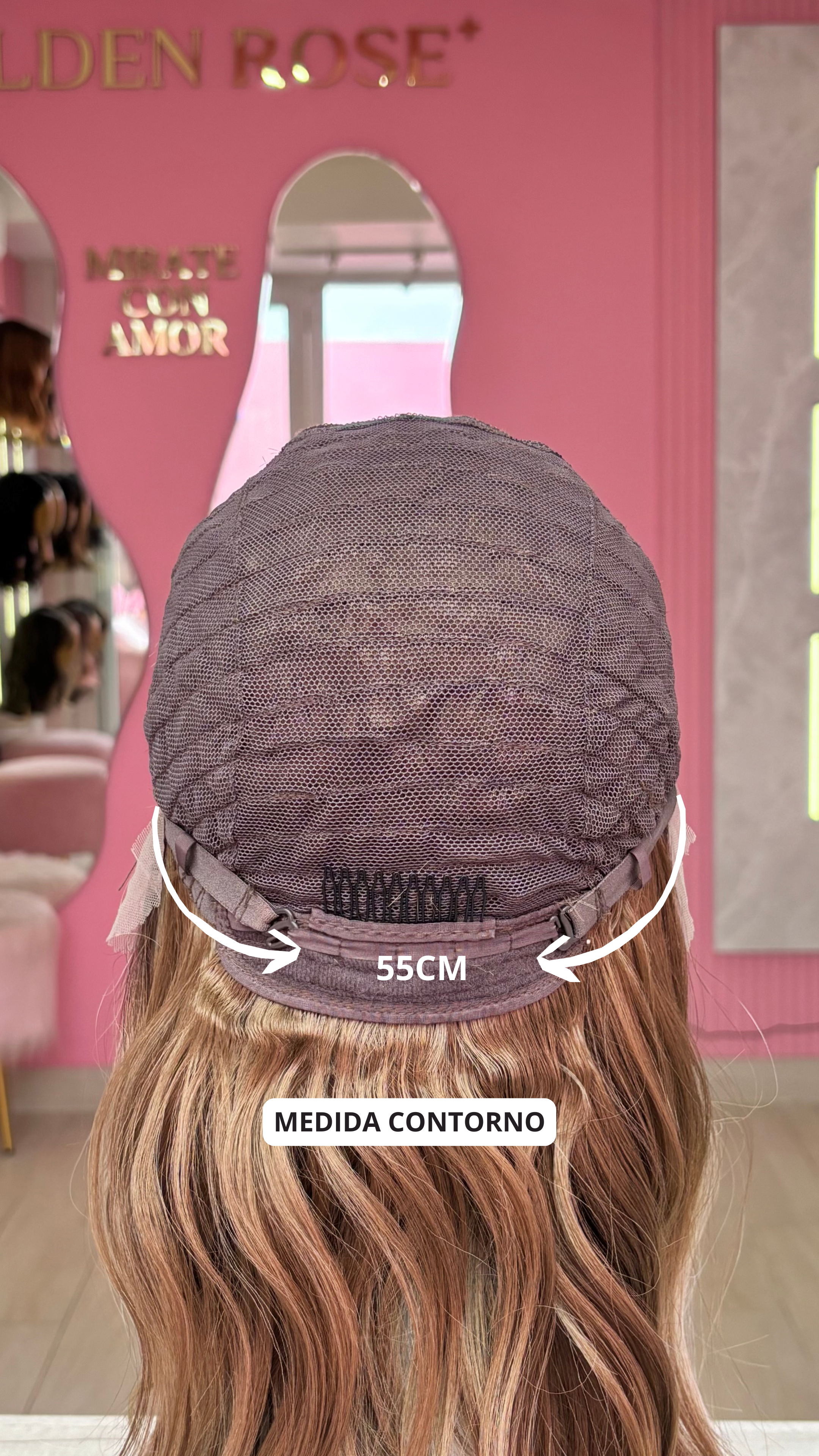 La peluca Marissa es un producto de nuestra línea "Golden" con gorro de costura lace front raíz fija. Este producto cuenta con un regulador de contorno para ajustar el tamaño de la peluca si la persona lo requiere, además de 3 peinetas internas para asegurar mejor el cabello (en caso se tenga). El cabello empleado para este postizo es del material modacrílico (un tipo de fibra acrílica). Esta fibra es resistente al agua y al calor, no tiene brillo como el cabello de muñeca, sino que se asemeja a un cabello natural. Asimismo, es suave y manejable, se puede alisar, ondular y lavar. Se recomienda su uso para ocasiones esporádicas con la finalidad de alargar su tiempo de vida.
