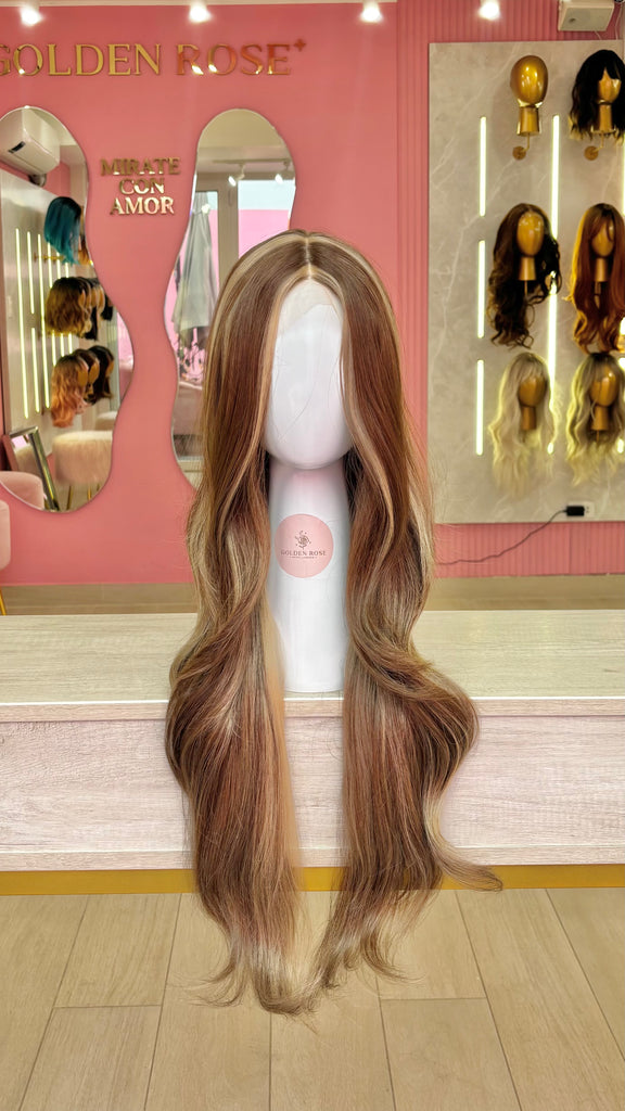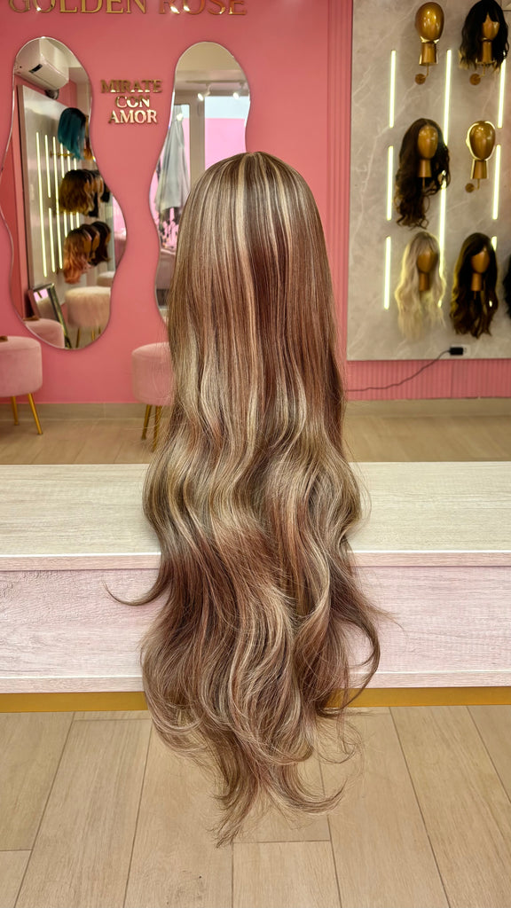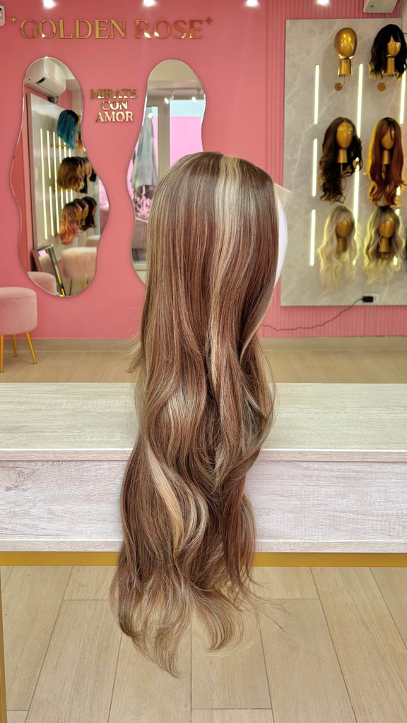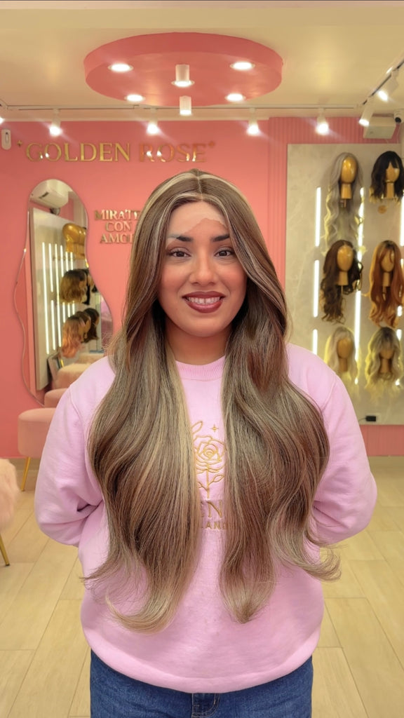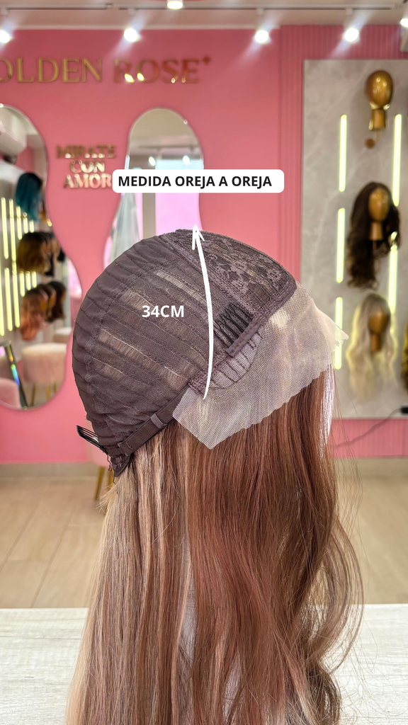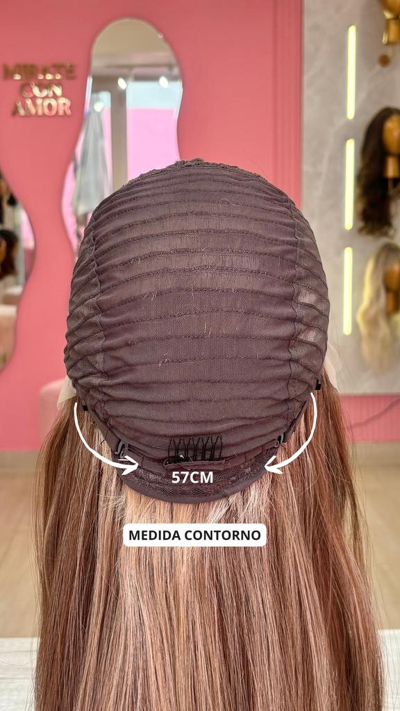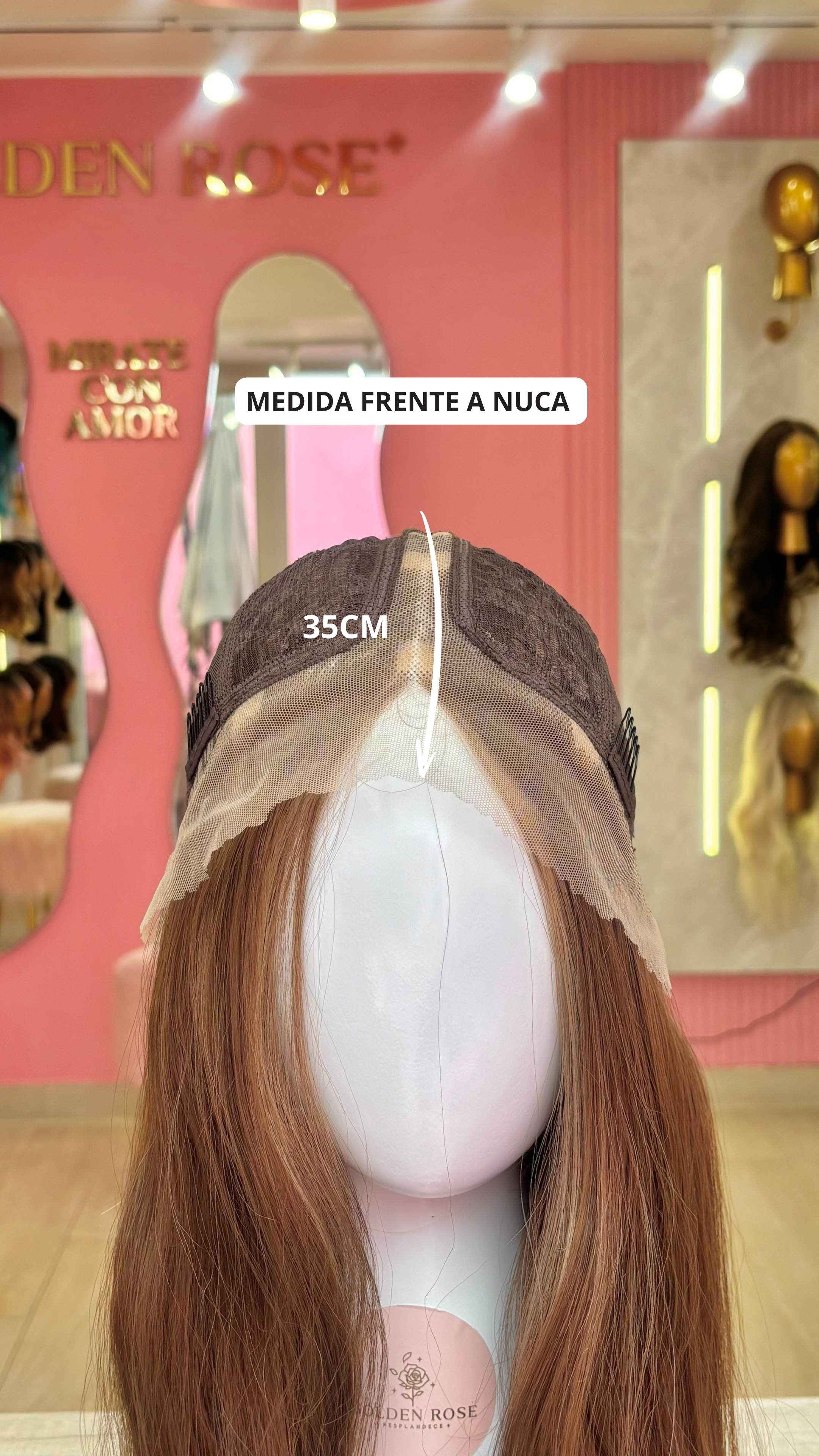 La peluca Adelaine es un producto de nuestra línea "Golden" con gorro de costura lace front raíz fija. Este producto cuenta con un regulador de contorno para ajustar el tamaño de la peluca si la persona lo requiere, además de 3 peinetas internas para asegurar mejor el cabello (en caso se tenga). El cabello empleado para este postizo es del material modacrílico (un tipo de fibra acrílica). Esta fibra es resistente al agua y al calor, no tiene brillo como el cabello de muñeca, sino que se asemeja a un cabello natural. Asimismo, es suave y manejable, se puede alisar, ondular y lavar. Se recomienda su uso para ocasiones esporádicas con la finalidad de alargar su tiempo de vida.