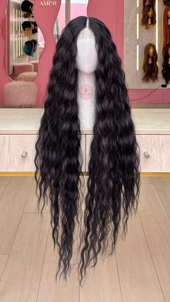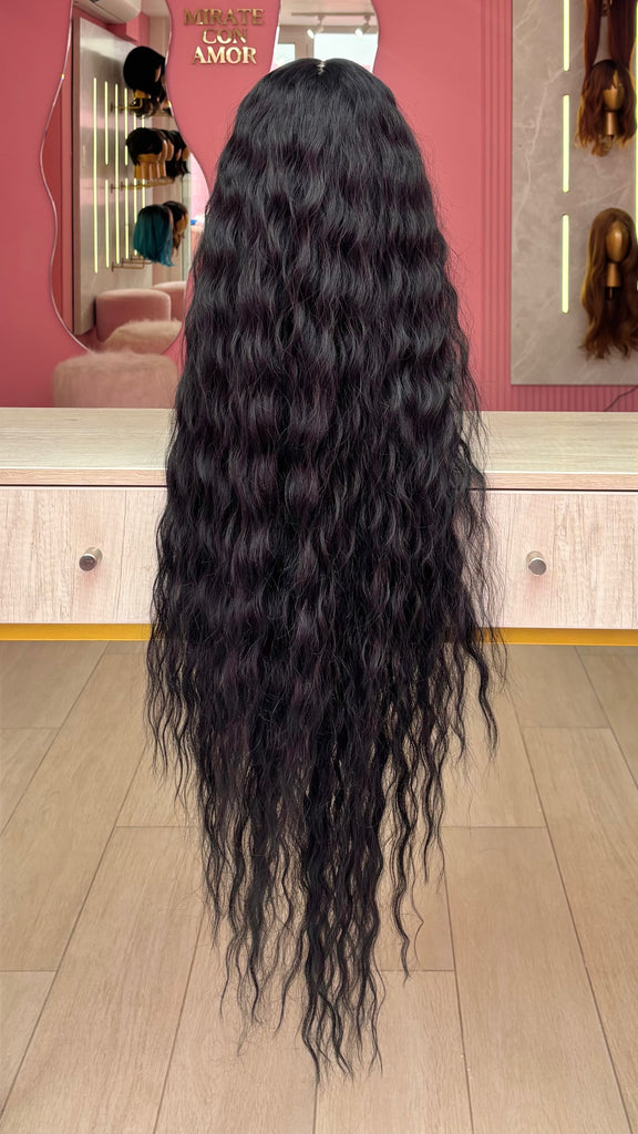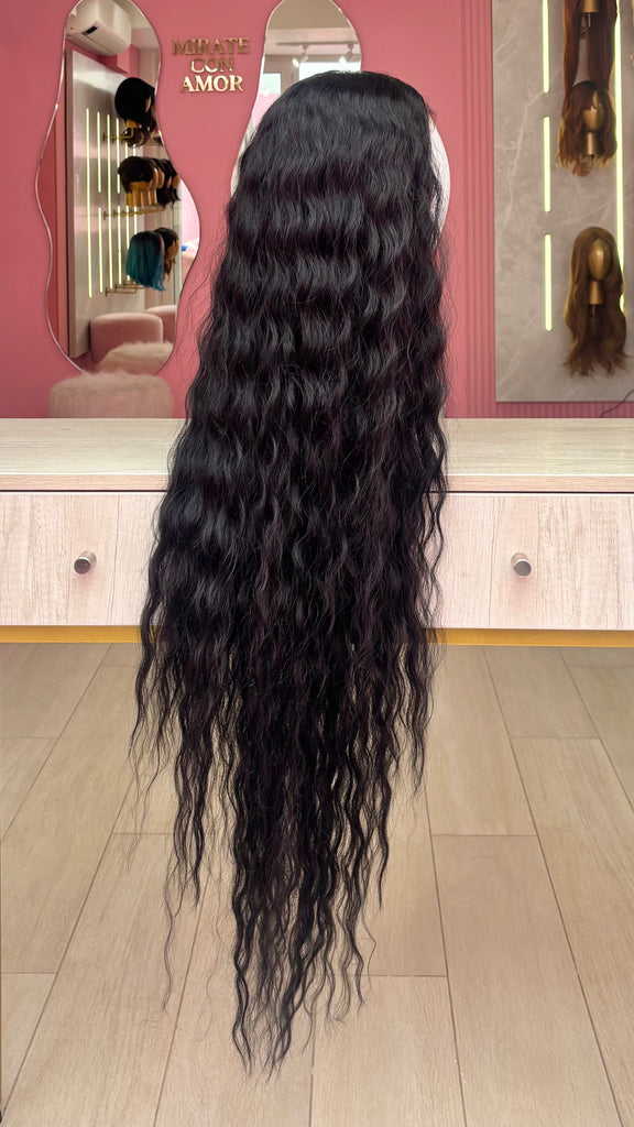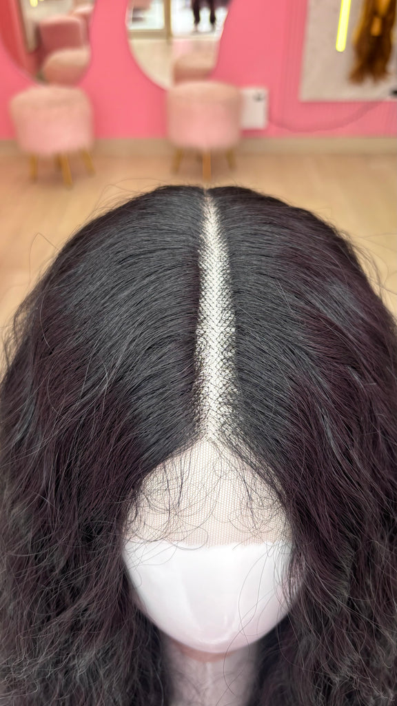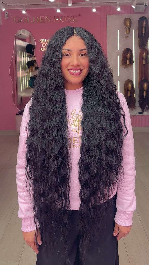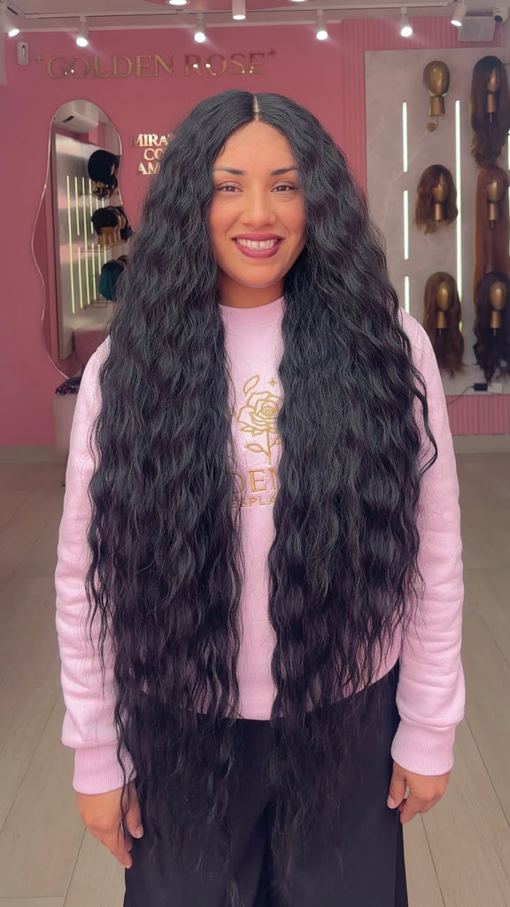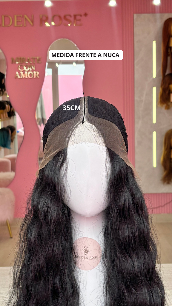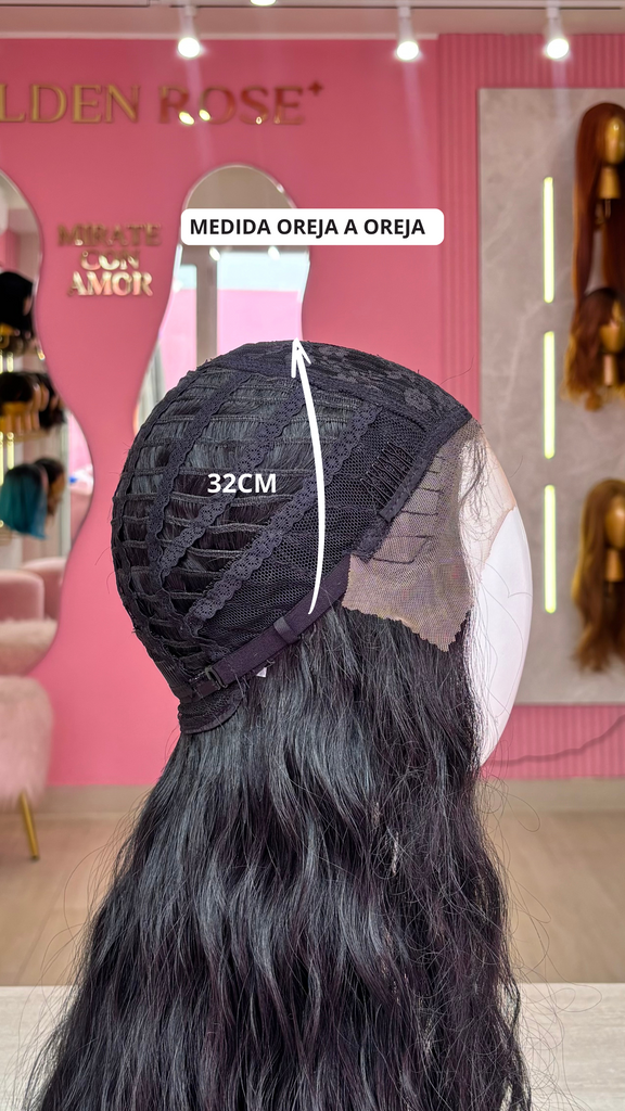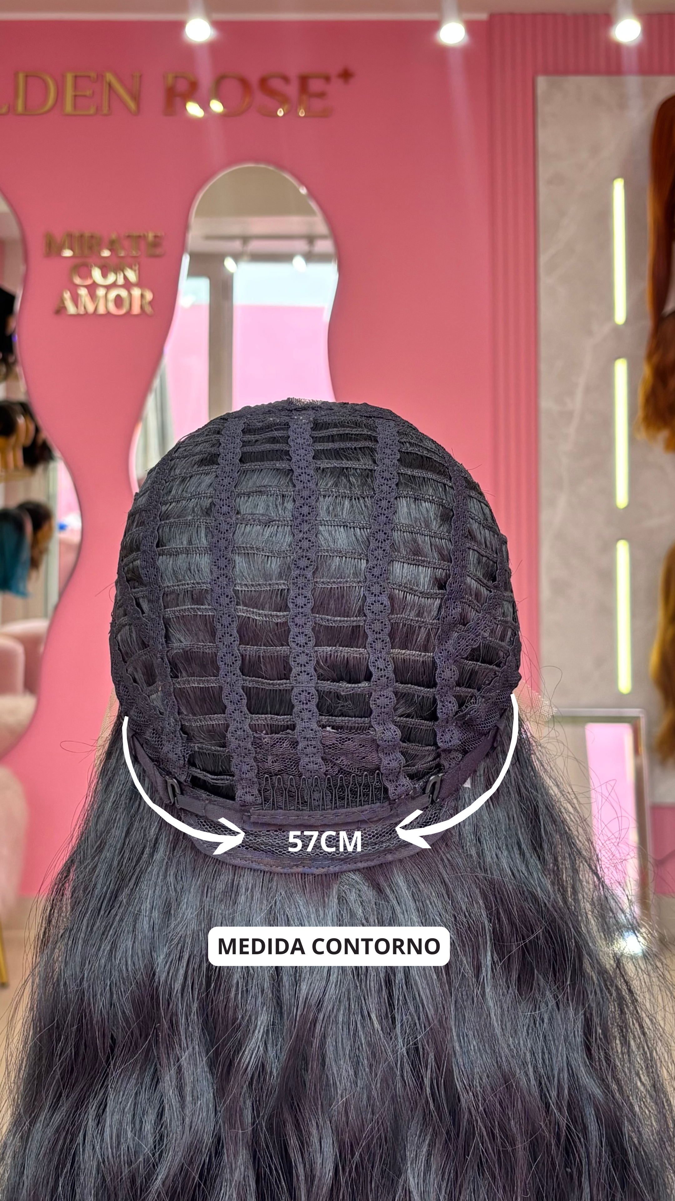La peluca Alicia es un producto de nuestra línea "Golden" con gorro de costura lace front raíz fija. Este producto cuenta con un regulador de contorno para ajustar el tamaño de la peluca si la persona lo requiere, además de 3 peinetas internas para asegurar mejor el cabello (en caso se tenga). El cabello empleado para este postizo es del material modacrílico (un tipo de fibra acrílica). Esta fibra es resistente al agua y al calor, no tiene brillo como el cabello de muñeca, sino que se asemeja a un cabello natural. Asimismo, es suave y manejable, se puede alisar, ondular y lavar. Se recomienda su uso para ocasiones esporádicas con la finalidad de alargar su tiempo de vida.