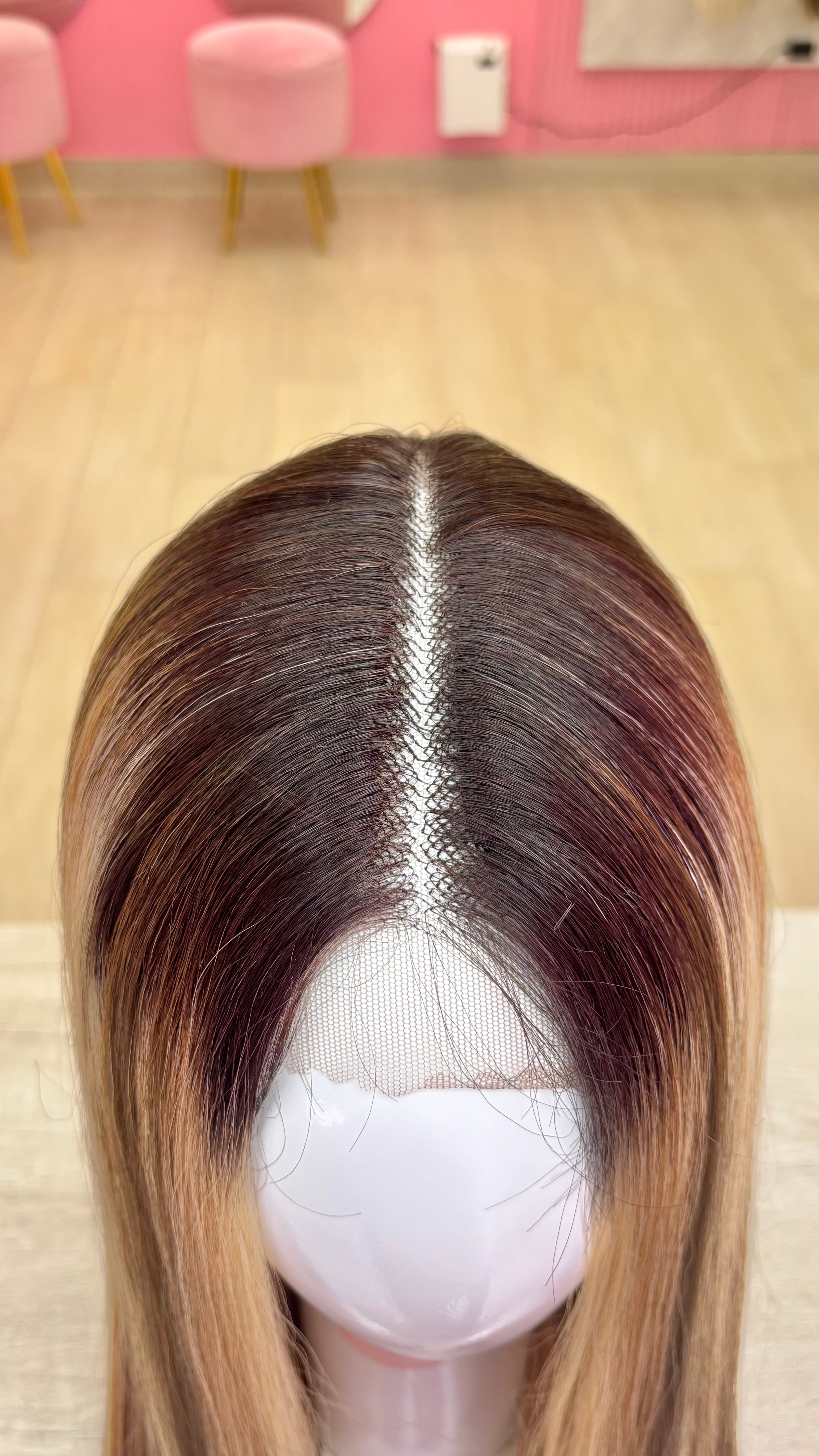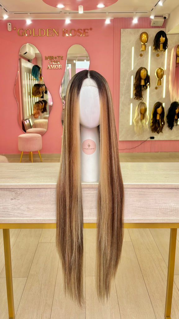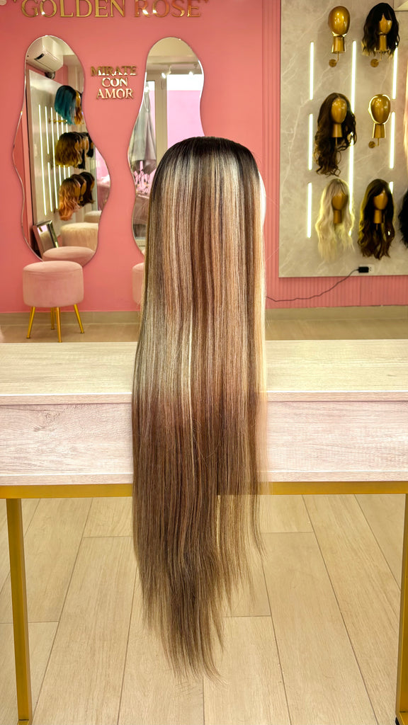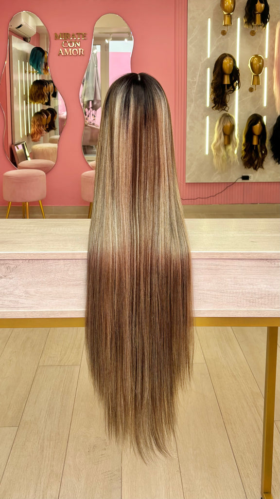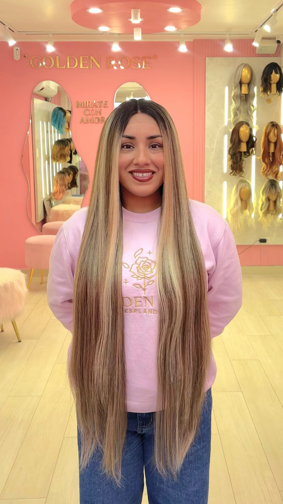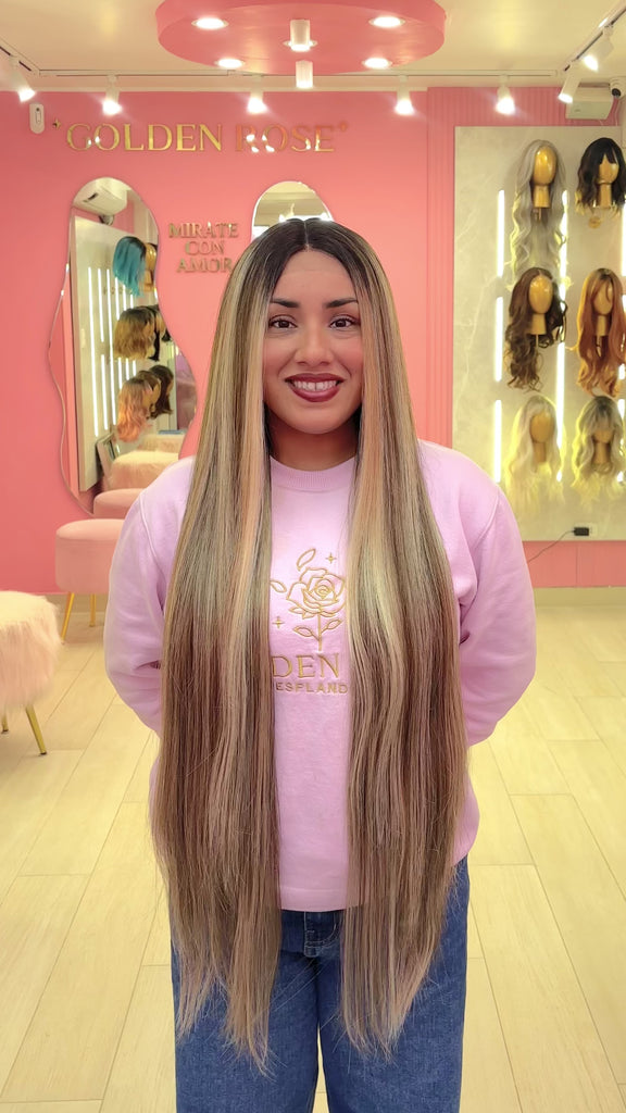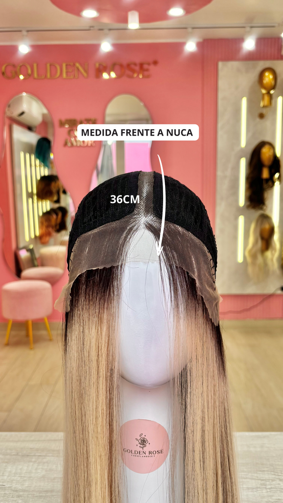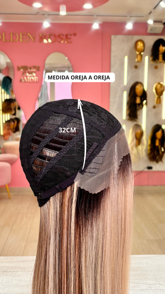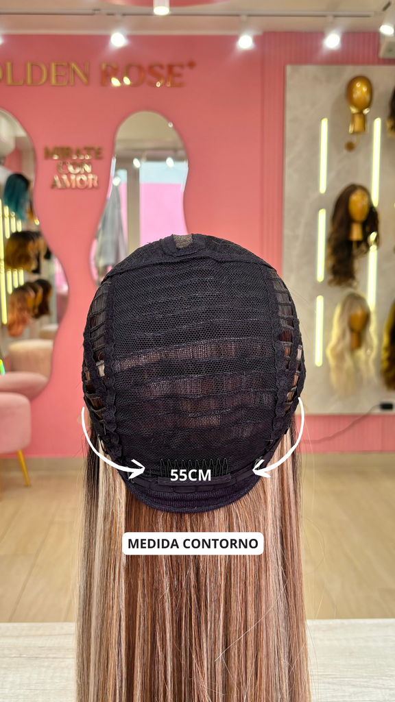 La peluca Amanda es un producto de nuestra línea "Golden" con gorro de costura lace front raíz fija. Este producto cuenta con un regulador de contorno para ajustar el tamaño de la peluca si la persona lo requiere, además de 3 peinetas internas para asegurar mejor el cabello (en caso se tenga). El cabello empleado para este postizo es del material modacrílico (un tipo de fibra acrílica). Esta fibra es resistente al agua y al calor, no tiene brillo como el cabello de muñeca, sino que se asemeja a un cabello natural. Asimismo, es suave y manejable, se puede alisar, ondular y lavar. Se recomienda su uso para ocasiones esporádicas con la finalidad de alargar su tiempo de vida.