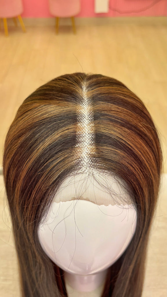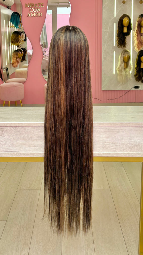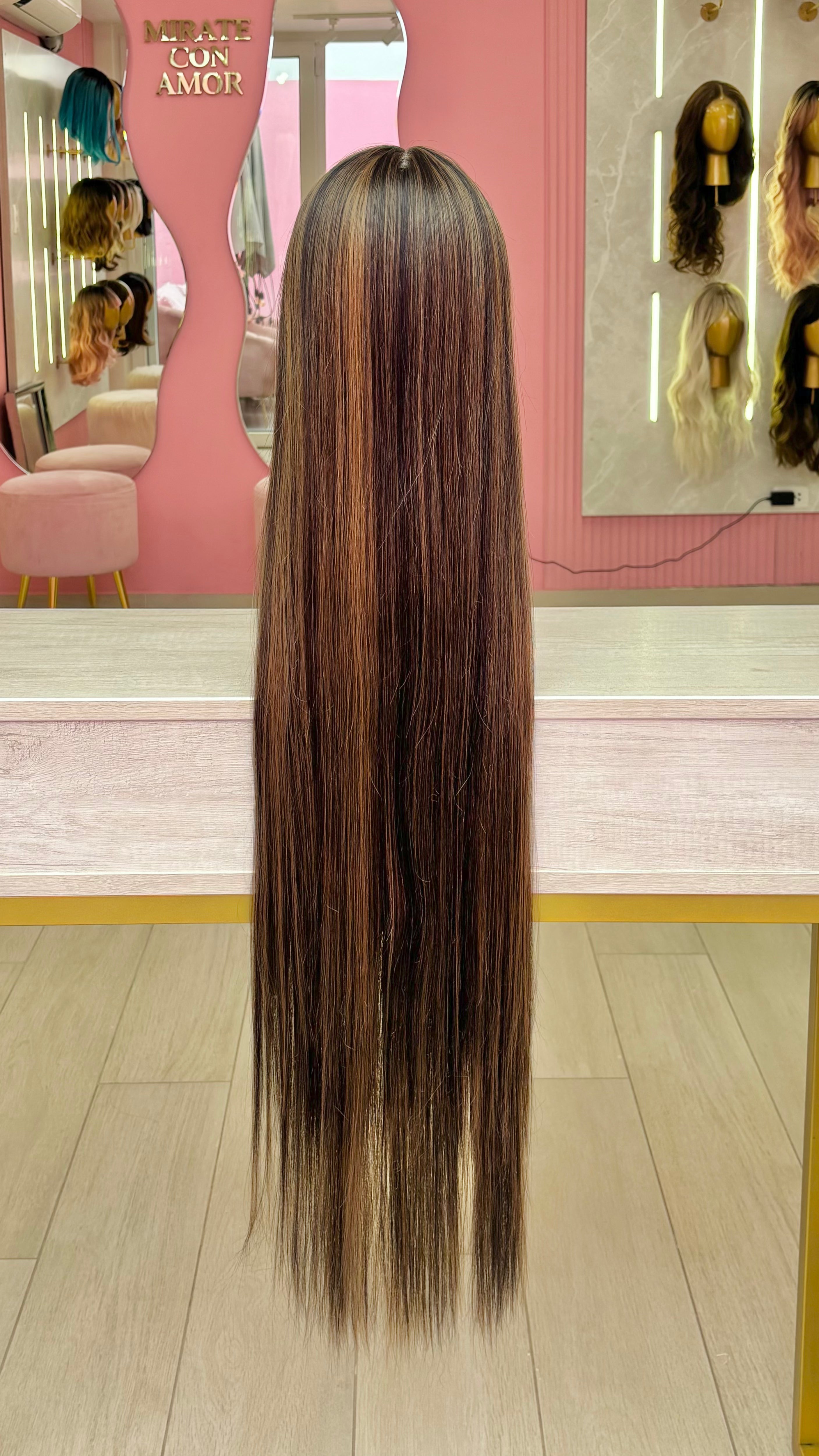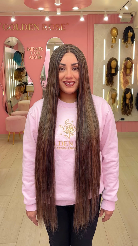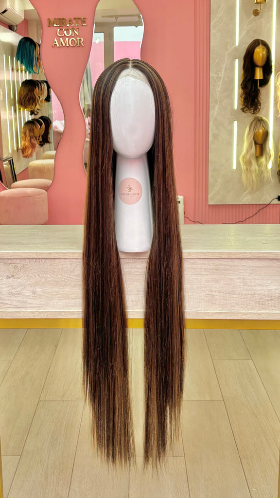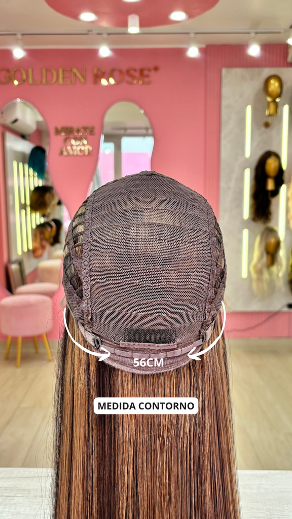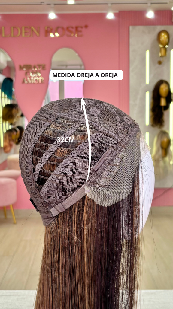La peluca Amanda es un producto de nuestra línea "Golden" con gorro de costura lace front raíz fija. Este producto cuenta con un regulador de contorno para ajustar el tamaño de la peluca si la persona lo requiere, además de 3 peinetas internas para asegurar mejor el cabello (en caso se tenga). El cabello empleado para este postizo es del material modacrílico (un tipo de fibra acrílica). Esta fibra es resistente al agua y al calor, no tiene brillo como el cabello de muñeca, sino que se asemeja a un cabello natural. Asimismo, es suave y manejable, se puede alisar, ondular y lavar. Se recomienda su uso para ocasiones esporádicas con la finalidad de alargar su tiempo de vida.