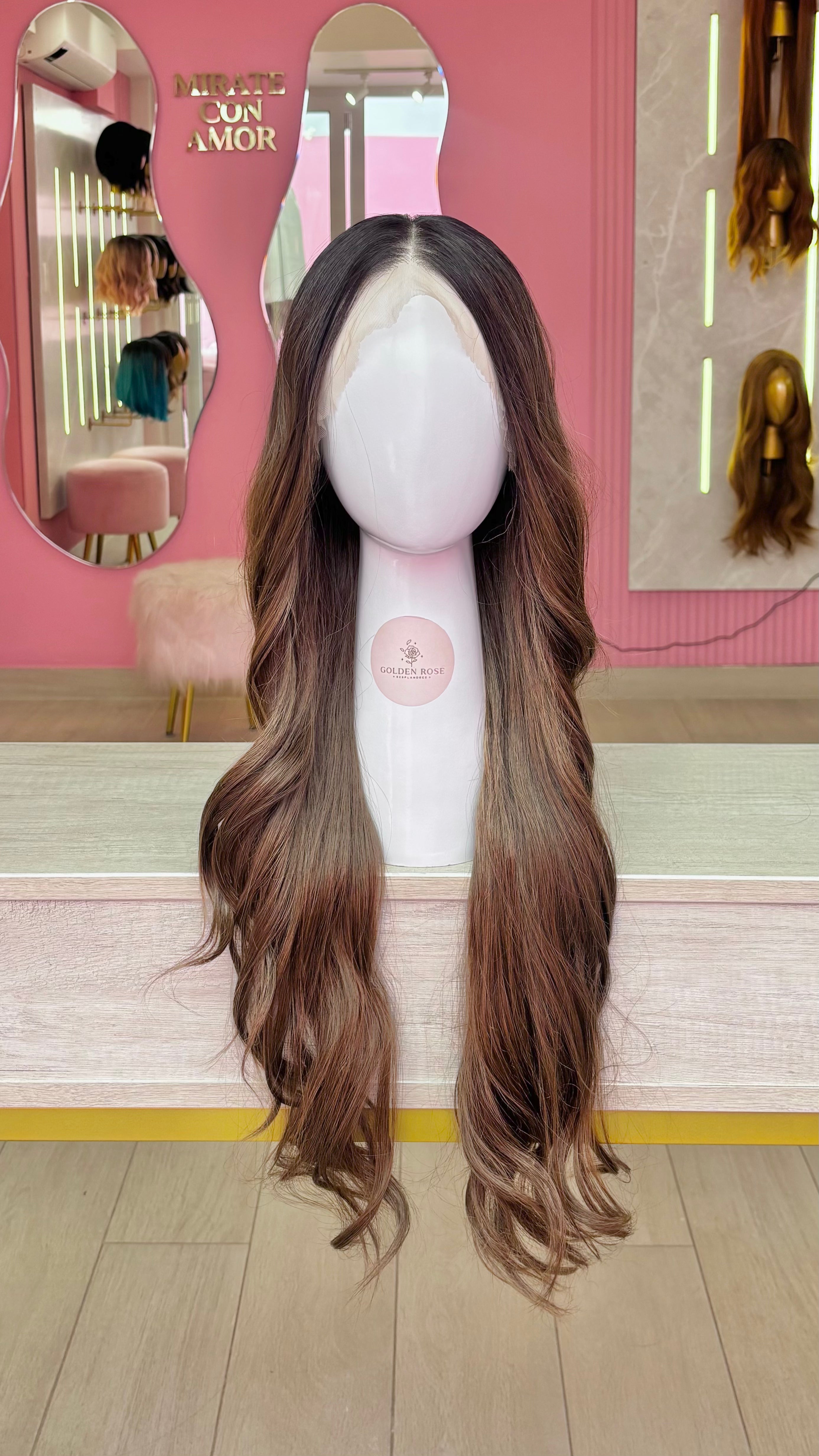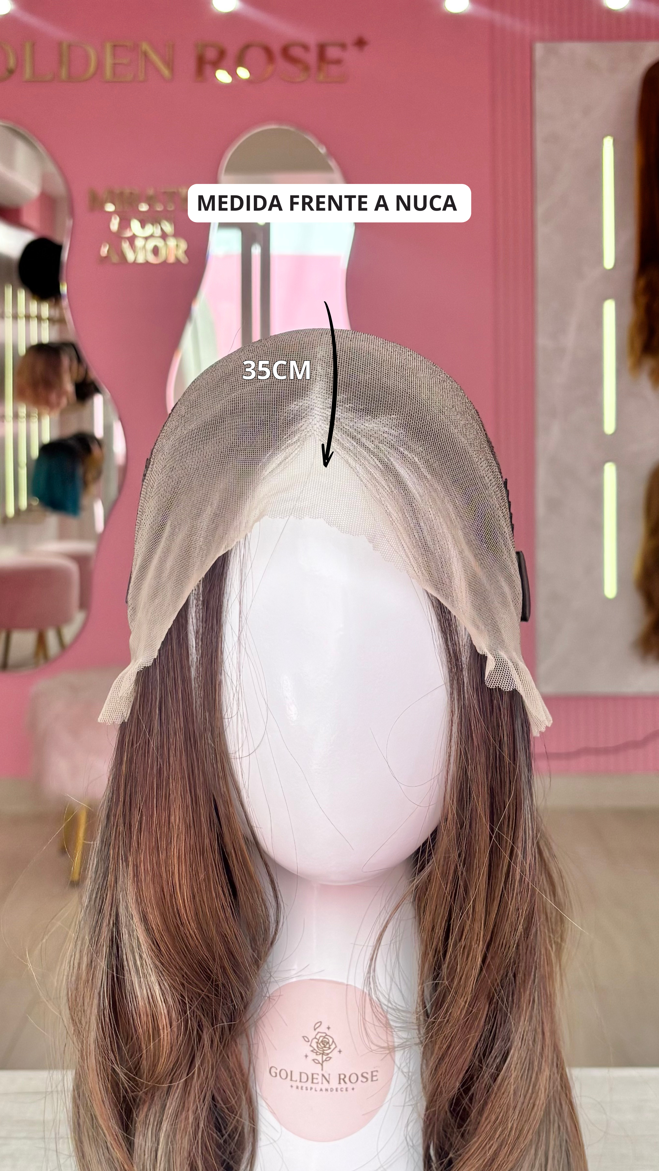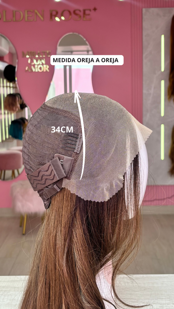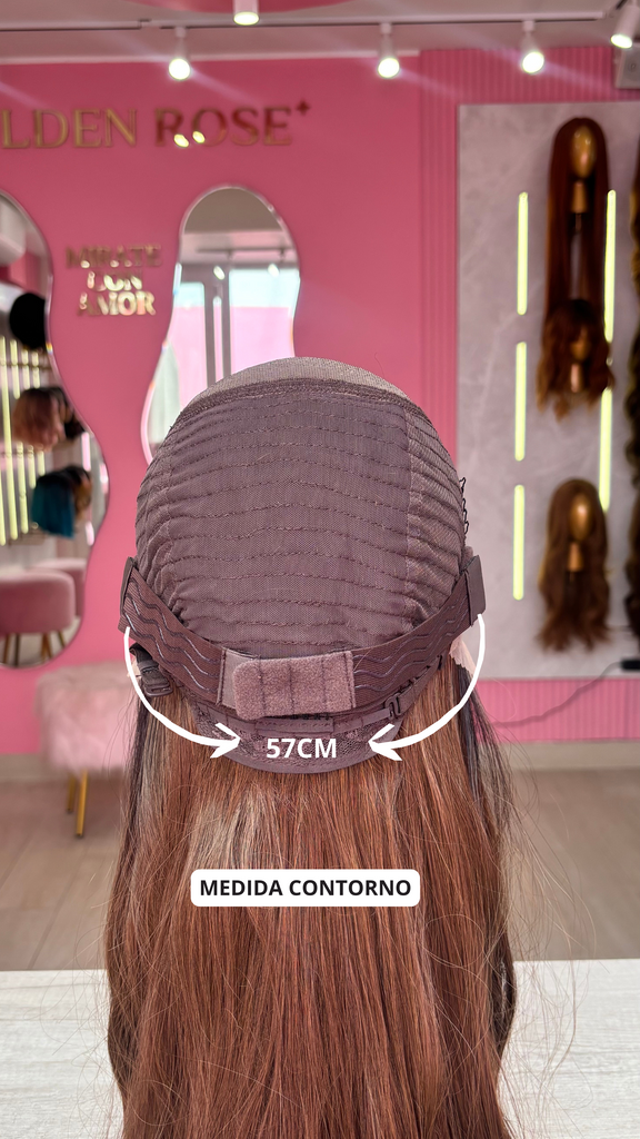 La peluca Cayetana es un producto de nuestra línea "Golden" con gorro de costura lace front raíz movible. Este producto cuenta con un regulador de contorno para ajustar el tamaño de la peluca si la persona lo requiere, además de 3 peinetas internas para asegurar mejor el cabello (en caso se tenga). El cabello empleado para este postizo es del material modacrílico (un tipo de fibra acrílica). Esta fibra es resistente al agua y al calor, no tiene brillo como el cabello de muñeca, sino que se asemeja a un cabello natural. Asimismo, es suave y manejable, se puede alisar, ondular y lavar. Se recomienda su uso para ocasiones esporádicas con la finalidad de alargar su tiempo de vida.