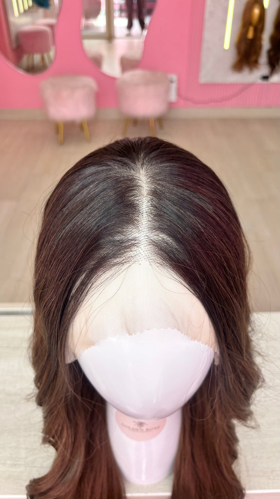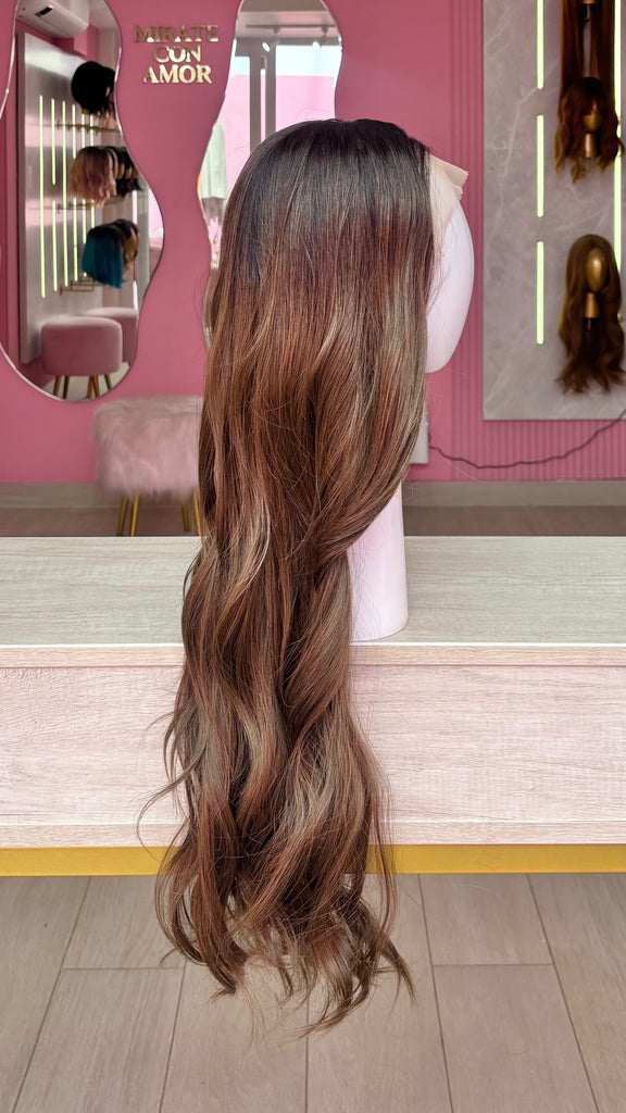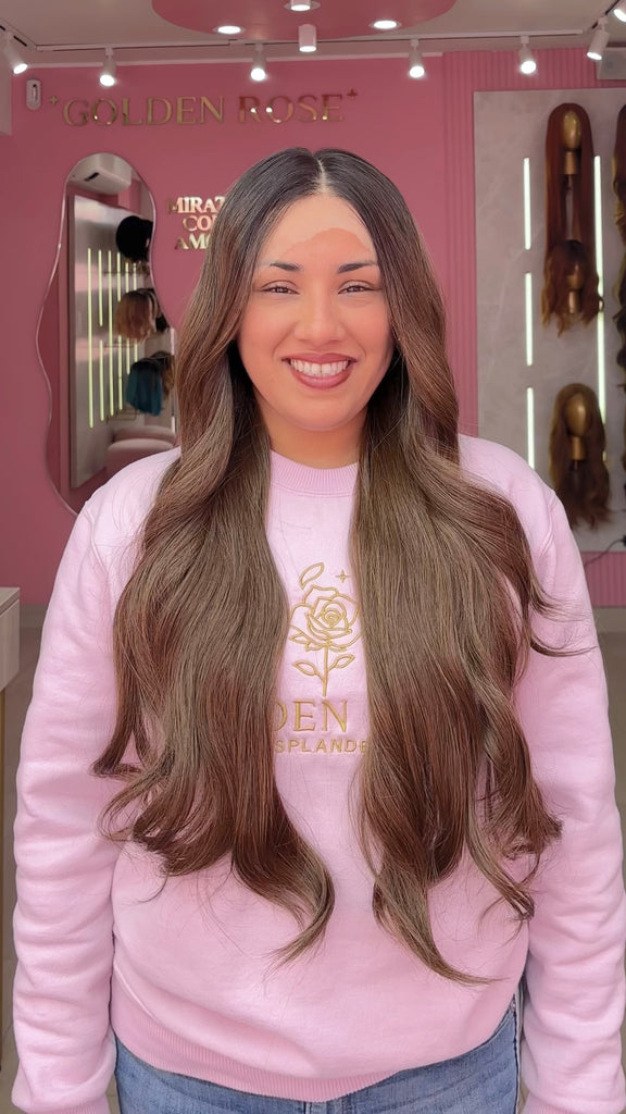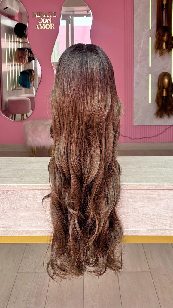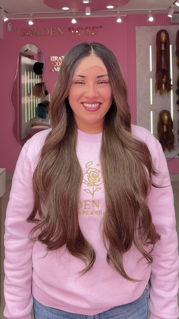 La peluca Cayetana es un producto de nuestra línea "Golden" con gorro de costura lace front raíz movible. Este producto cuenta con un regulador de contorno para ajustar el tamaño de la peluca si la persona lo requiere, además de 3 peinetas internas para asegurar mejor el cabello (en caso se tenga). El cabello empleado para este postizo es del material modacrílico (un tipo de fibra acrílica). Esta fibra es resistente al agua y al calor, no tiene brillo como el cabello de muñeca, sino que se asemeja a un cabello natural. Asimismo, es suave y manejable, se puede alisar, ondular y lavar. Se recomienda su uso para ocasiones esporádicas con la finalidad de alargar su tiempo de vida.