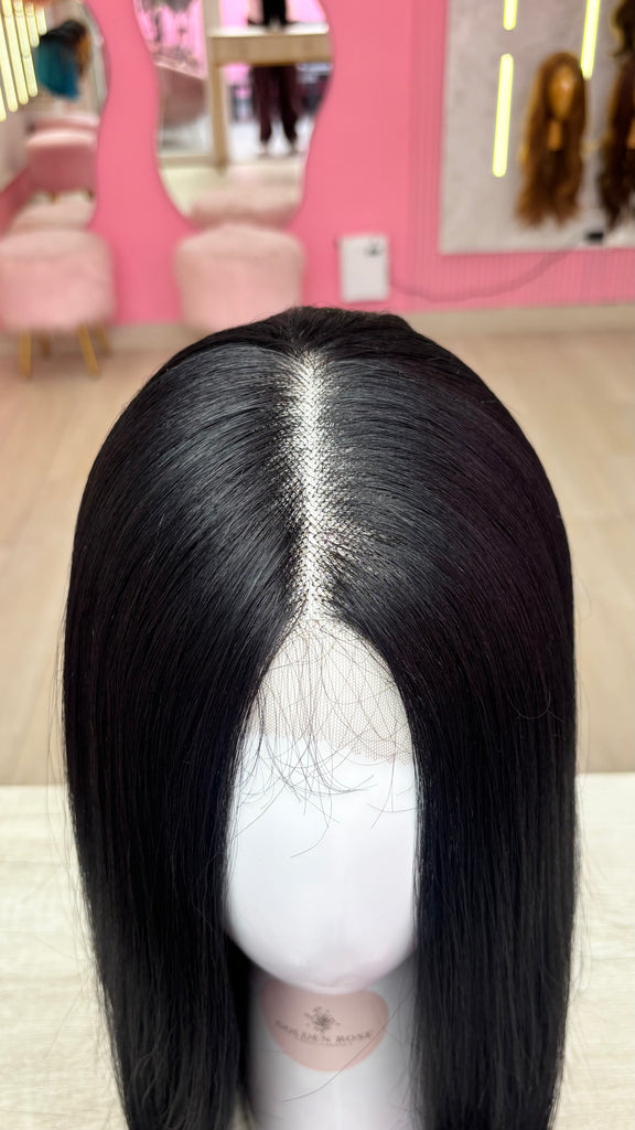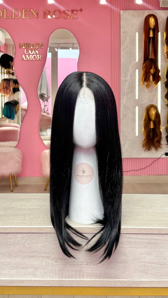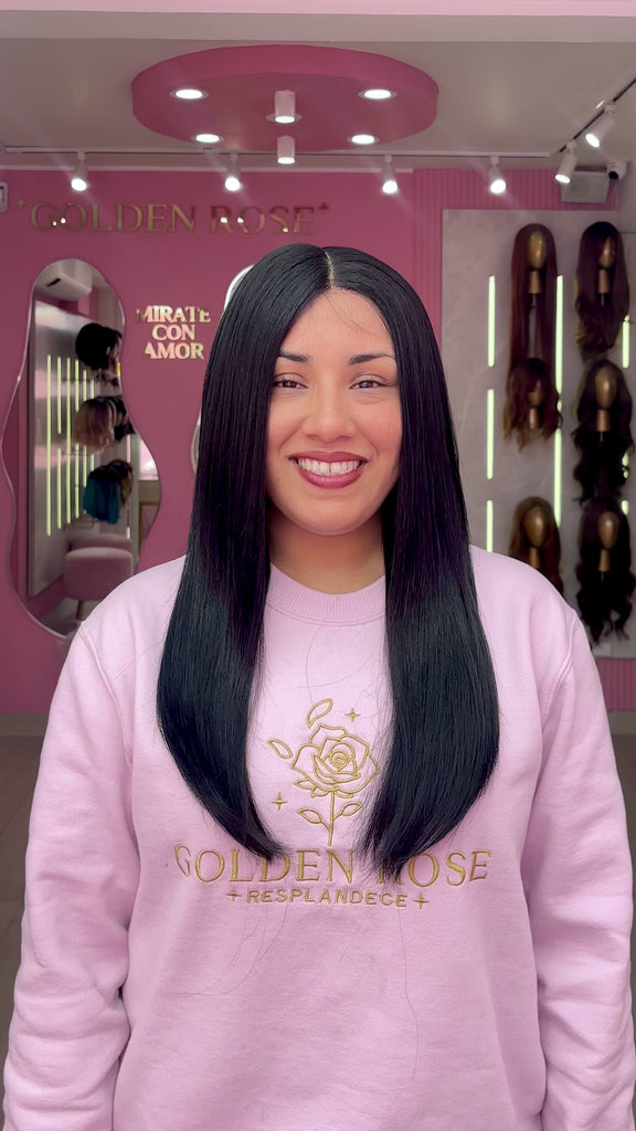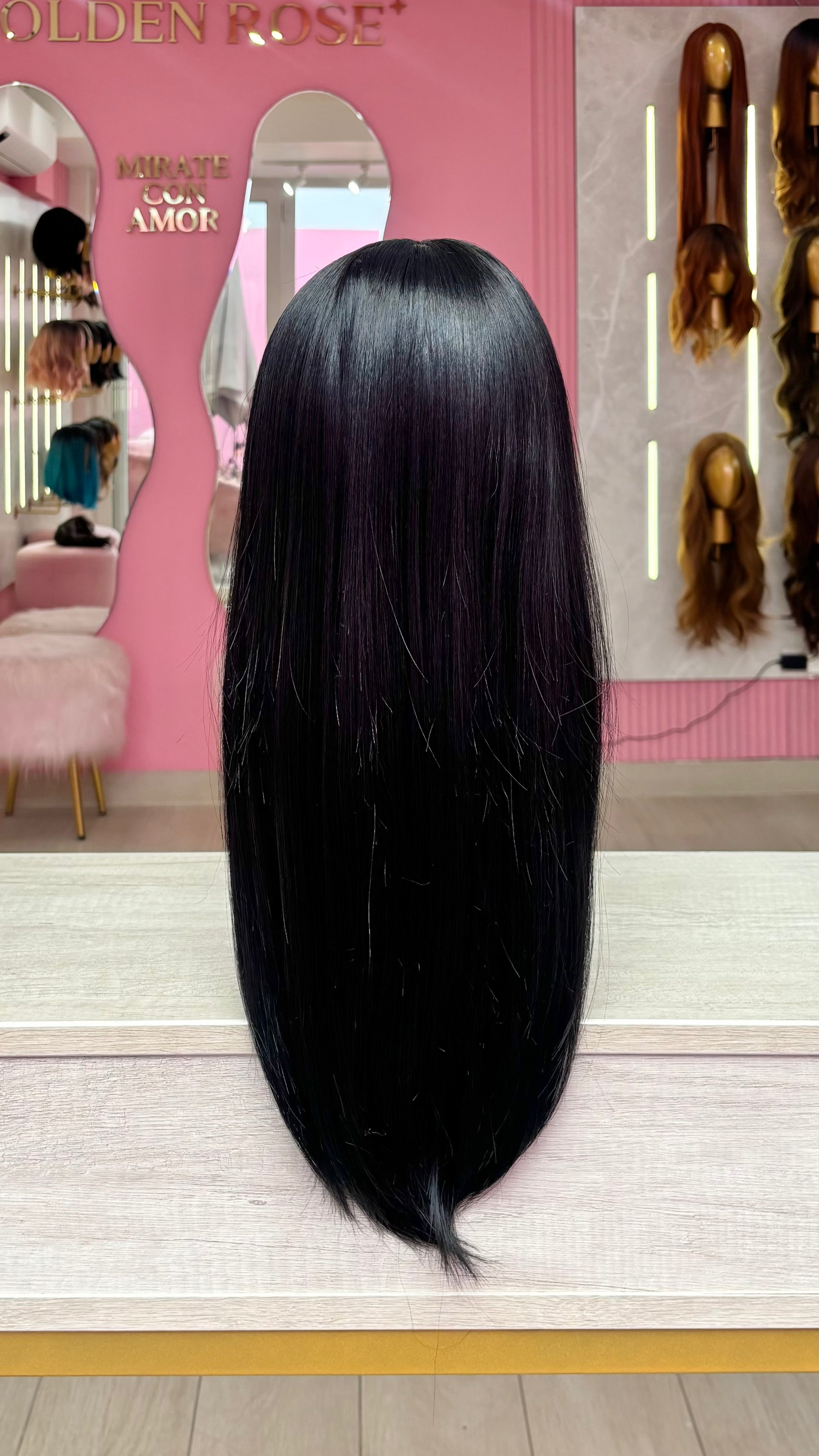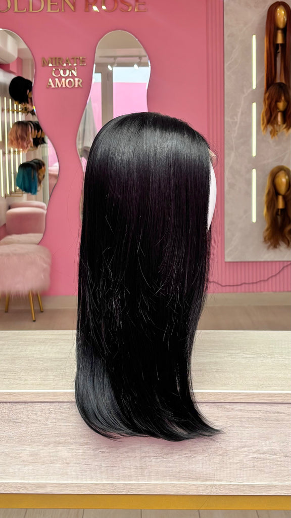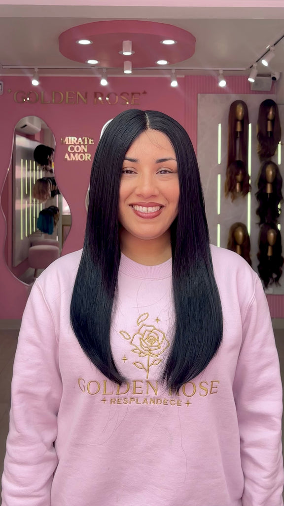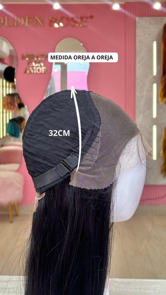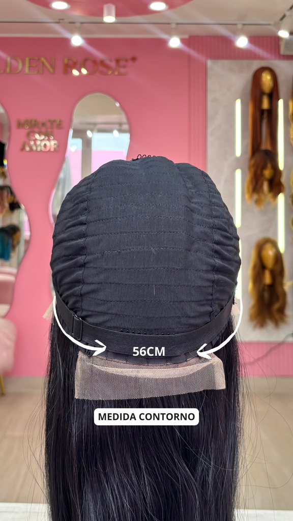 La peluca Dessire es un producto de nuestra línea "Golden" con gorro de costura lace front raíz movible. Este producto cuenta con un regulador de contorno para ajustar el tamaño de la peluca si la persona lo requiere, además de 3 peinetas internas para asegurar mejor el cabello (en caso se tenga). El cabello empleado para este postizo es del material modacrílico (un tipo de fibra acrílica). Esta fibra es resistente al agua y al calor, no tiene brillo como el cabello de muñeca, sino que se asemeja a un cabello natural. Asimismo, es suave y manejable, se puede alisar, ondular y lavar. Se recomienda su uso para ocasiones esporádicas con la finalidad de alargar su tiempo de vida.