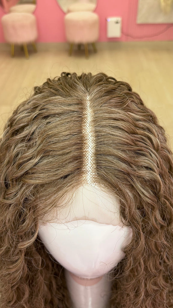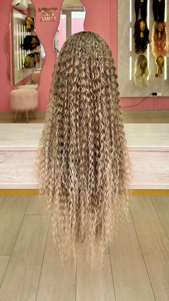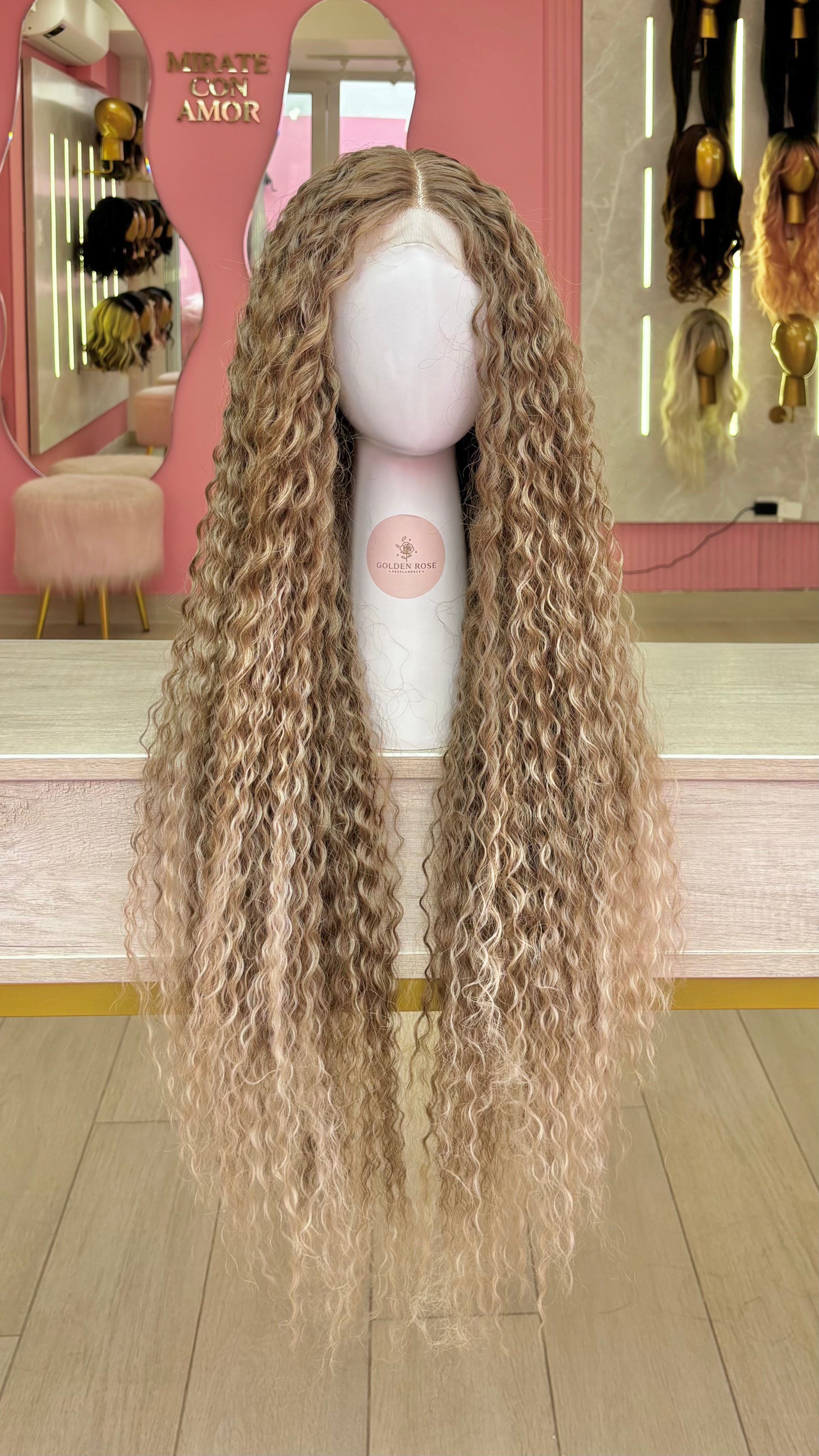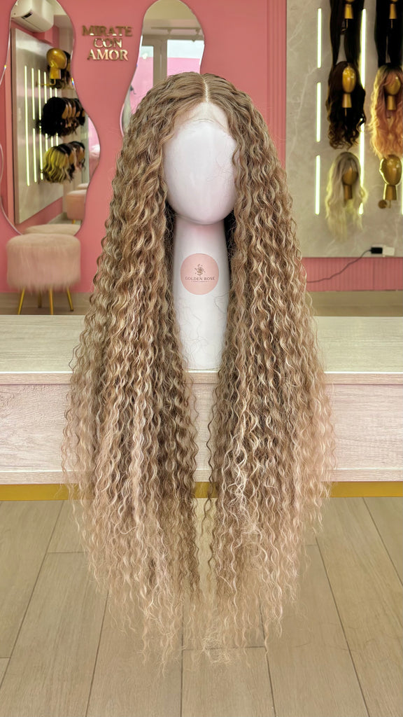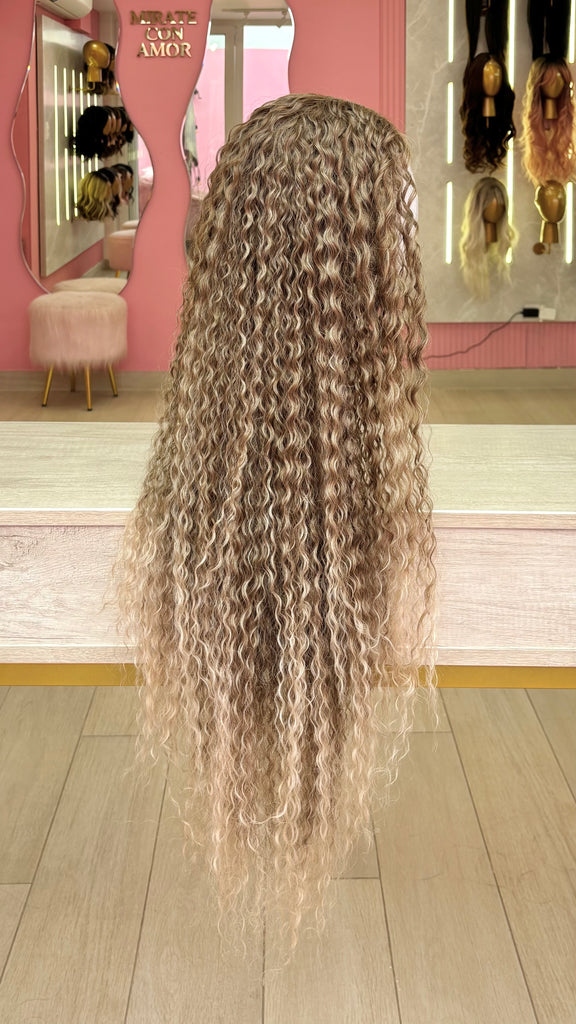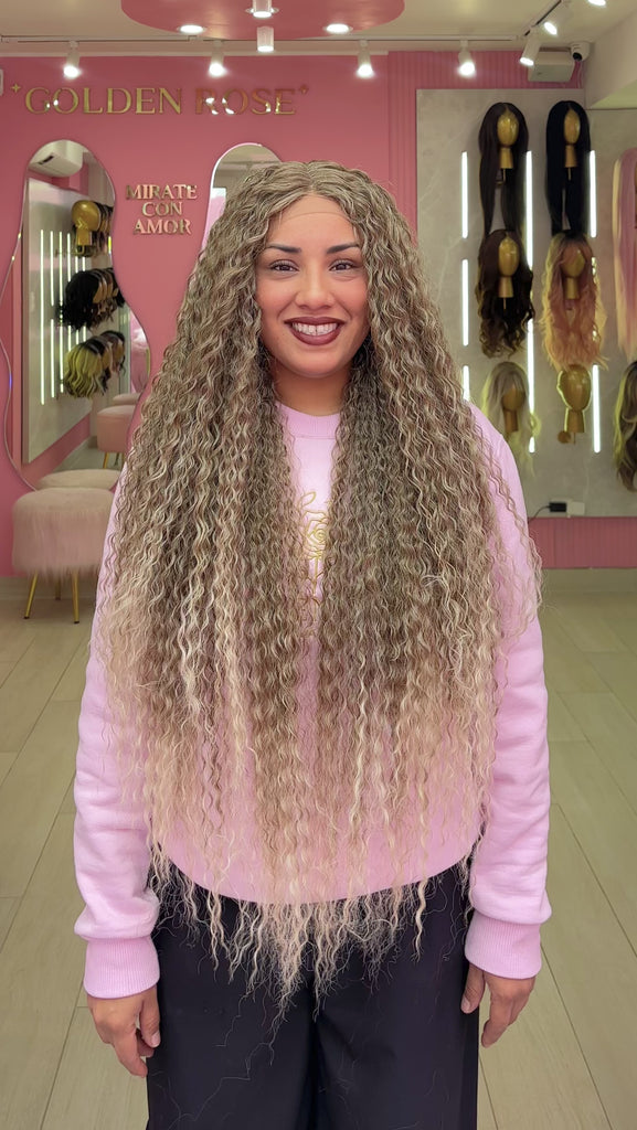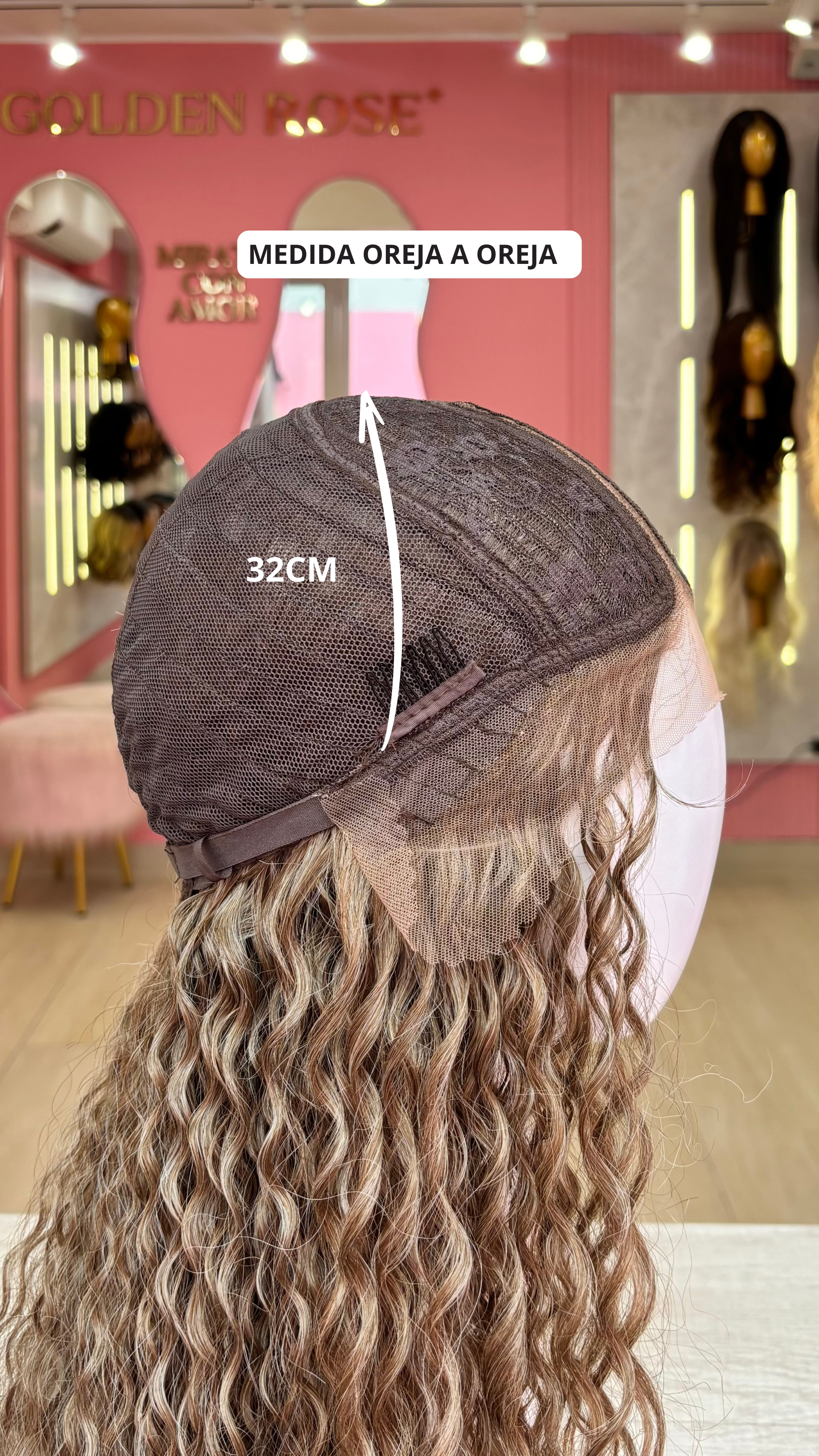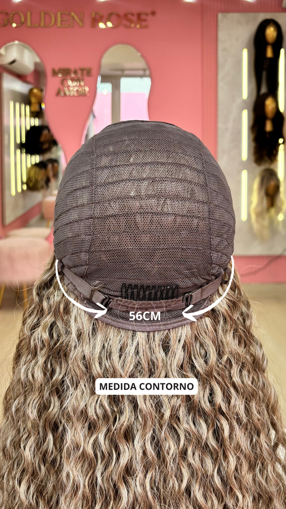 La peluca Gaby es un producto de nuestra línea "Golden" con gorro de costura lace front raíz fija. Este producto cuenta con un regulador de contorno para ajustar el tamaño de la peluca si la persona lo requiere, además de 3 peinetas internas para asegurar mejor el cabello (en caso se tenga). El cabello empleado para este postizo es del material modacrílico (un tipo de fibra acrílica). Esta fibra es resistente al agua y al calor, no tiene brillo como el cabello de muñeca, sino que se asemeja a un cabello natural. Asimismo, es suave y manejable, se puede alisar, ondular y lavar. Se recomienda su uso para ocasiones esporádicas con la finalidad de alargar su tiempo de vida.