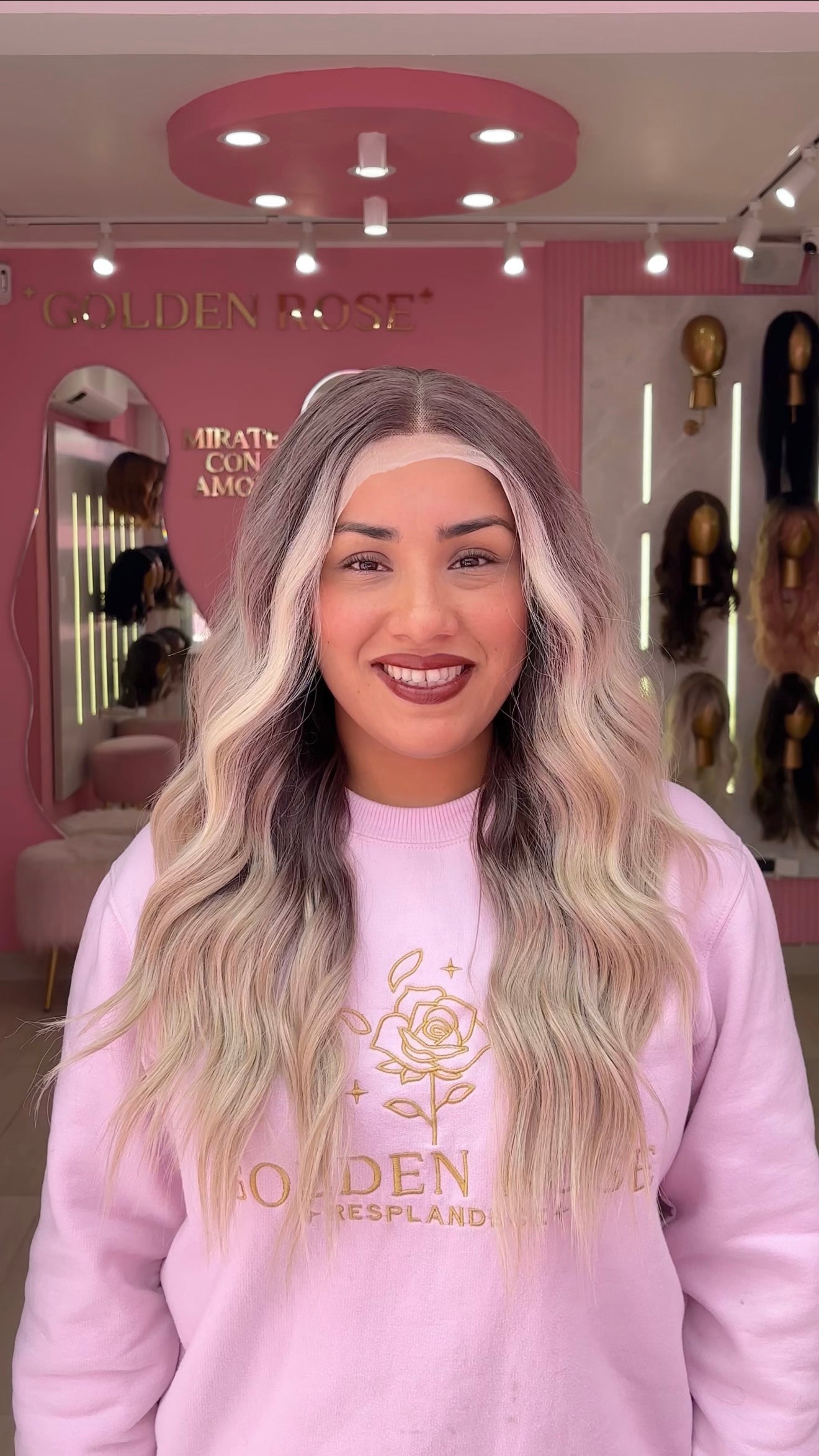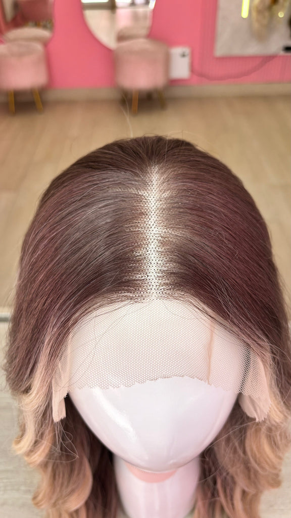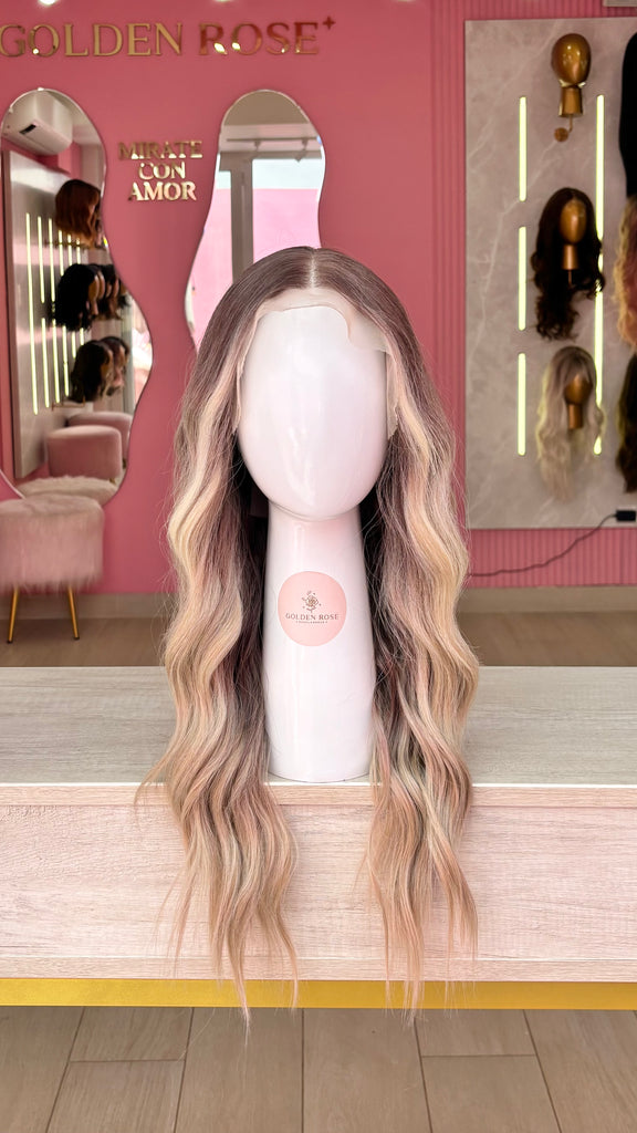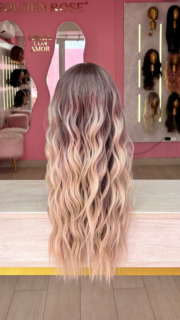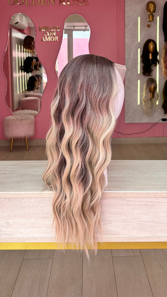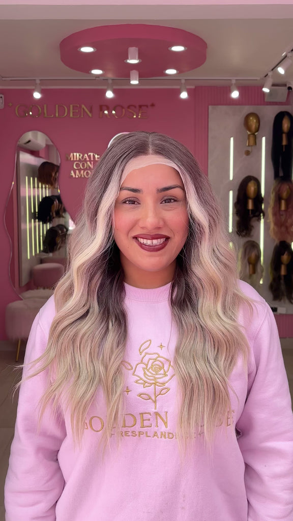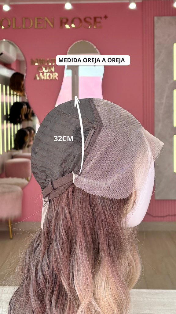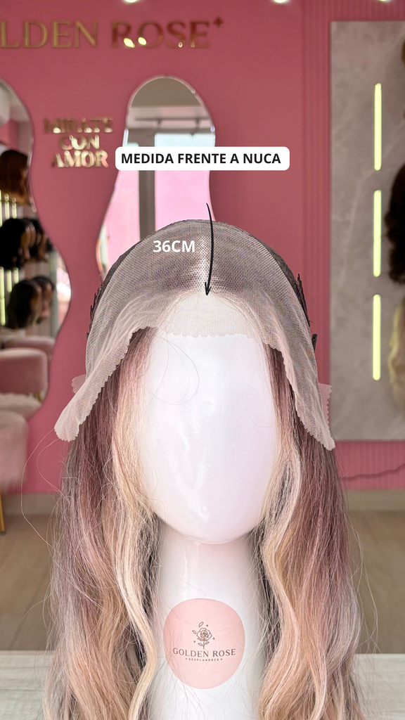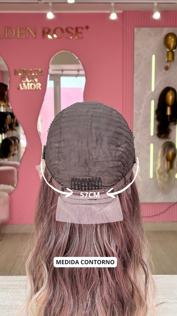 La peluca Maggie es un producto de nuestra línea "Golden" con gorro de costura lace front raíz movible. Este producto cuenta con un regulador de contorno para ajustar el tamaño de la peluca si la persona lo requiere, además de 3 peinetas internas para asegurar mejor el cabello (en caso se tenga). El cabello empleado para este postizo es del material modacrílico (un tipo de fibra acrílica). Esta fibra es resistente al agua y al calor, no tiene brillo como el cabello de muñeca, sino que se asemeja a un cabello natural. Asimismo, es suave y manejable, se puede alisar, ondular y lavar. Se recomienda su uso para ocasiones esporádicas con la finalidad de alargar su tiempo de vida.