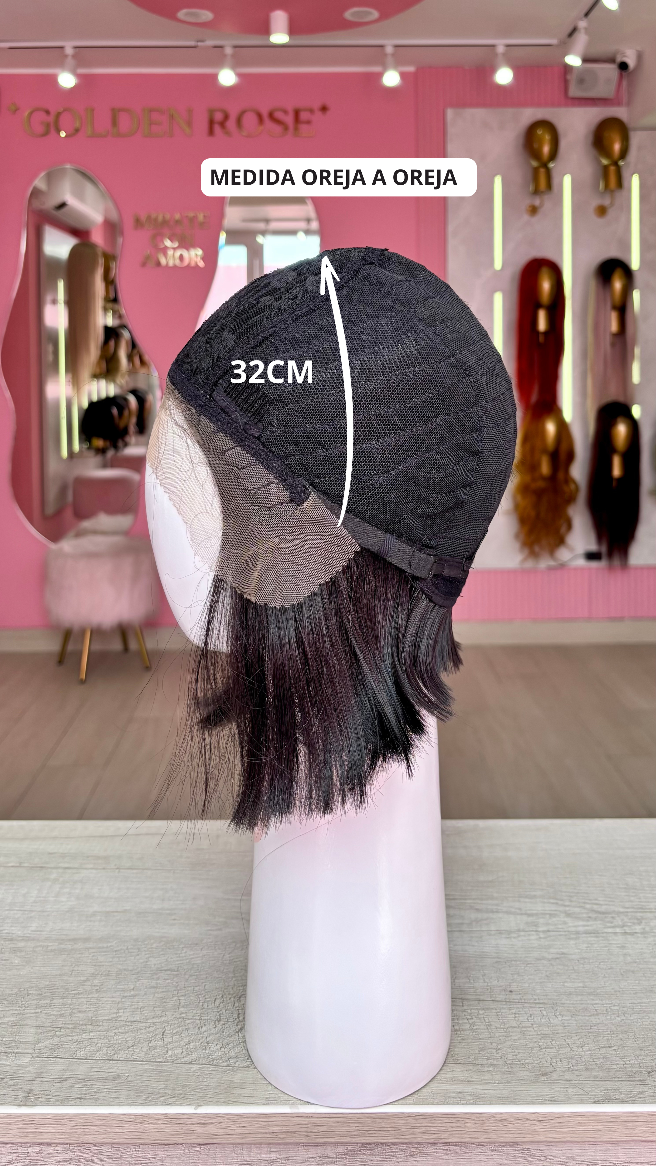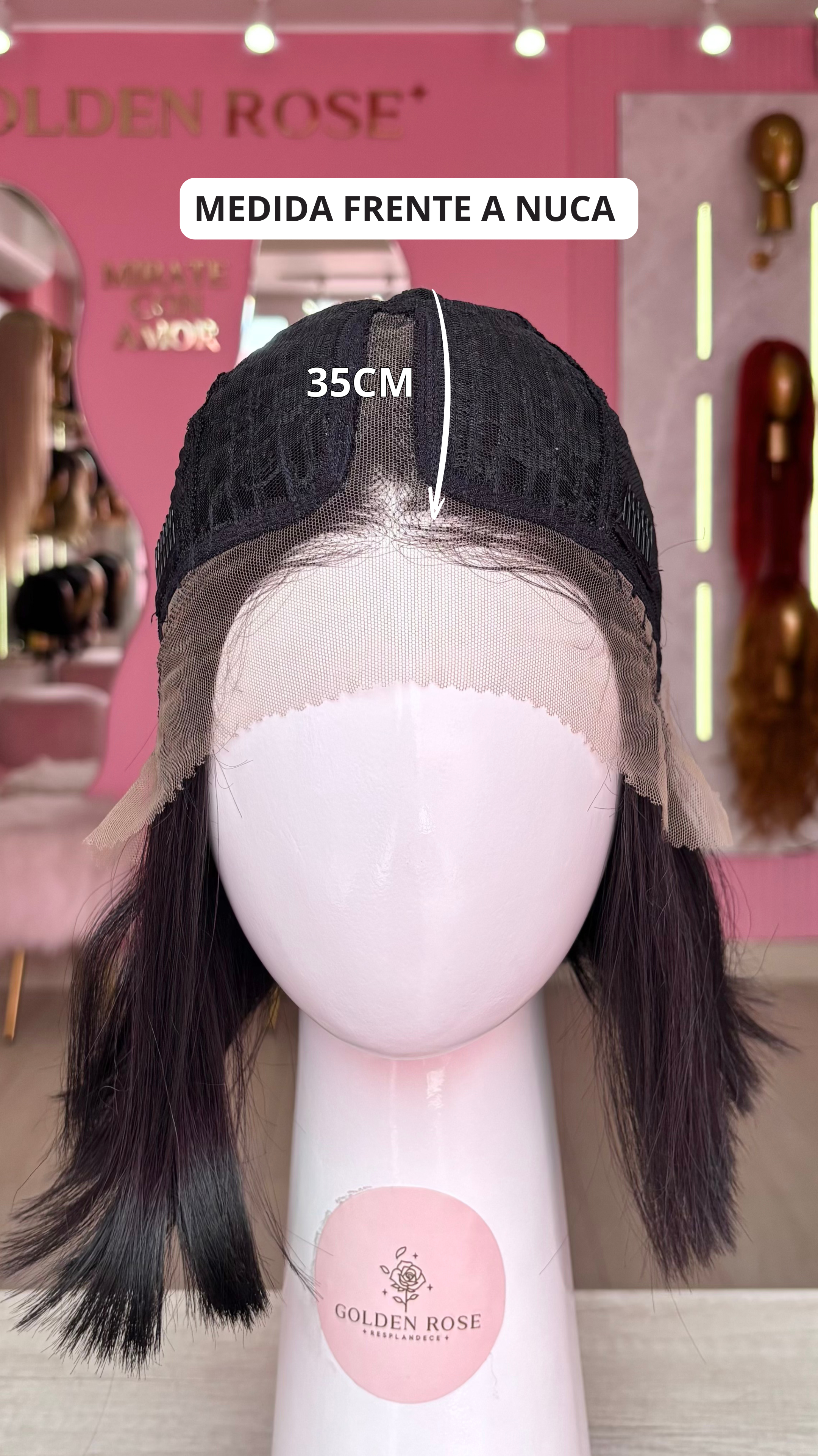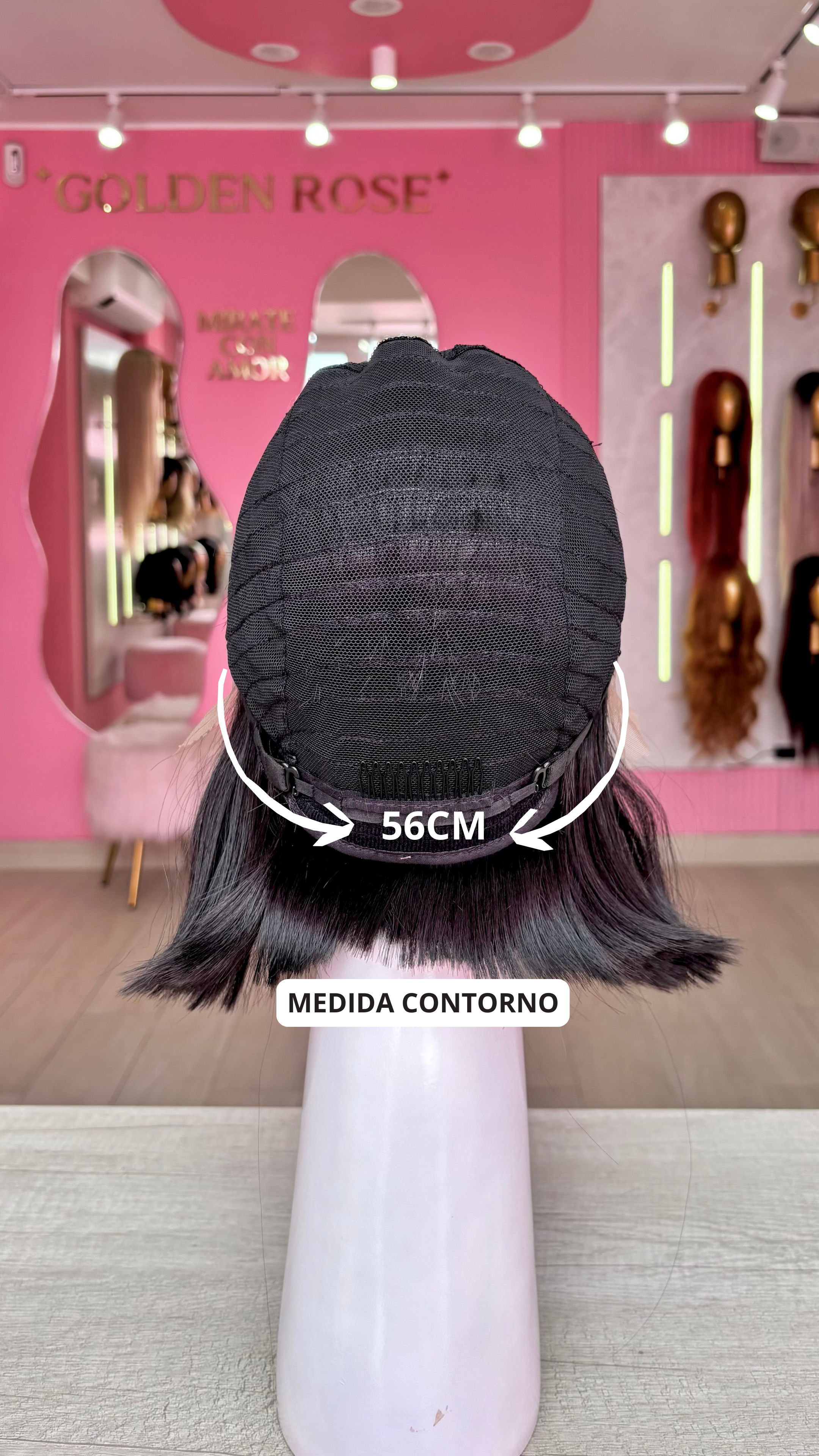 La peluca Mía es un producto de nuestra línea "Golden" con gorro de costura lace front raíz fija. Este producto cuenta con un regulador de contorno para ajustar el tamaño de la peluca si la persona lo requiere, además de 3 peinetas internas para asegurar mejor el cabello (en caso se tenga). El cabello empleado para este postizo es del material modacrílico (un tipo de fibra acrílica). Esta fibra es resistente al agua y al calor, no tiene brillo como el cabello de muñeca, sino que se asemeja a un cabello natural. Asimismo, es suave y manejable, se puede alisar, ondular y lavar. Se recomienda su uso para ocasiones esporádicas con la finalidad de alargar su tiempo de vida.