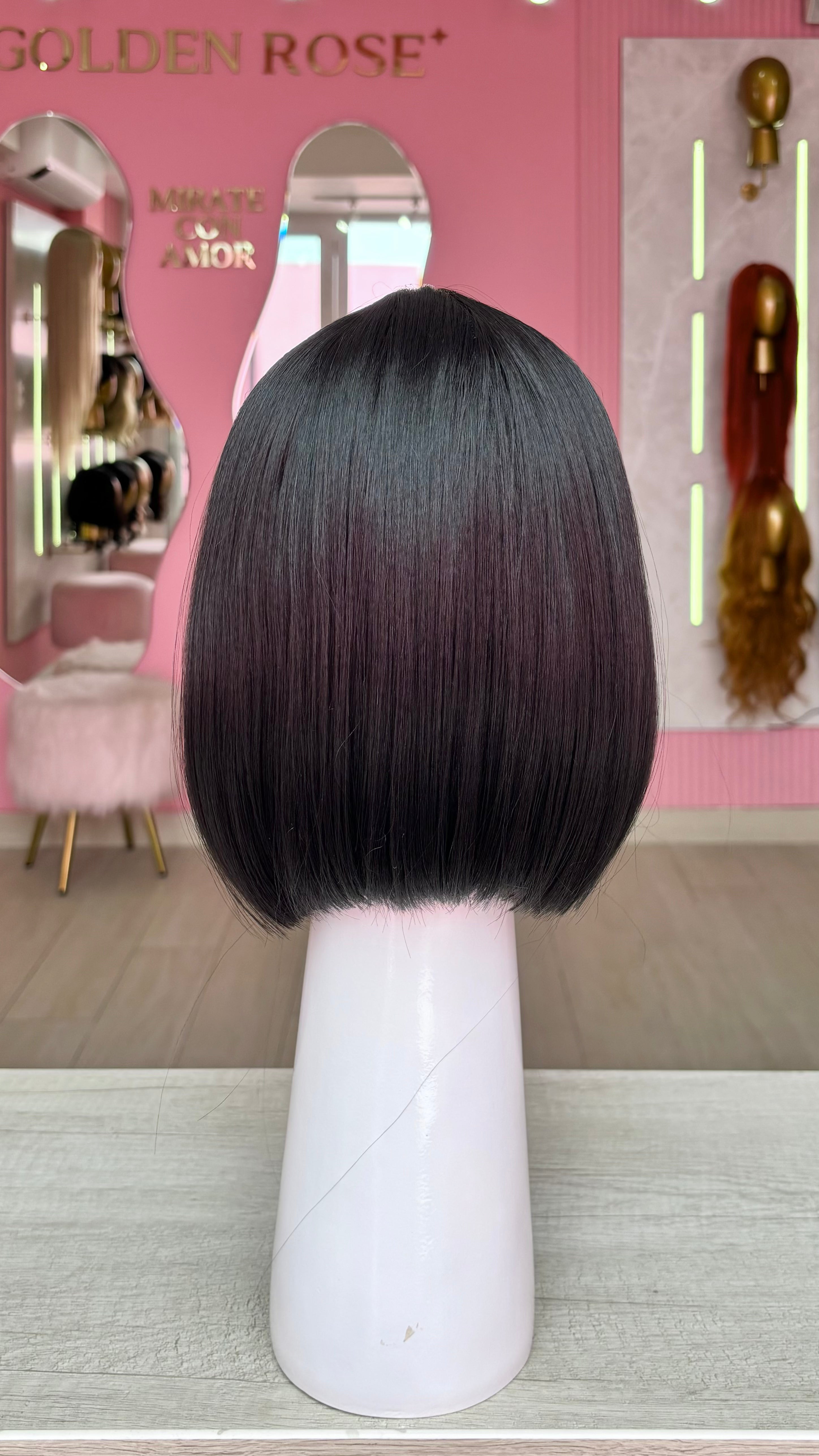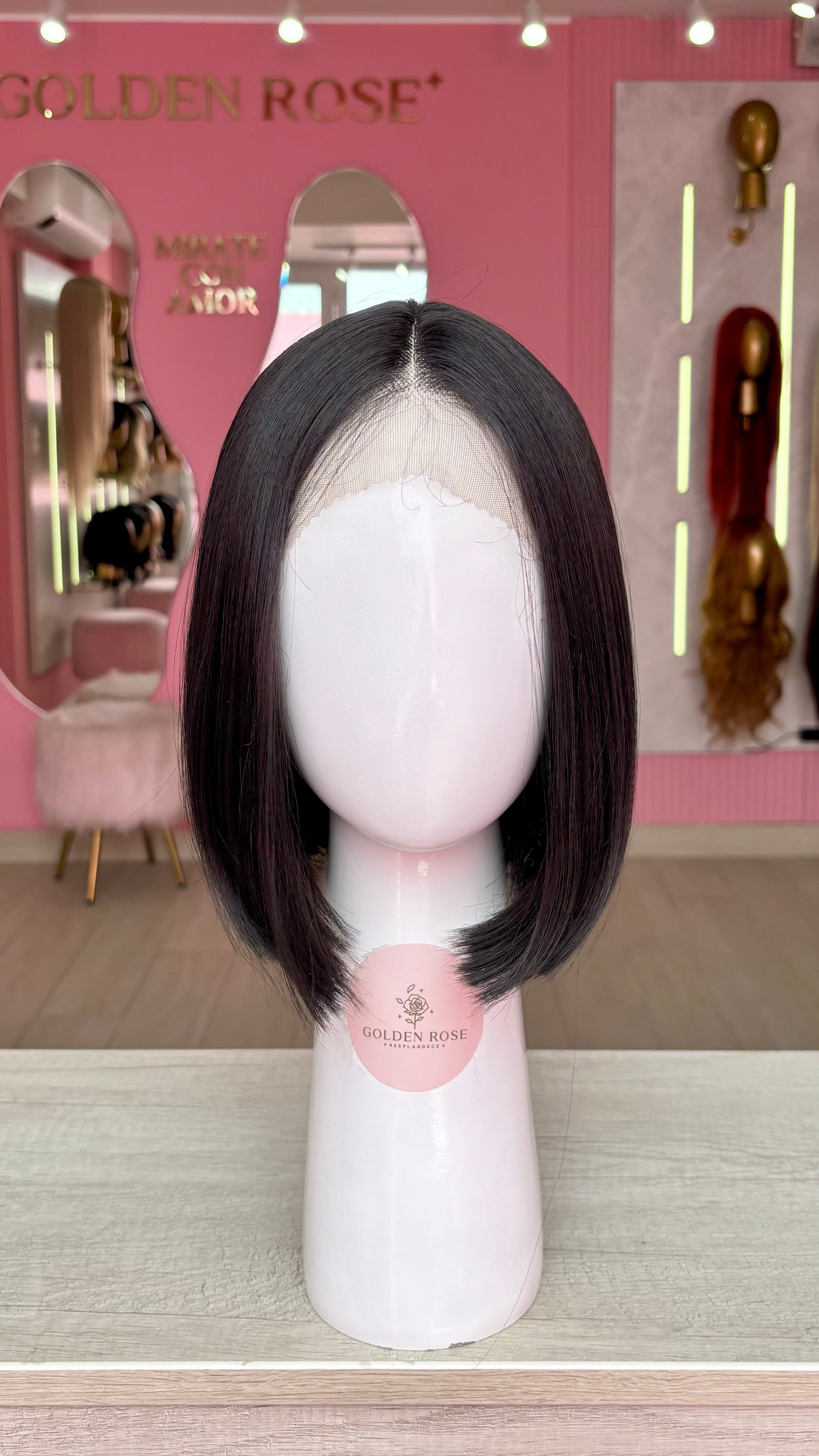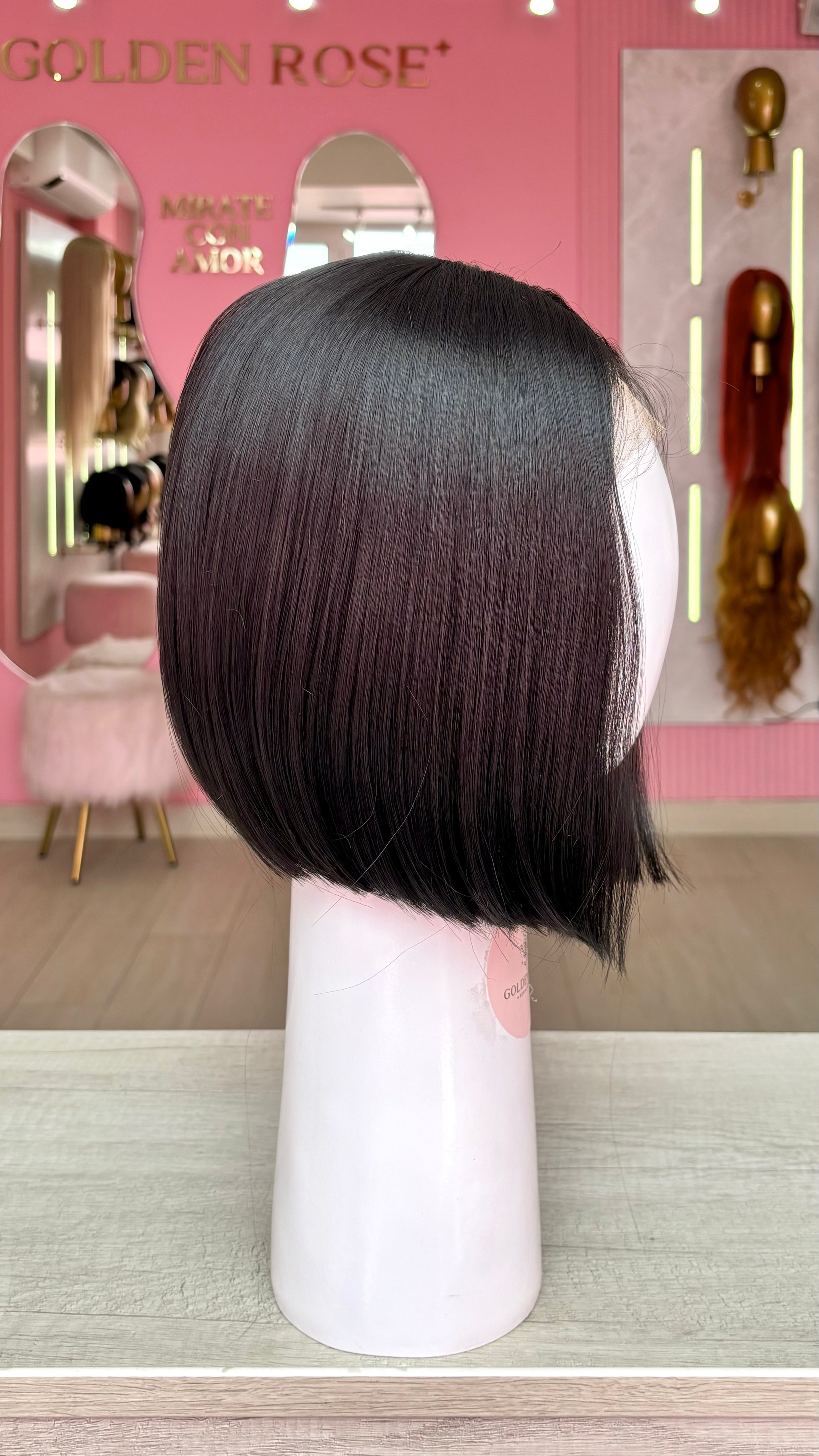 La peluca Mía es un producto de nuestra línea "Golden" con gorro de costura lace front raíz fija. Este producto cuenta con un regulador de contorno para ajustar el tamaño de la peluca si la persona lo requiere, además de 3 peinetas internas para asegurar mejor el cabello (en caso se tenga). El cabello empleado para este postizo es del material modacrílico (un tipo de fibra acrílica). Esta fibra es resistente al agua y al calor, no tiene brillo como el cabello de muñeca, sino que se asemeja a un cabello natural. Asimismo, es suave y manejable, se puede alisar, ondular y lavar. Se recomienda su uso para ocasiones esporádicas con la finalidad de alargar su tiempo de vida.