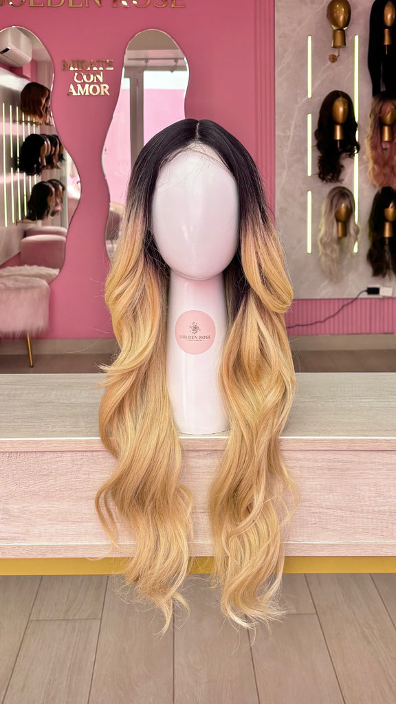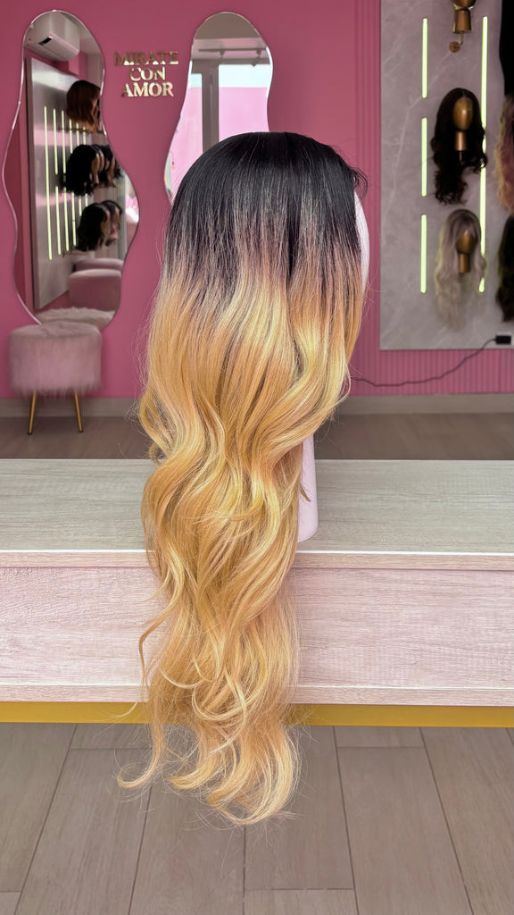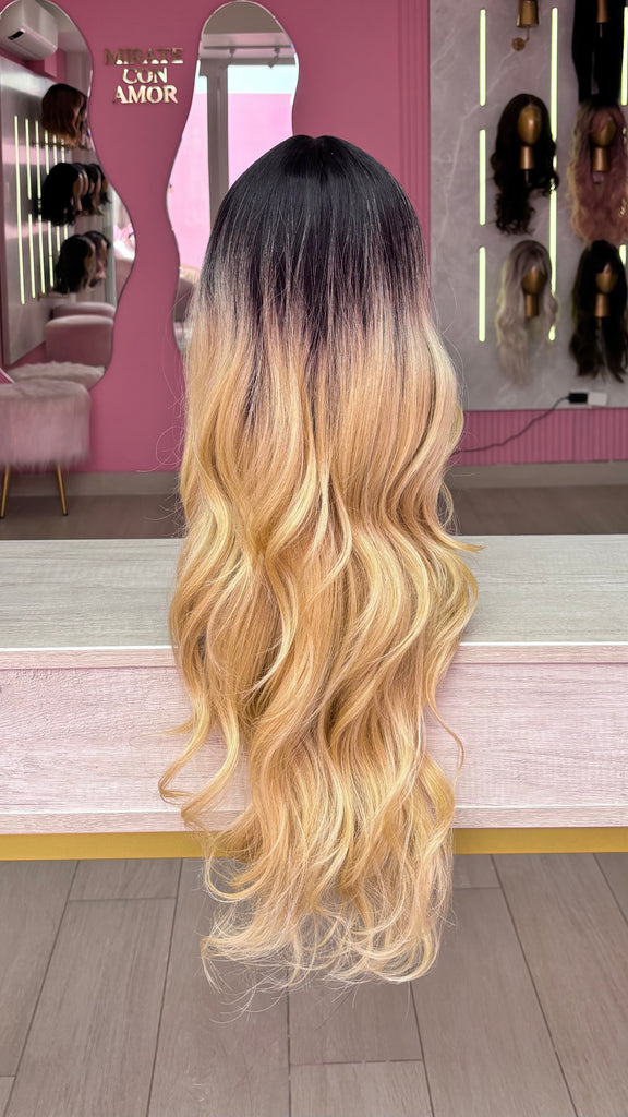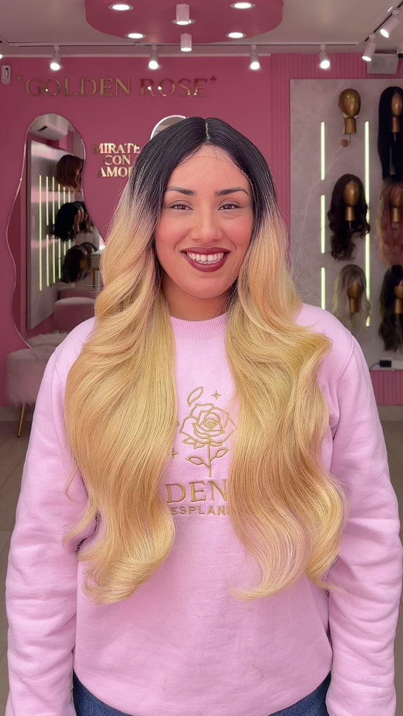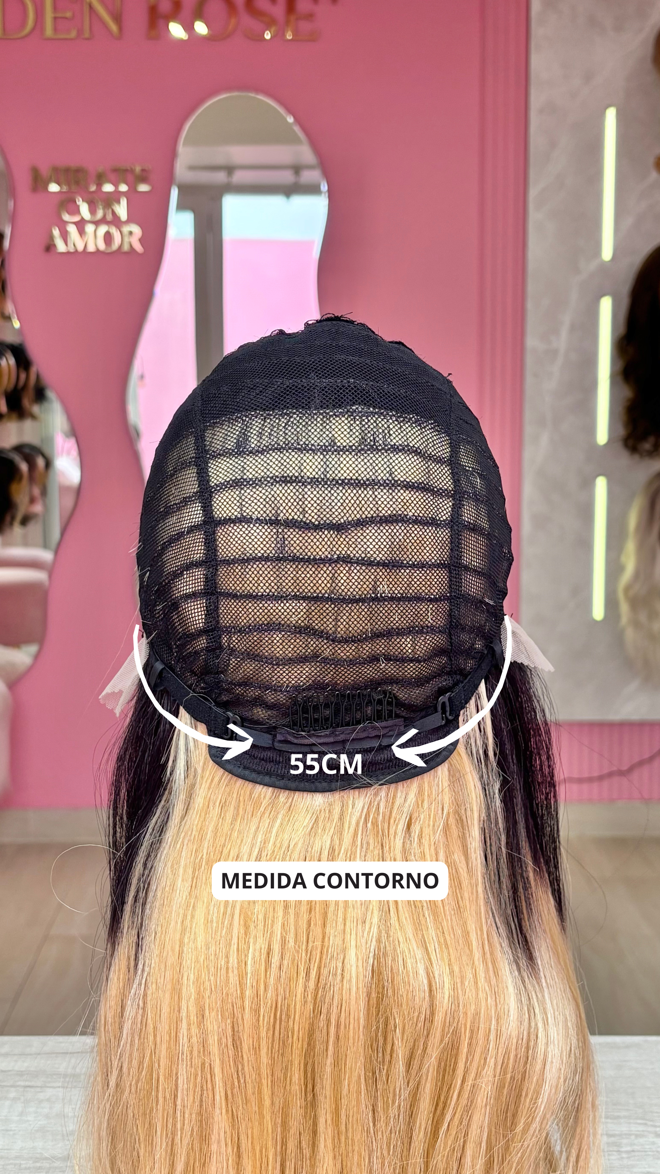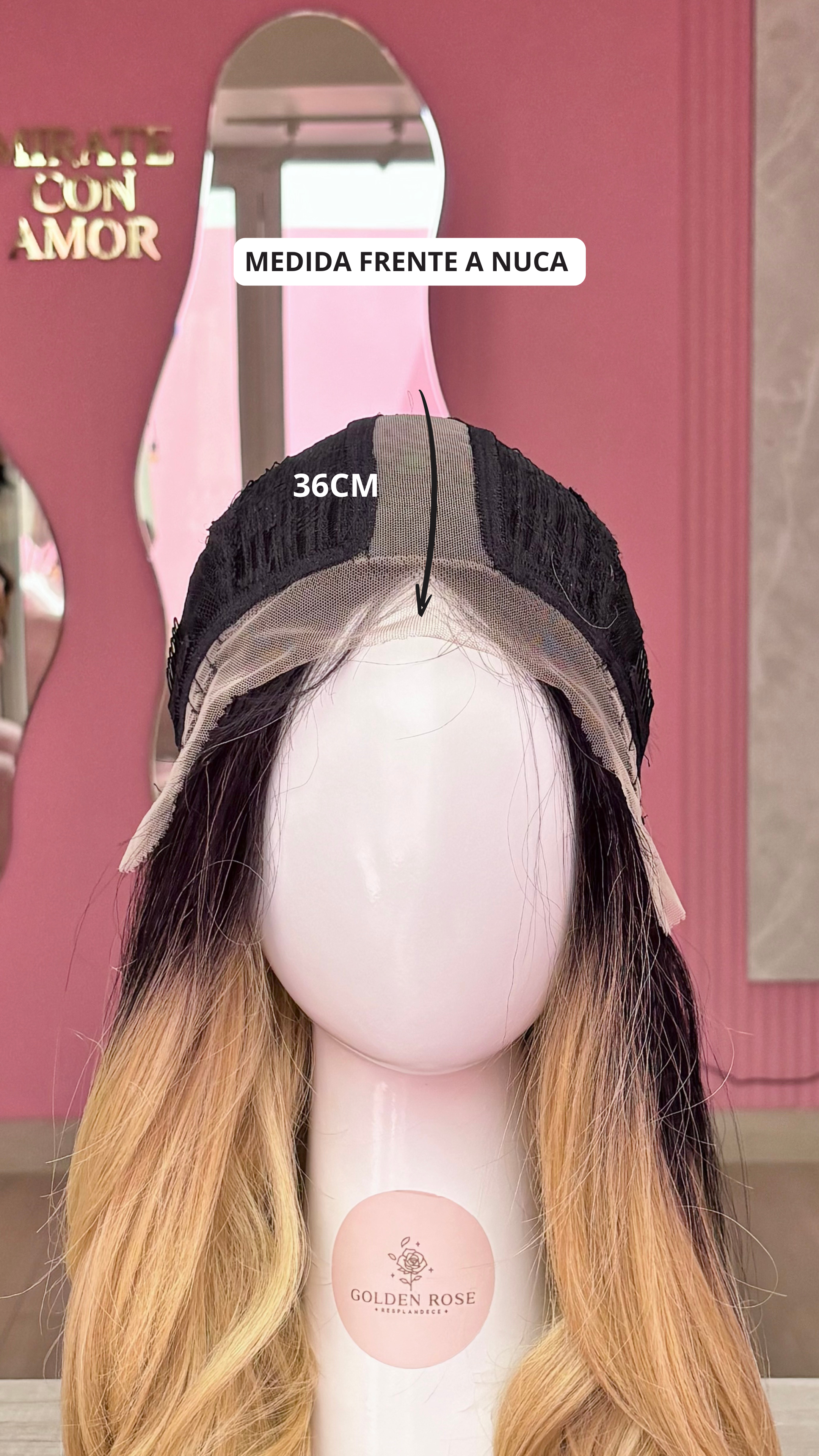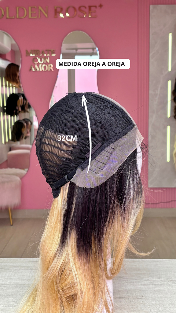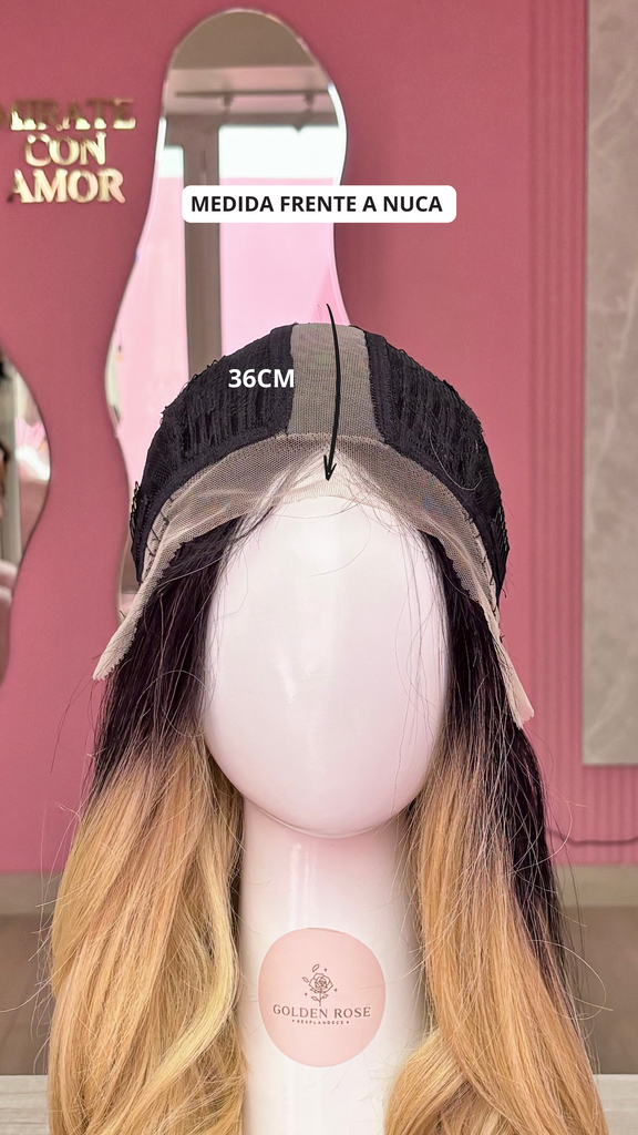La peluca Maricielo es un producto de nuestra línea "Golden" con gorro de costura lace front raíz fija. Este producto cuenta con un regulador de contorno para ajustar el tamaño de la peluca si la persona lo requiere, además de 3 peinetas internas para asegurar mejor el cabello (en caso se tenga). El cabello empleado para este postizo es del material modacrílico (un tipo de fibra acrílica). Esta fibra es resistente al agua y al calor, no tiene brillo como el cabello de muñeca, sino que se asemeja a un cabello natural. Asimismo, es suave y manejable, se puede alisar, ondular y lavar. Se recomienda su uso para ocasiones esporádicas con la finalidad de alargar su tiempo de vida.