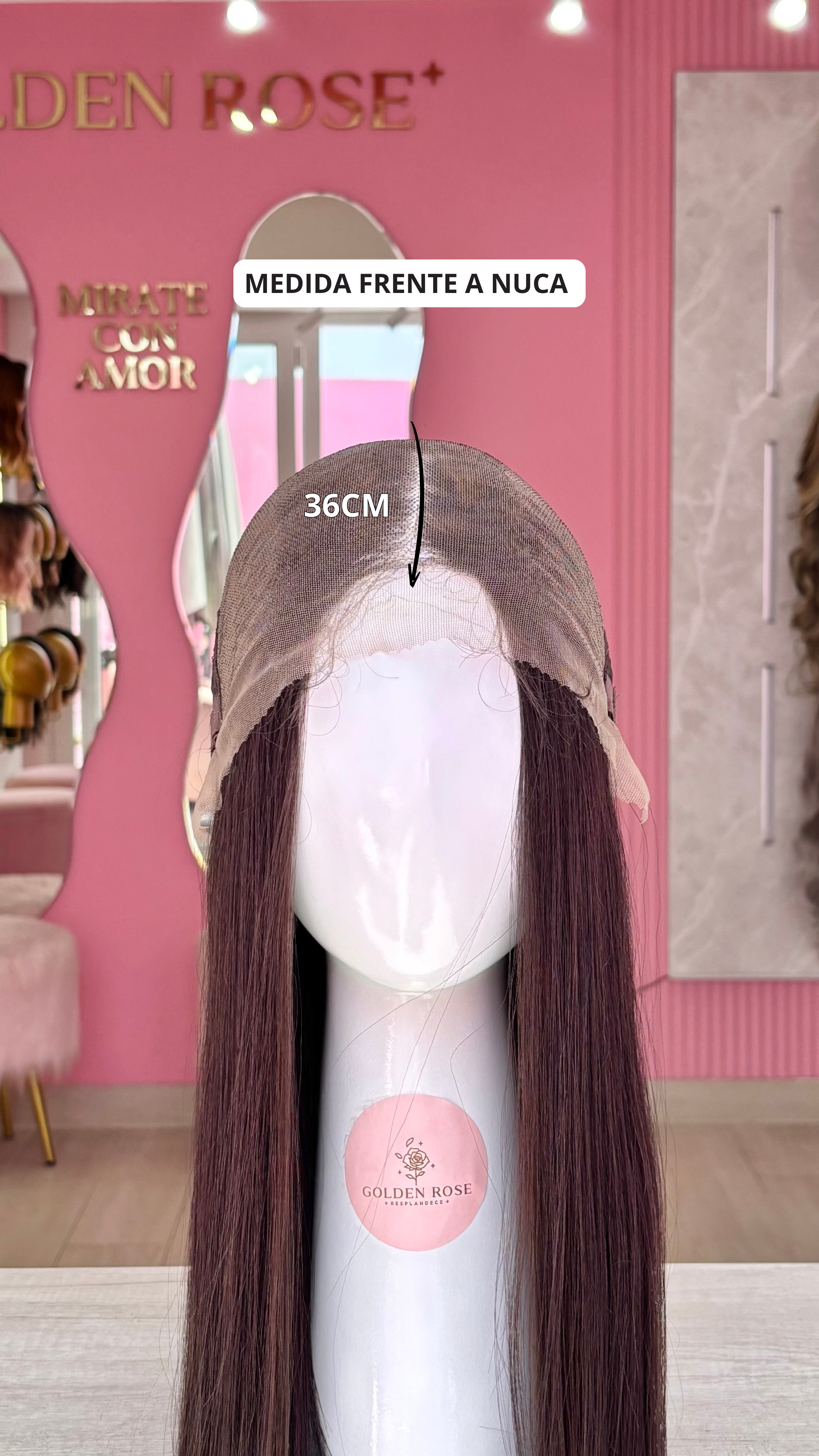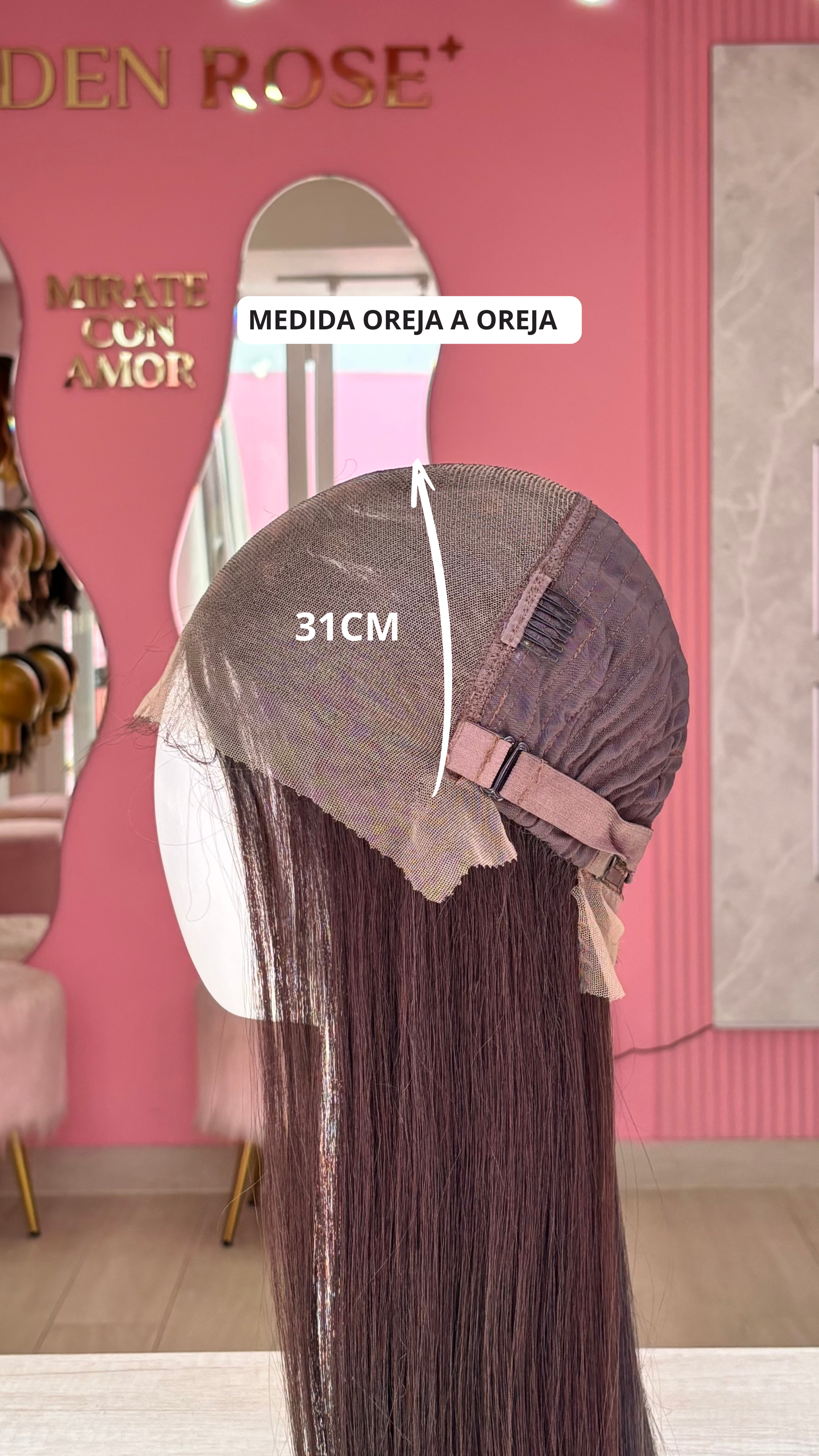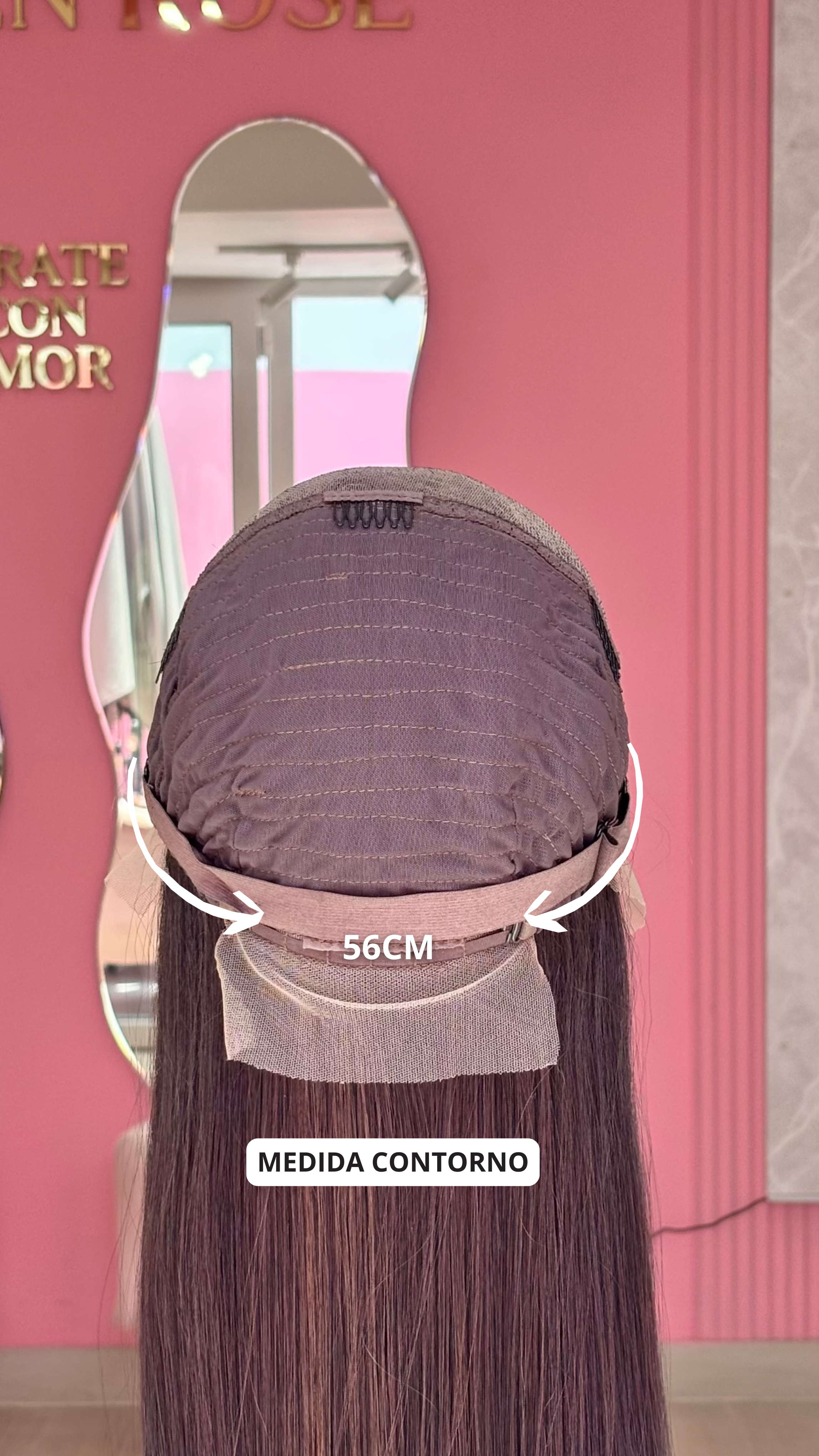La peluca Musa es un producto de nuestra línea "Golden" con gorro de costura lace front raíz movible. Este producto cuenta con un regulador de contorno para ajustar el tamaño de la peluca si la persona lo requiere, además de 3 peinetas internas para asegurar mejor el cabello (en caso se tenga). El cabello empleado para este postizo es del material modacrílico (un tipo de fibra acrílica). Esta fibra es resistente al agua y al calor, no tiene brillo como el cabello de muñeca, sino que se asemeja a un cabello natural. Asimismo, es suave y manejable, se puede alisar, ondular y lavar. Se recomienda su uso para ocasiones esporádicas con la finalidad de alargar su tiempo de vida.