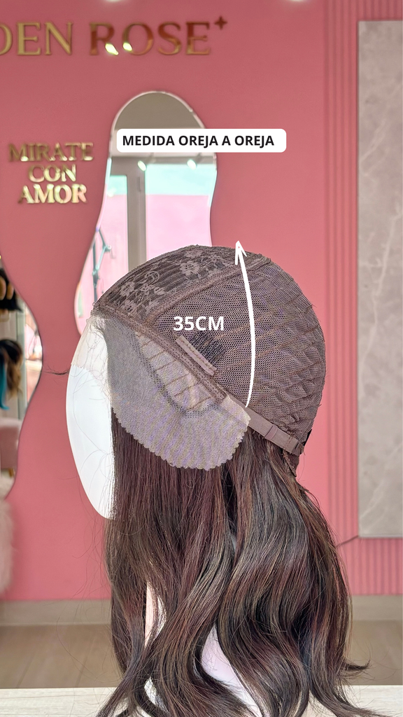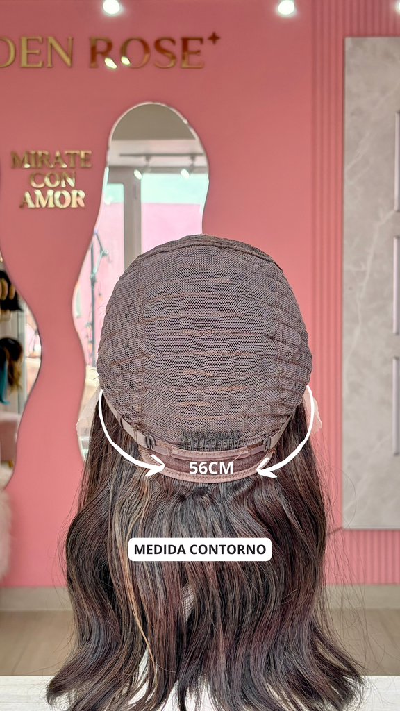 La peluca Marissa es un producto de nuestra línea "Golden" con gorro de costura lace front raíz fija. Este producto cuenta con un regulador de contorno para ajustar el tamaño de la peluca si la persona lo requiere, además de 3 peinetas internas para asegurar mejor el cabello (en caso se tenga). El cabello empleado para este postizo es del material modacrílico (un tipo de fibra acrílica). Esta fibra es resistente al agua y al calor, no tiene brillo como el cabello de muñeca, sino que se asemeja a un cabello natural. Asimismo, es suave y manejable, se puede alisar, ondular y lavar. Se recomienda su uso para ocasiones esporádicas con la finalidad de alargar su tiempo de vida.