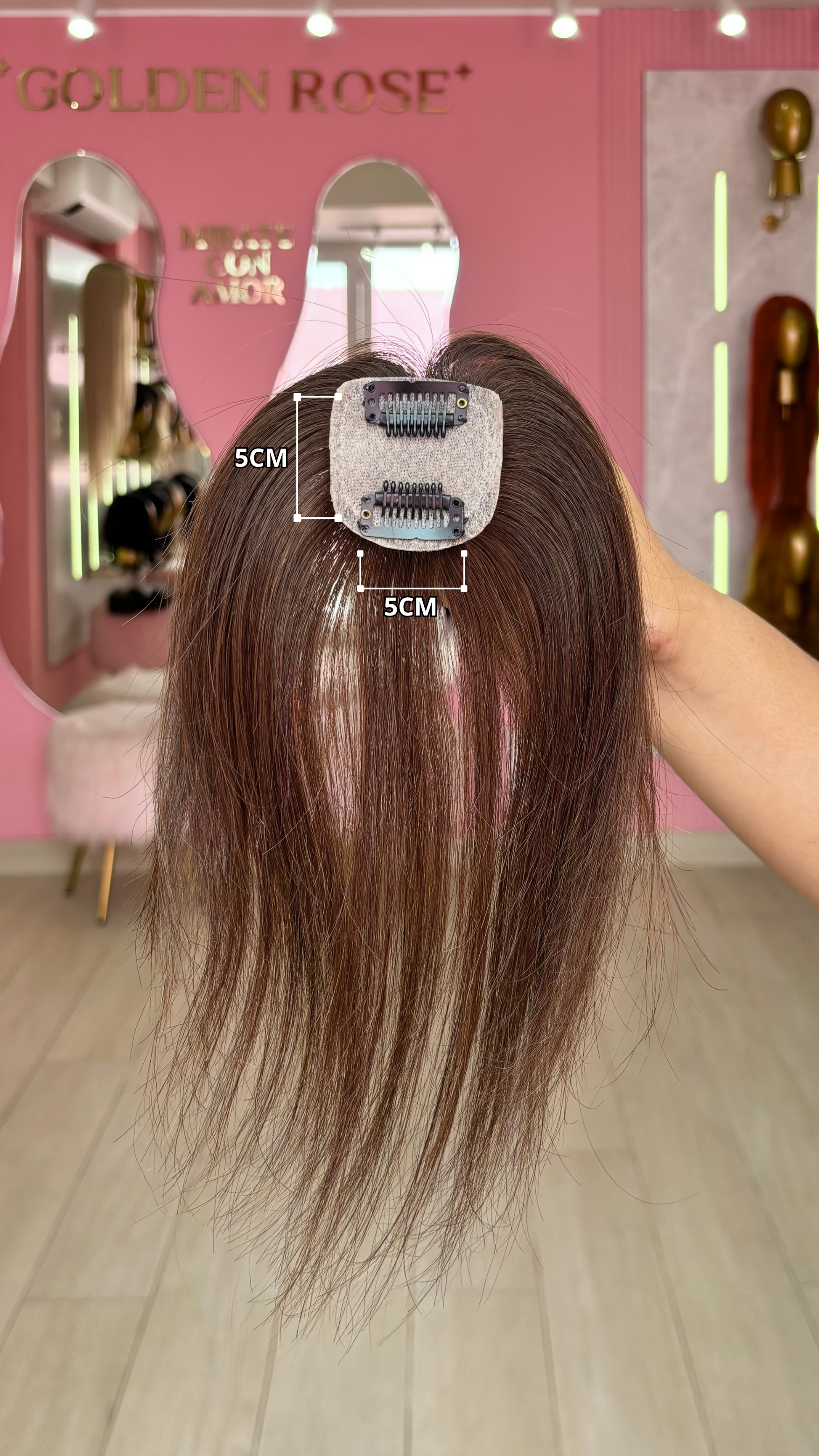 El Minitopper Iris es un producto de nuestra línea "Platinum", con raíz movible cuero cabelludo. El cabello empleado para este postizo es 100% humano; por lo cual, es apto para uso diario. El cabello es suave y manejable; además se puede alisar, ondular, lavar y teñir de tonos más oscuros del que viene de fábrica. Si desea que el cabello se vea liso, puede hacerle un cepillado con secadora y peine redondo. Se aconseja usar un protector de calor cuando se va emplear tenaza o plancha o secador con aire caliente.